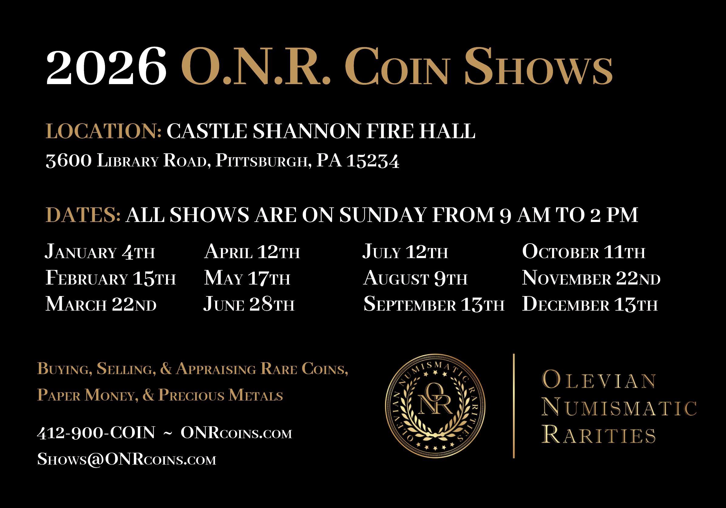 ONR attends numerous national coin shows every year. We also run a monthly show in the Greater Pittsburgh community. Please see our upcoming show attendance below.