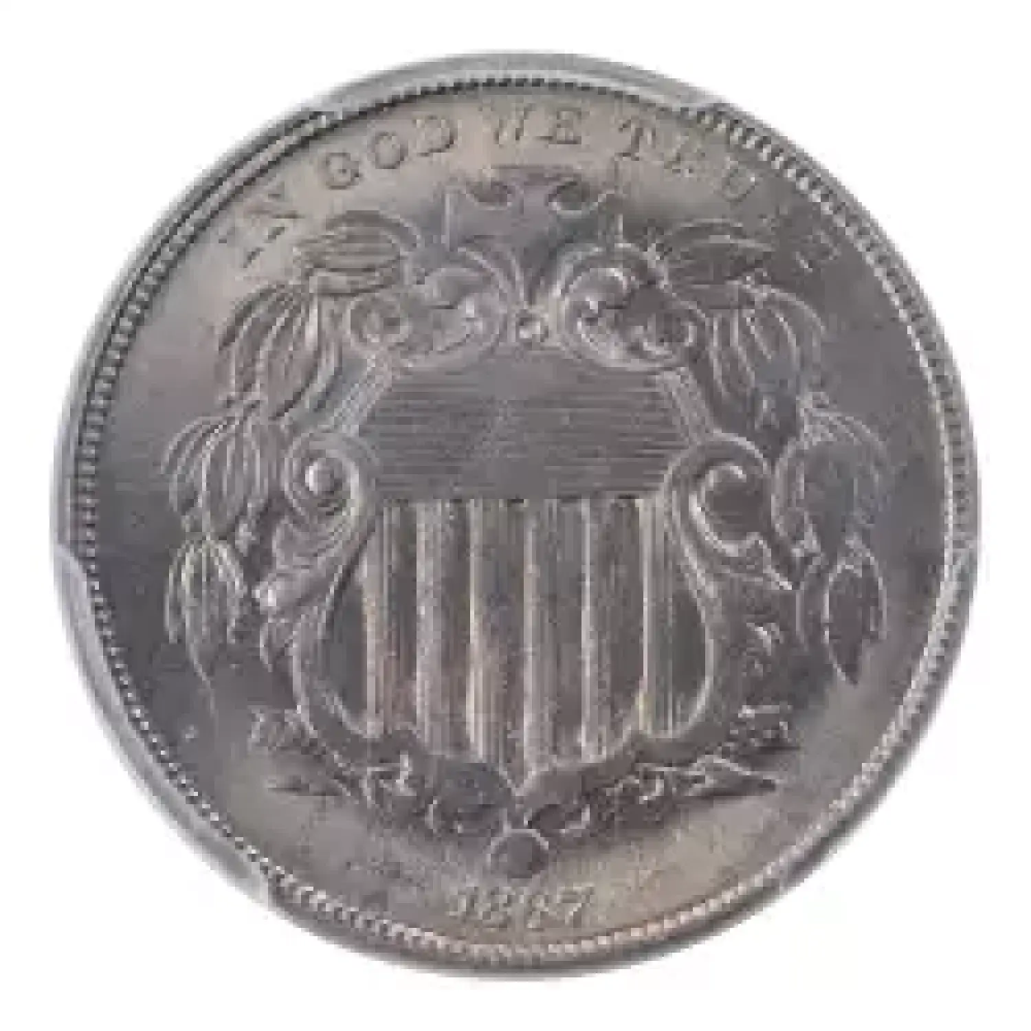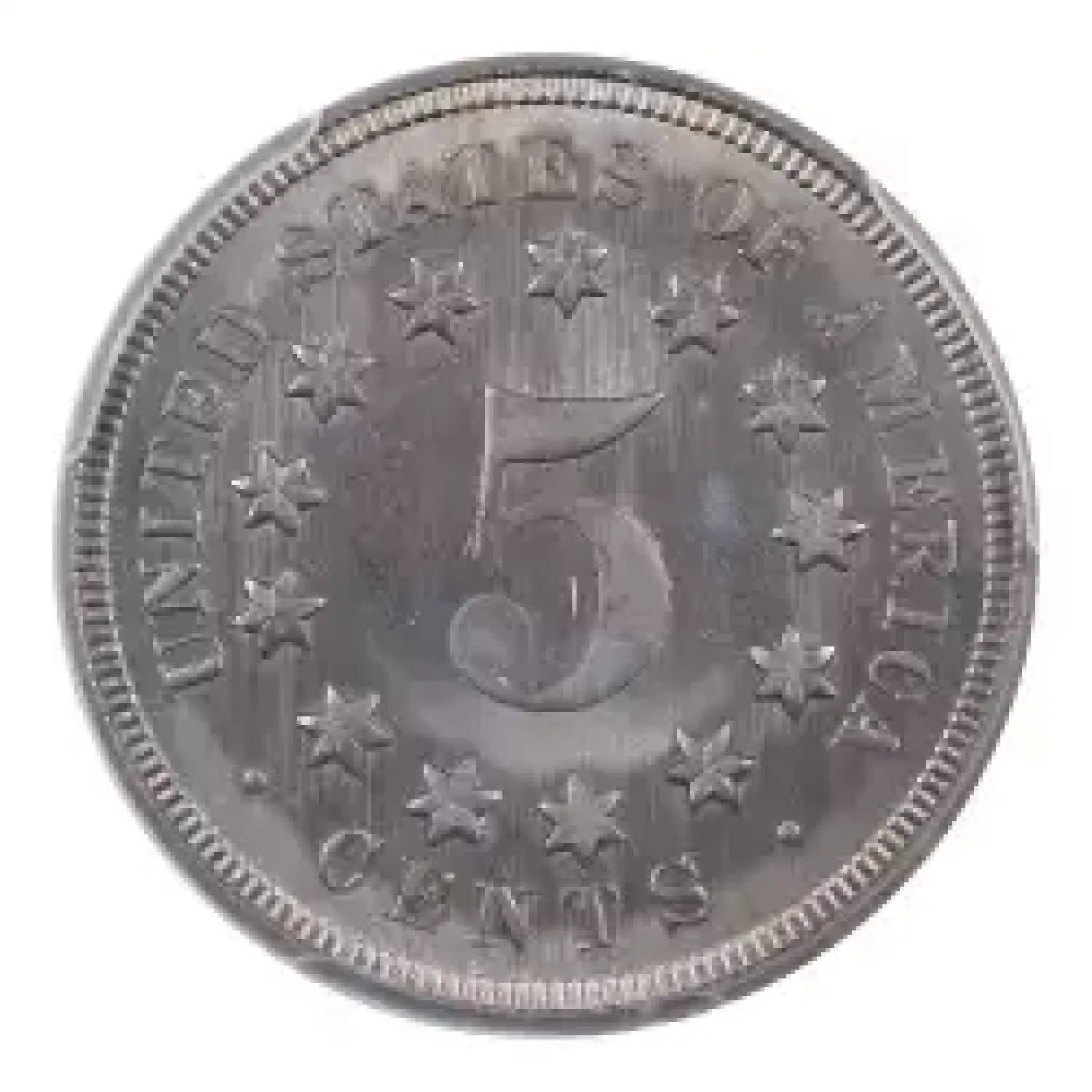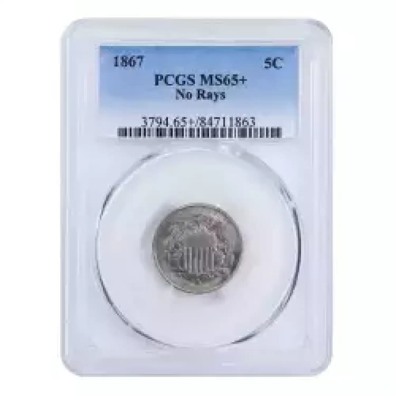 1867 5c No Rays PCGS MS65+. One of just eight examples certified by PCGS in this grade. This piece boasts intense luster with remarkably clean surfaces. An excellent candidate for a gem type set, or high grade shield nickel set.