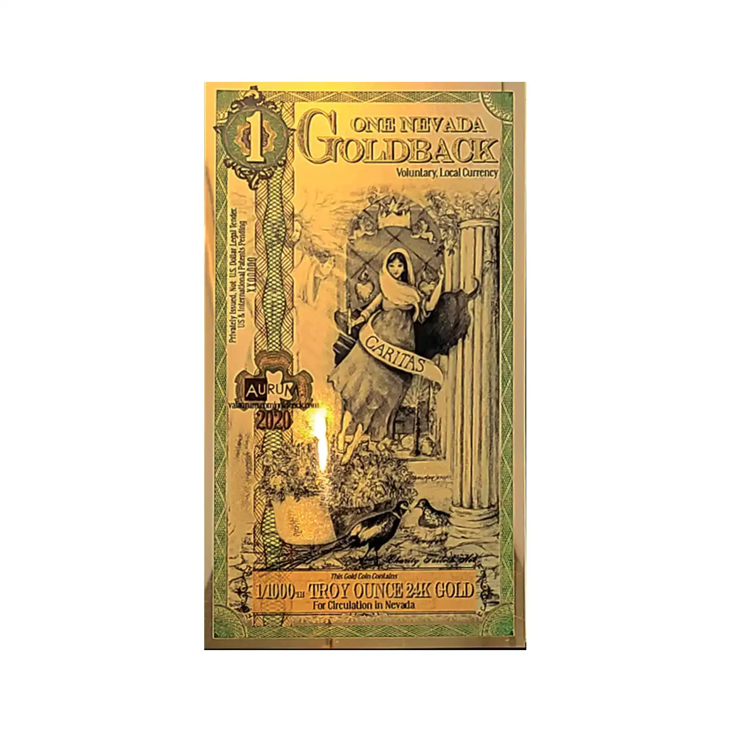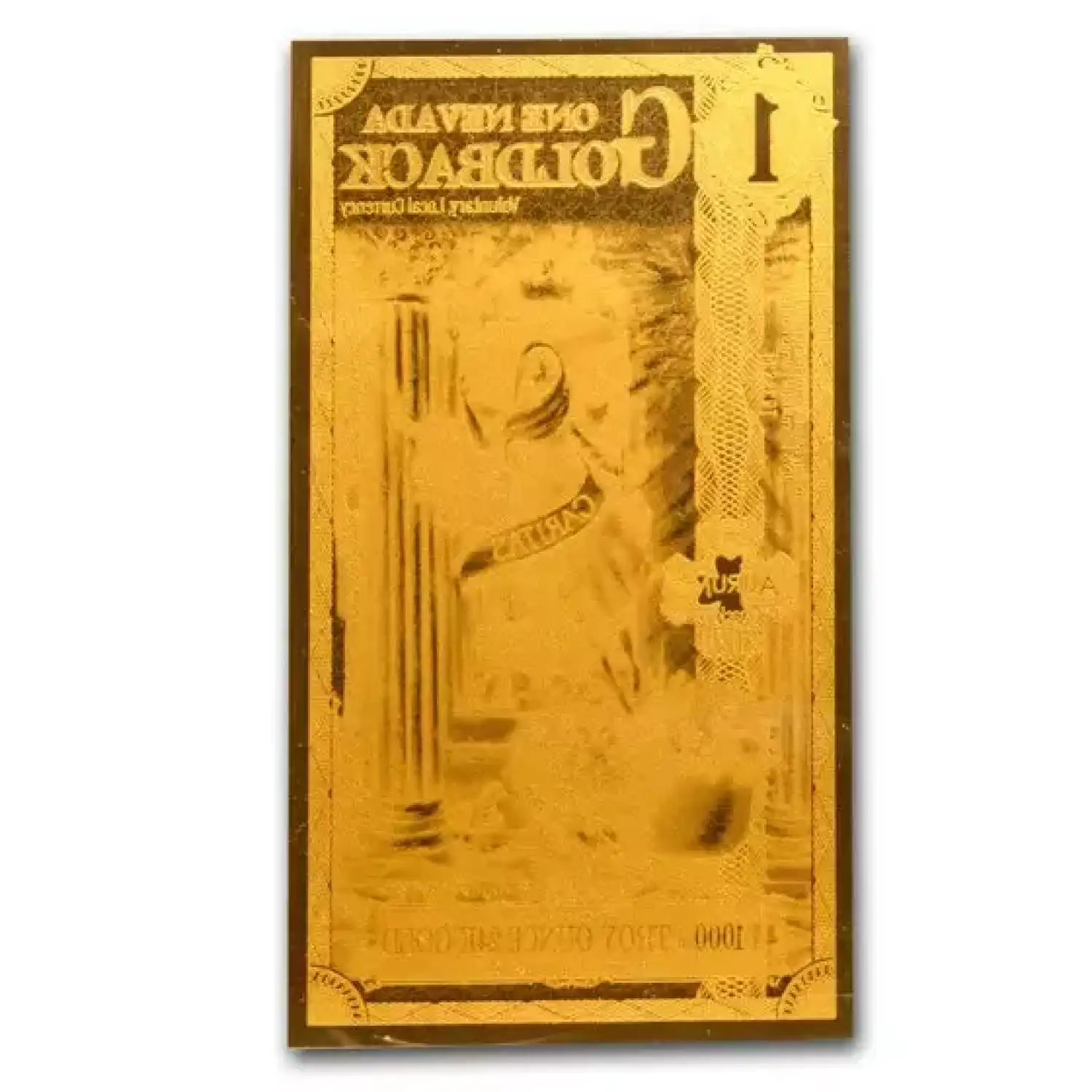 These Nevada Goldback foil notes contain 1/1000 oz .999 fine Gold which is the first local, voluntary currency to be made of a spendable, beautiful, physical Gold.