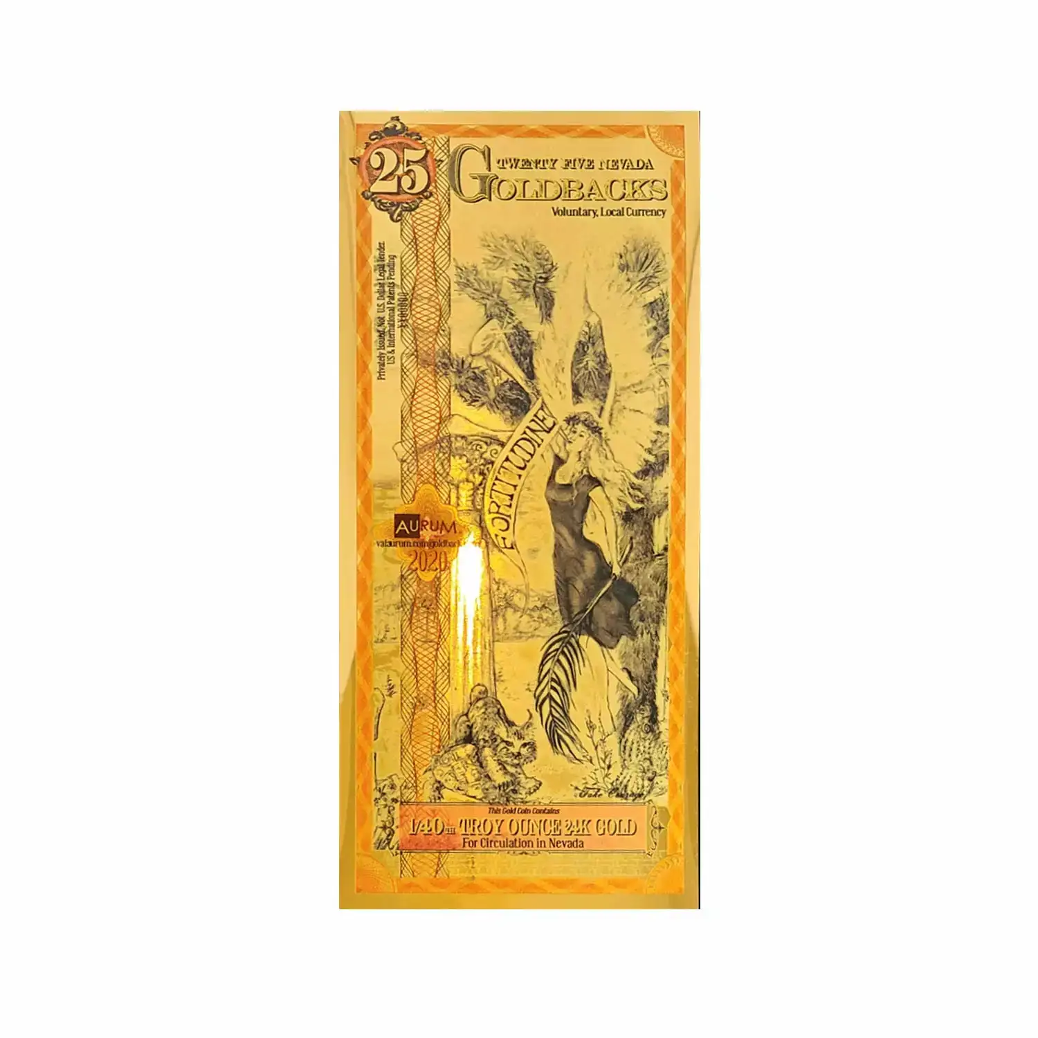 These Nevada Goldback foil notes contain 1/40 oz of .999 fine Gold which is the first local, voluntary currency to be made of a spendable, beautiful, physical Gold.