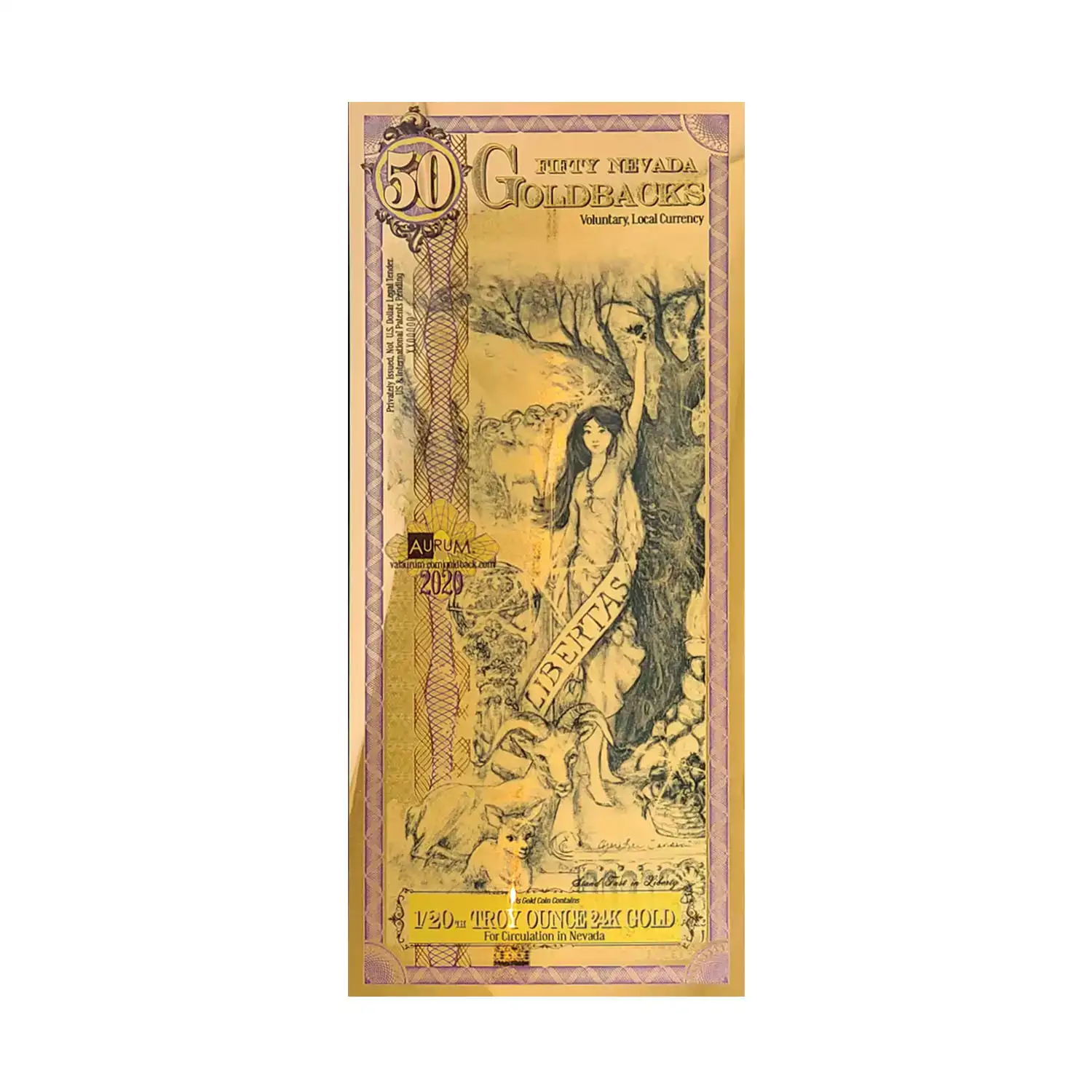 These Nevada Goldback foil notes contain 1/20 oz of .999 fine Gold which is the first local, voluntary currency to be made of a spendable, beautiful, physical Gold.