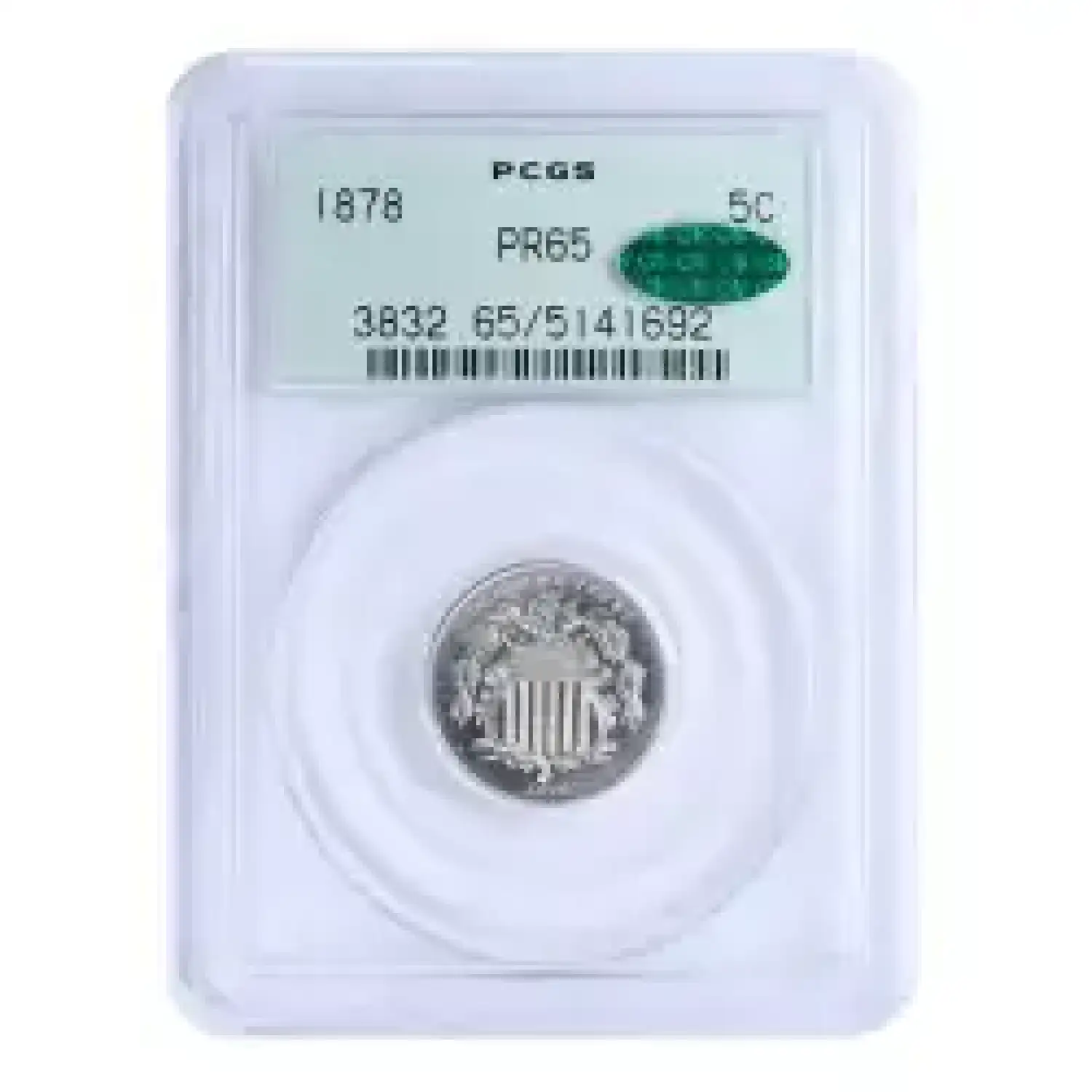 1878 5c PCGS PR65 green CAC sticker. Gem proof shield nickel housed in a PCGS old green label holder. Mostly untoned with crisp mirrors, the devices display some cameo contrast. Well preserved surfaces with minimal spotting.