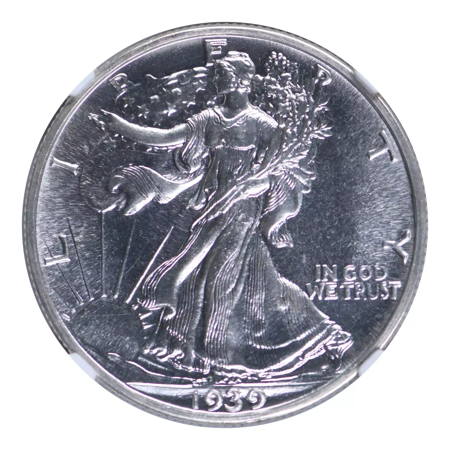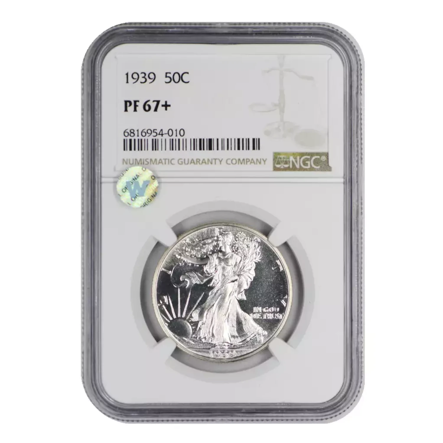 1939 50c NGC PR67+. This superb gem proof walking liberty half dollar displays immaculate blast white surfaces. Deeply mirrored with a razor sharp strike