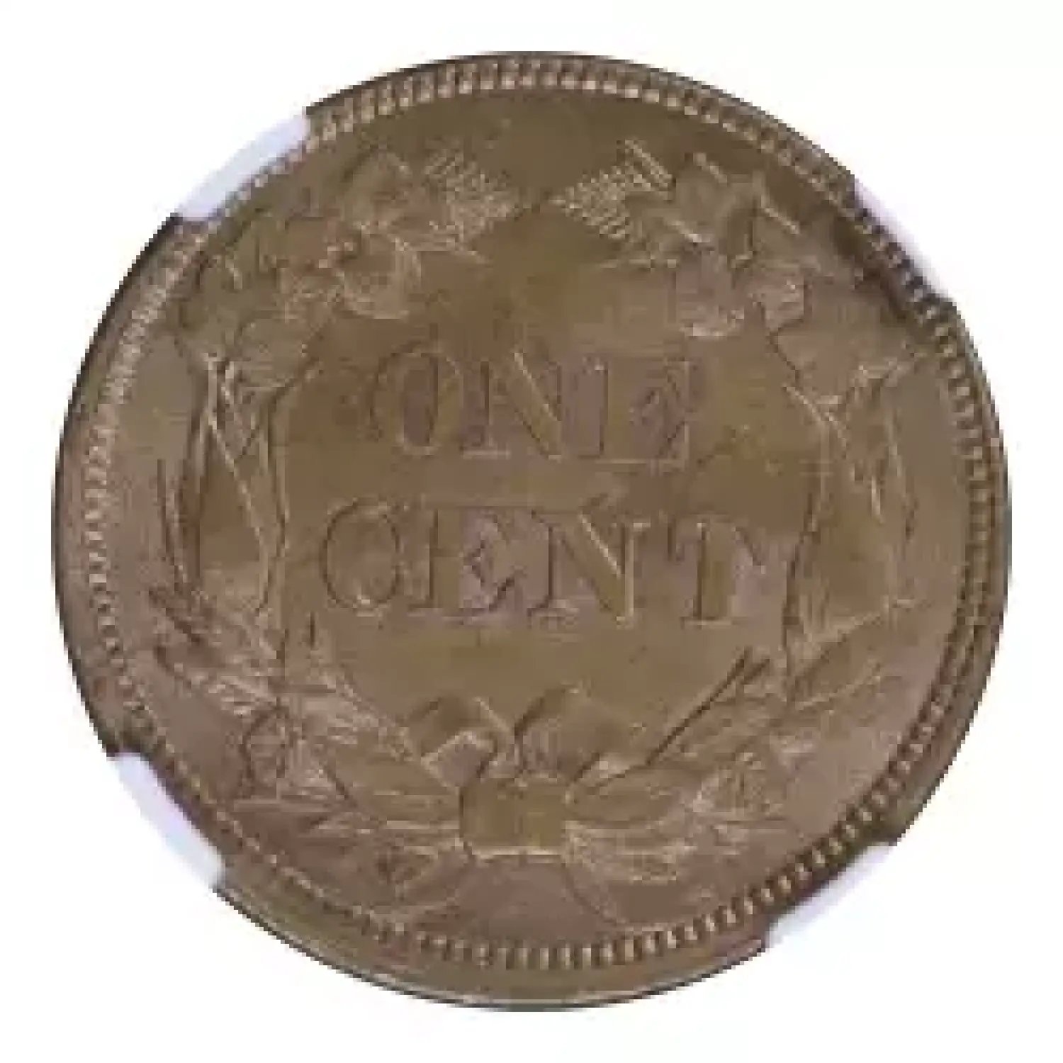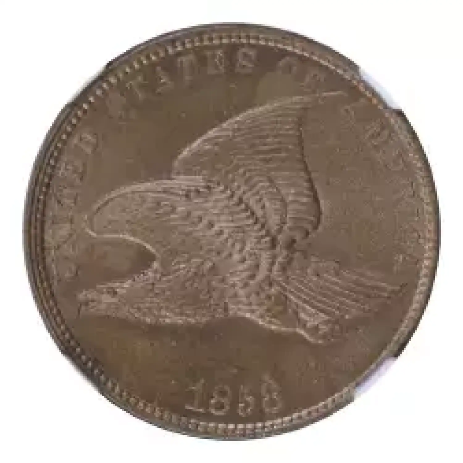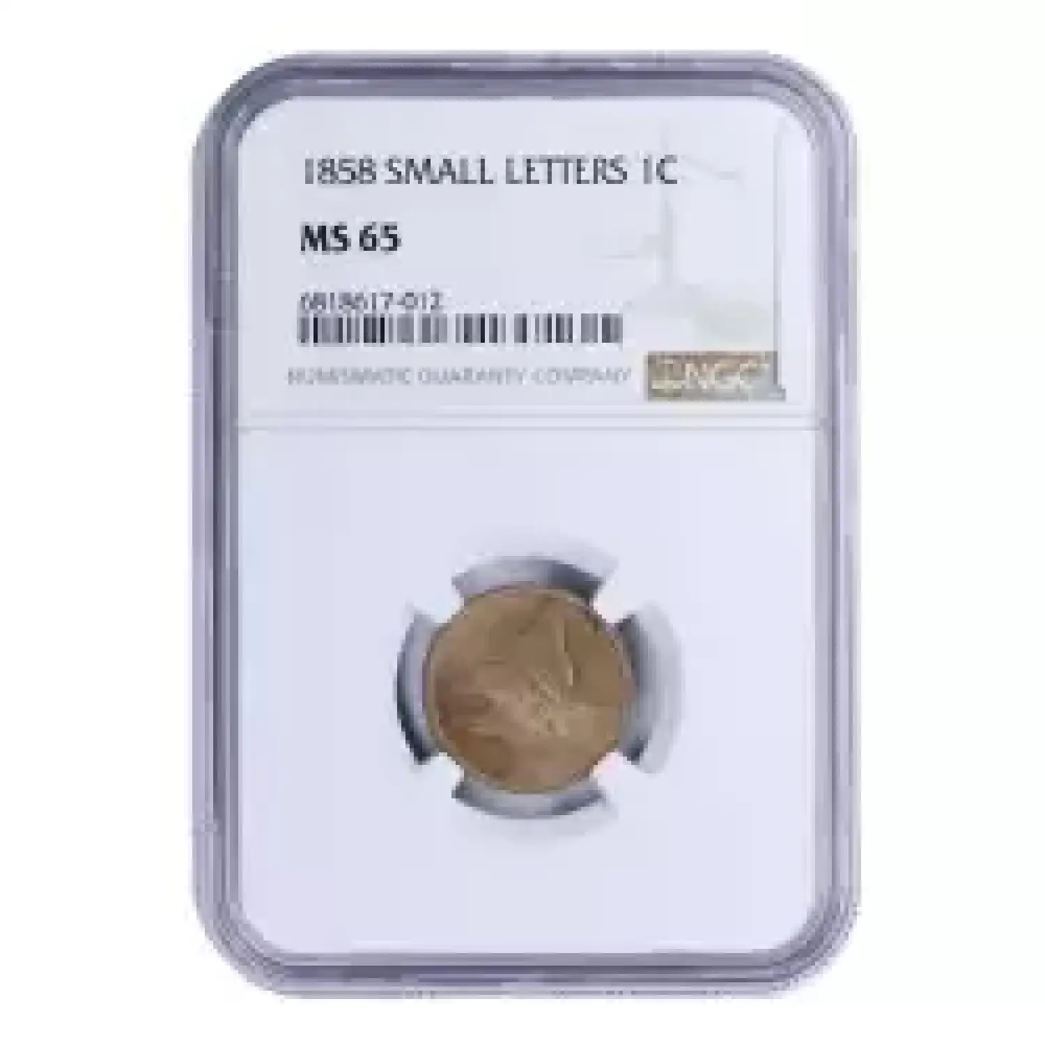 1858 1c Small Letters NGC MS65. A standout example of this short lived, but popular series. Excellently struck with impressive luster and minimal contact marks. Surfaces display an even rich bronze color. This gem graded flying eagle cent is deserving of a home in a high quality date set, or as a superb representative of the issue in a type set.