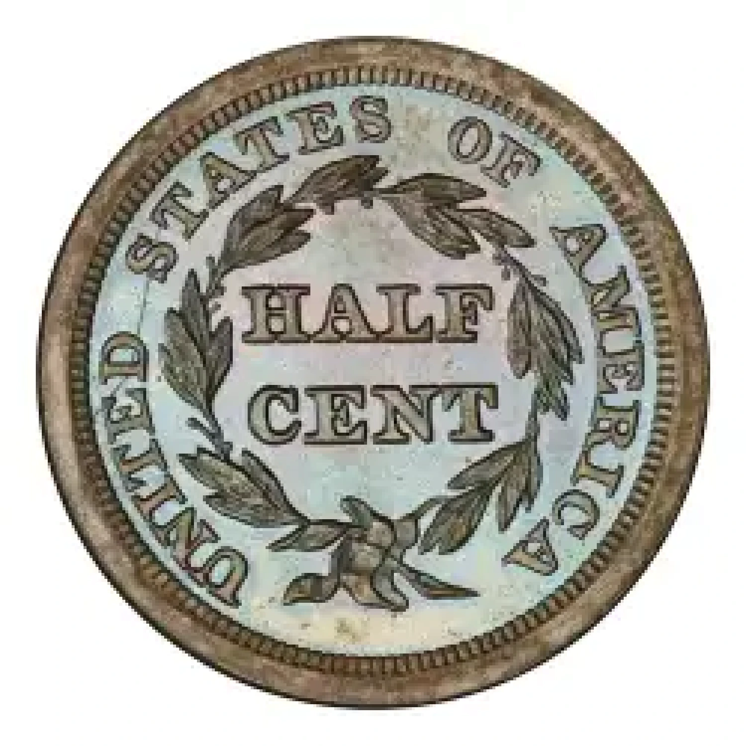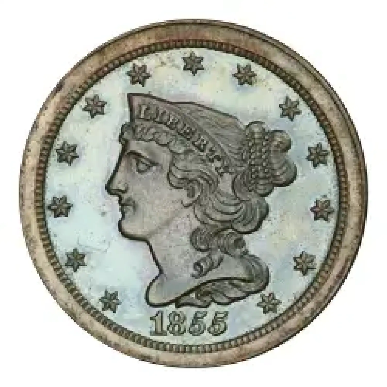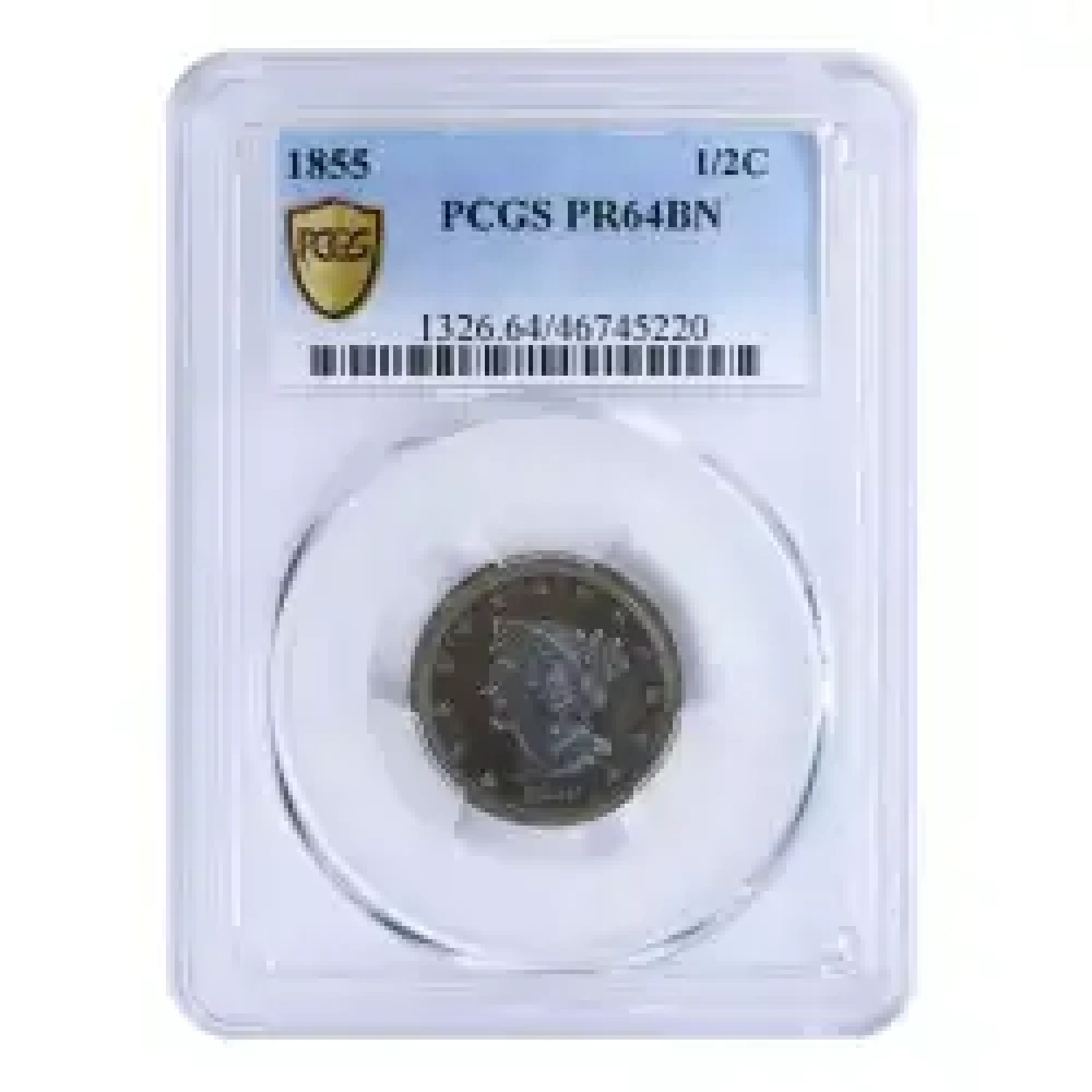 1855 1/2c PCGS PR64BN. One of just forty examples struck. Only nine have received this grade at PCGS, with just four finer brown specimens. The strike is razor sharp, with nicely mirrored fields. Blue toning attractively covers both the obverse and reverse. Importantly, the coin is free of any serious spotting or environmental issues, which is rarely the case with early proof copper.