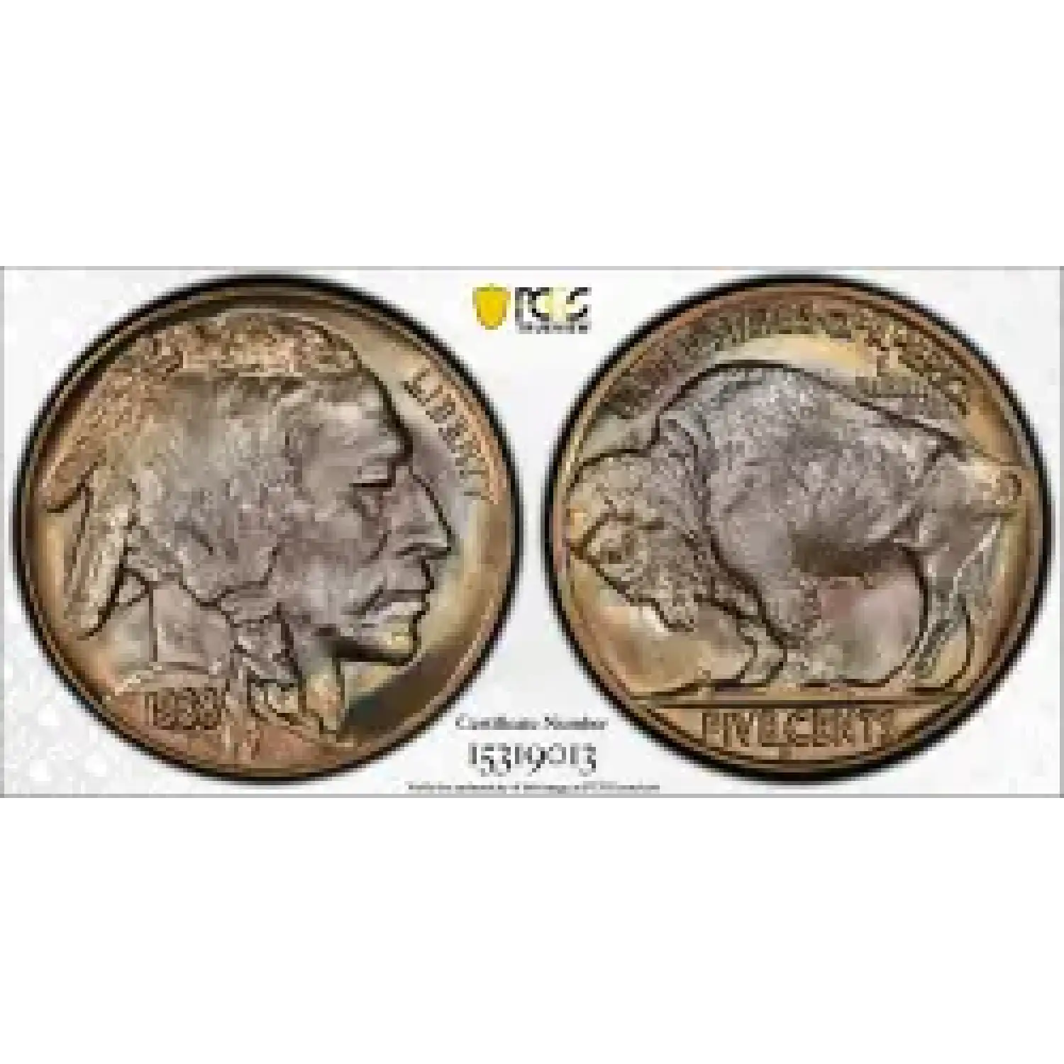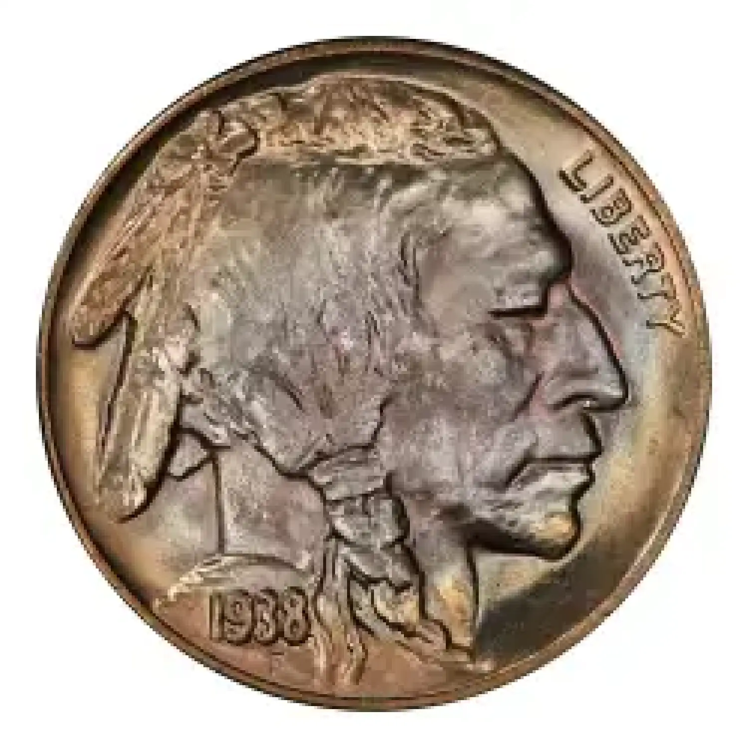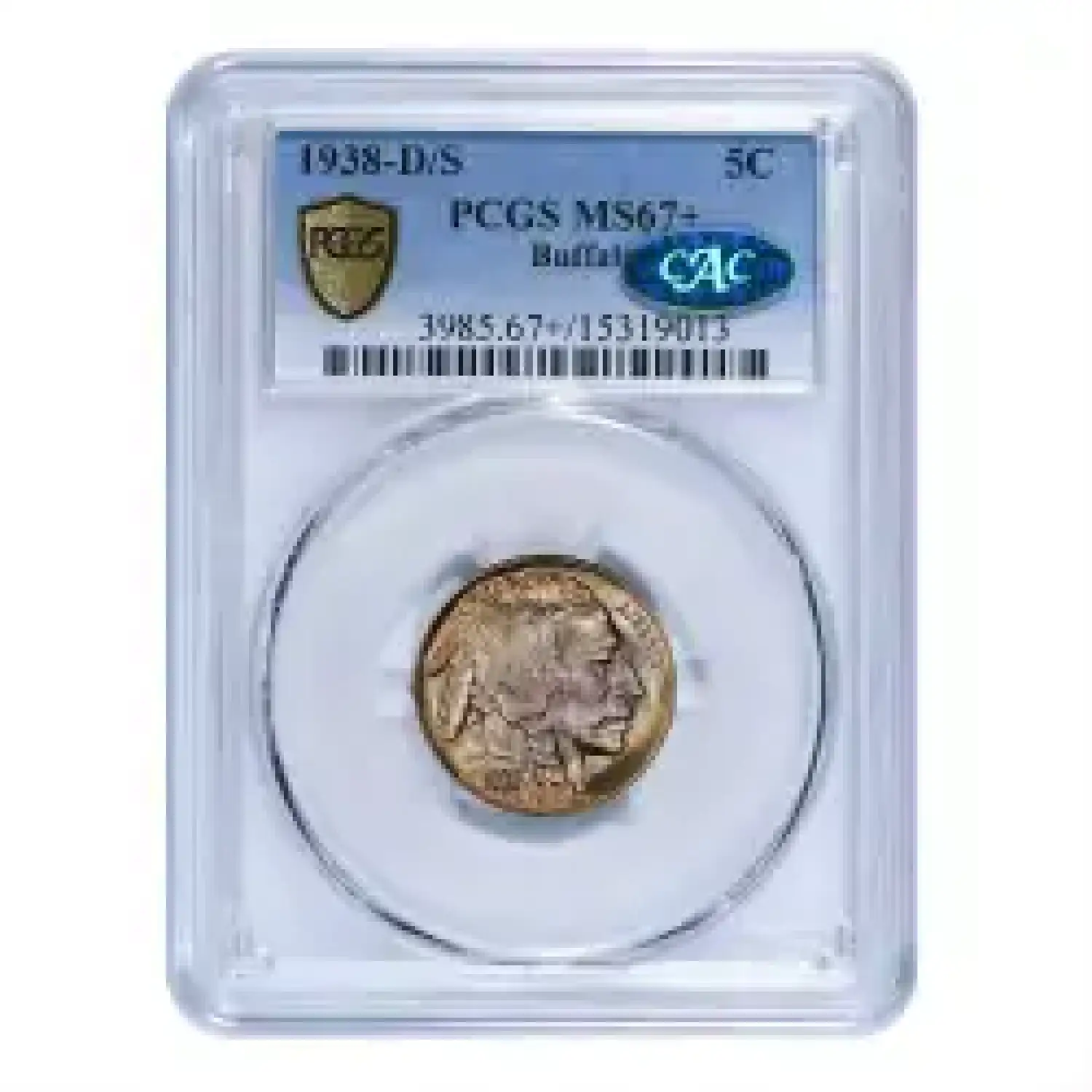 1938-D/S 5c PCGS MS67+, green CAC sticker. FS-512 over mint mark. A gorgeous example of the only date with an over mint mark in the series! Immaculate surfaces are nicely framed by pastel toning. Well struck with intense satiny luster. An excellent candidate for a world class buffalo nickel set.