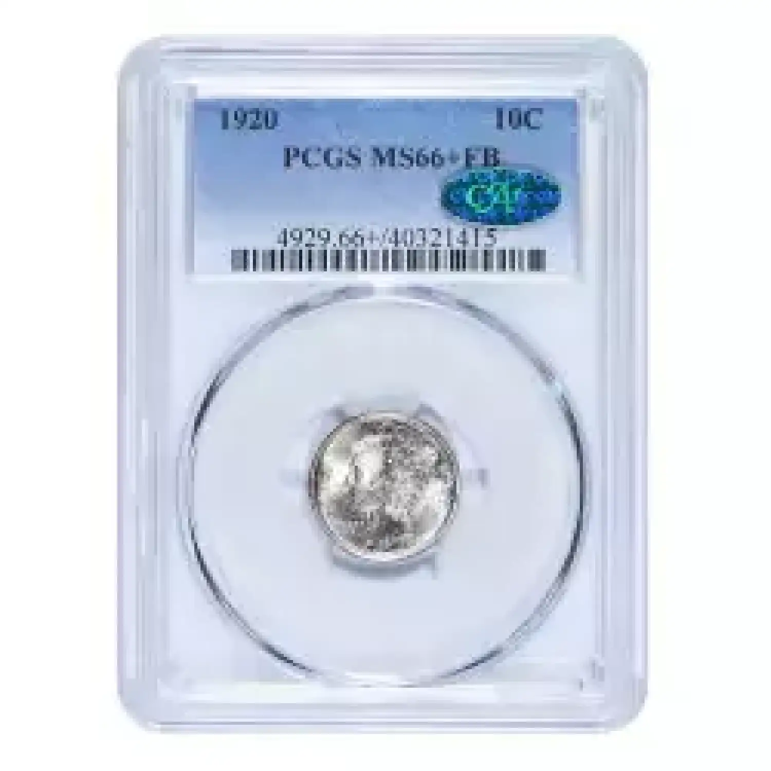 1920 10c PCGS MS66+FB green CAC sticker. PCGS has certified just fifteen examples in this grade, with only 28 finer coins in total. Well struck with radiant luster and remarkably well preserved. Surfaces are entirely original and feature mottled toning. An excellent candidate for a gem registry set of full band mercury dimes.