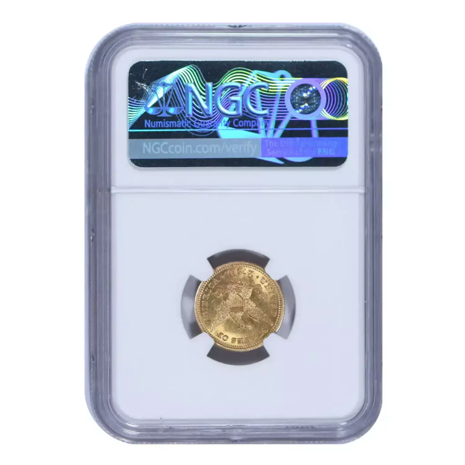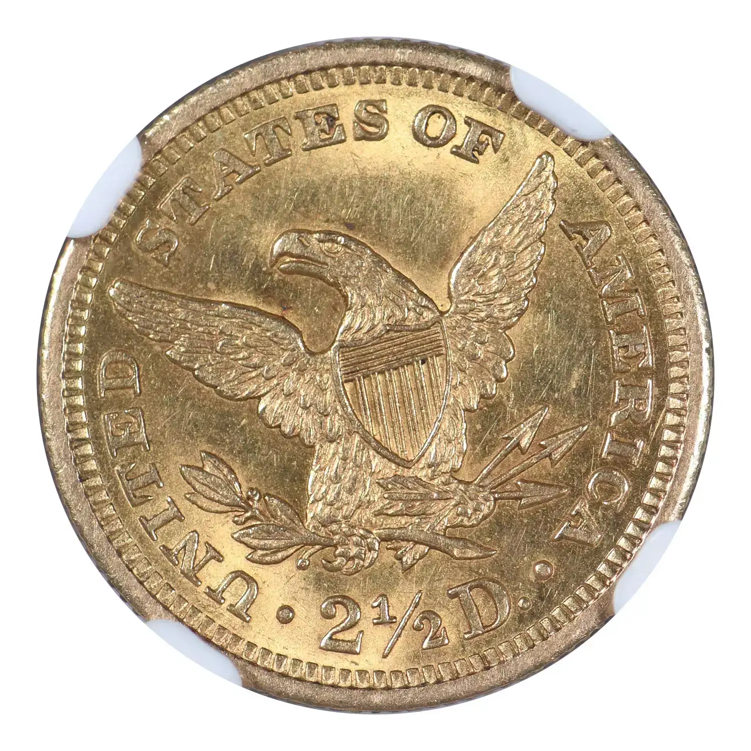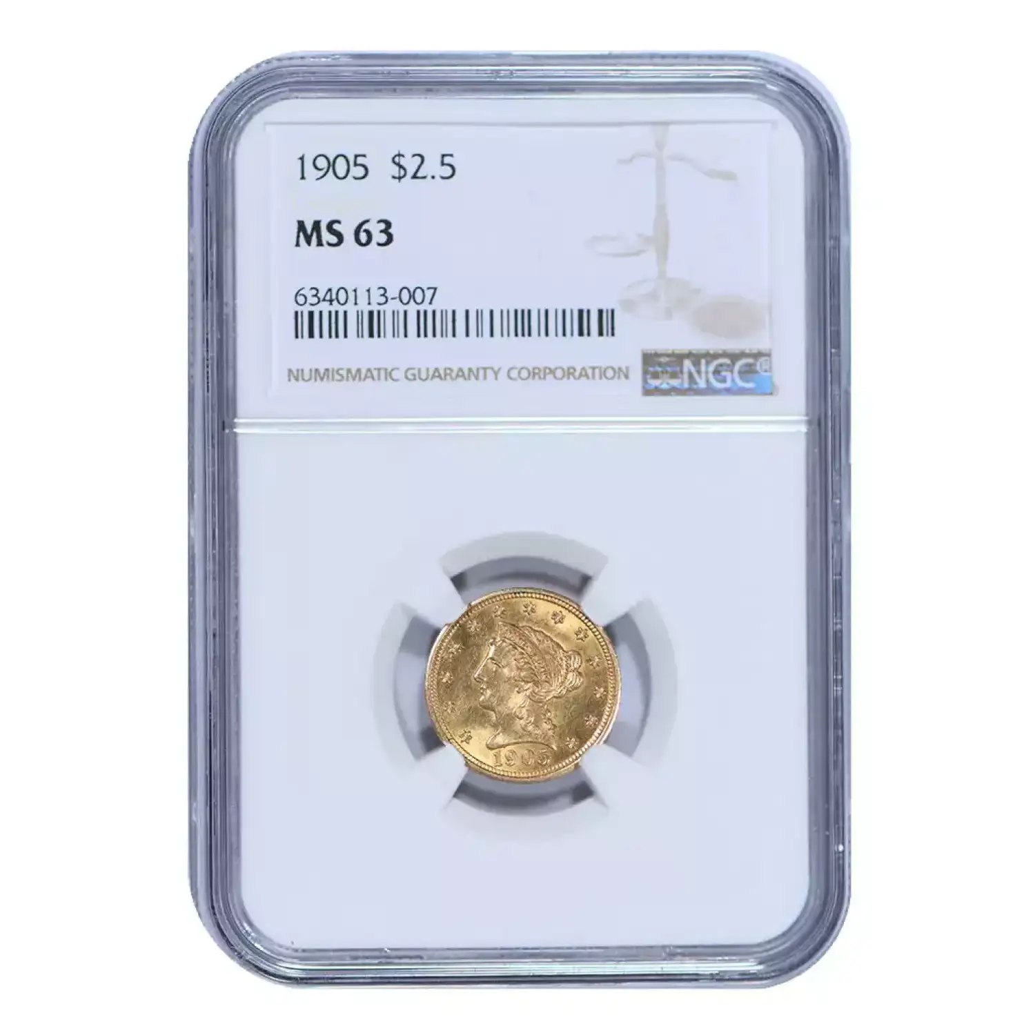 1905 $2.50 NGC MS63. A pleasant lustrous uncirculated example of the type. An excellent combination of both precious metal, and numismatic value.
