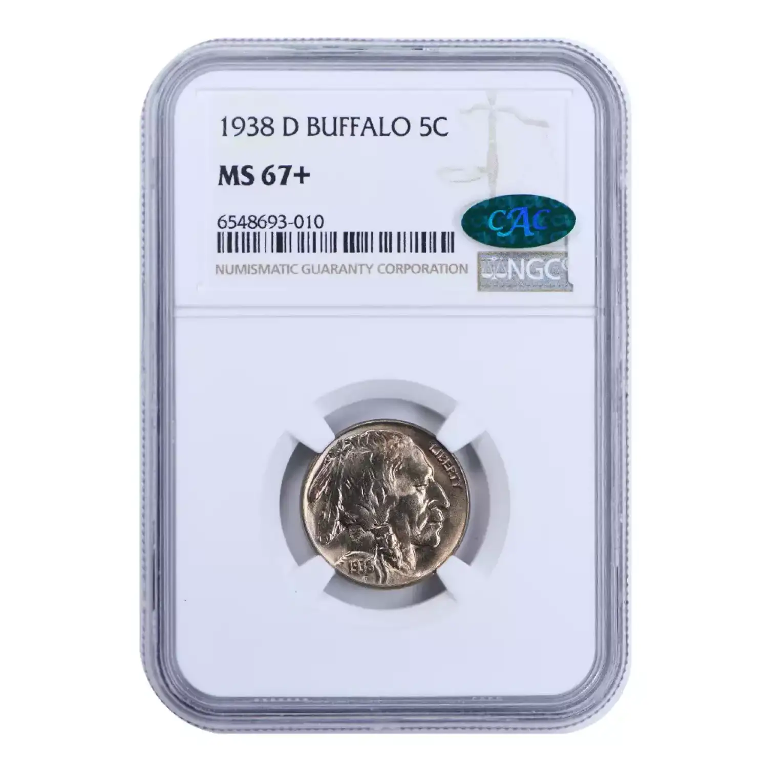 1938-D 5c NGC MS67+ green CAC sticker. Surfaces display light gold toning and are incredibly lustrous throughout. Sharply struck and impeccably well preserved. This superb gem is sure to look at home in a high grade CAC approved buffalo nickel set.