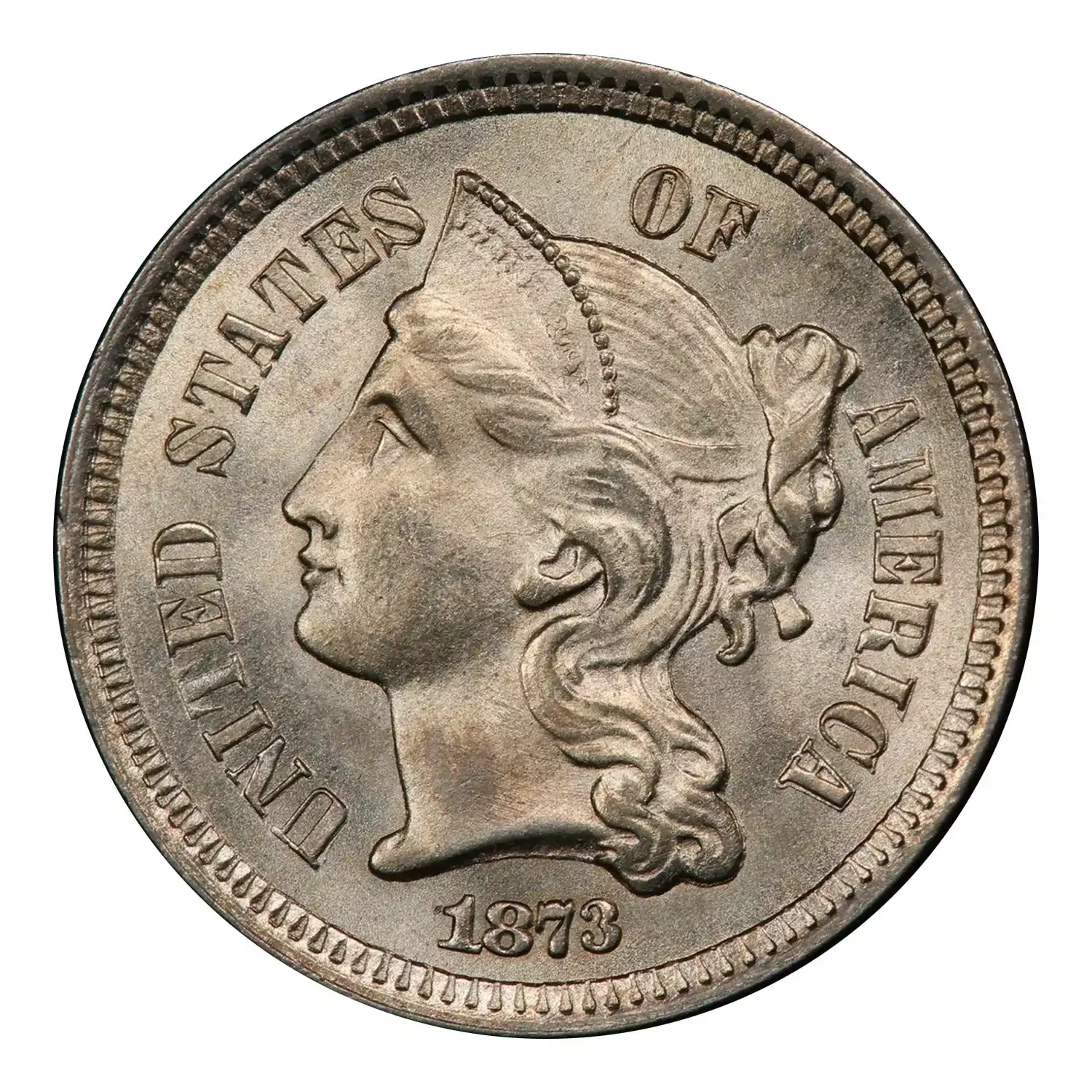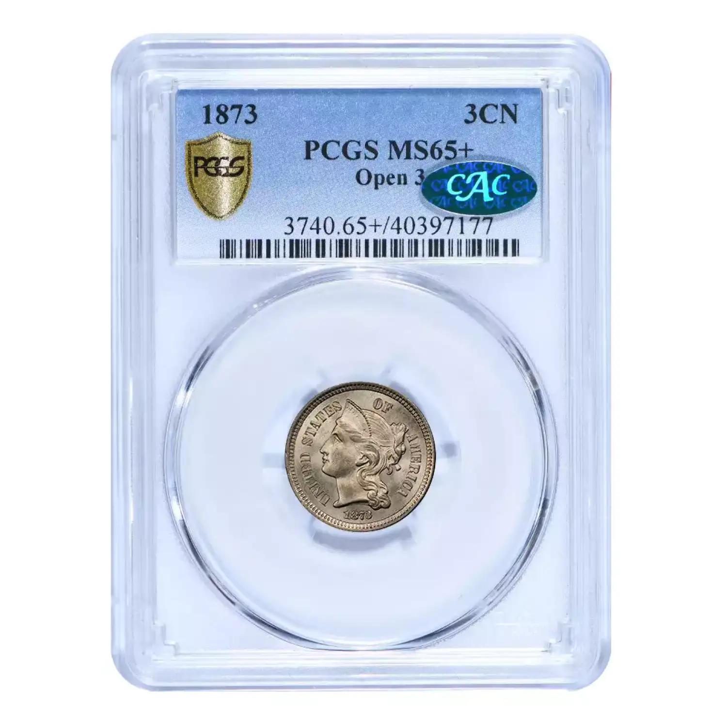 1873 Open 3 3cN PCGS MS65+ green CAC sticker. Population of just two, with a mere nine finer examples certified by PCGS. Exceptionally well struck with flowing luster and remarkably clean surfaces.