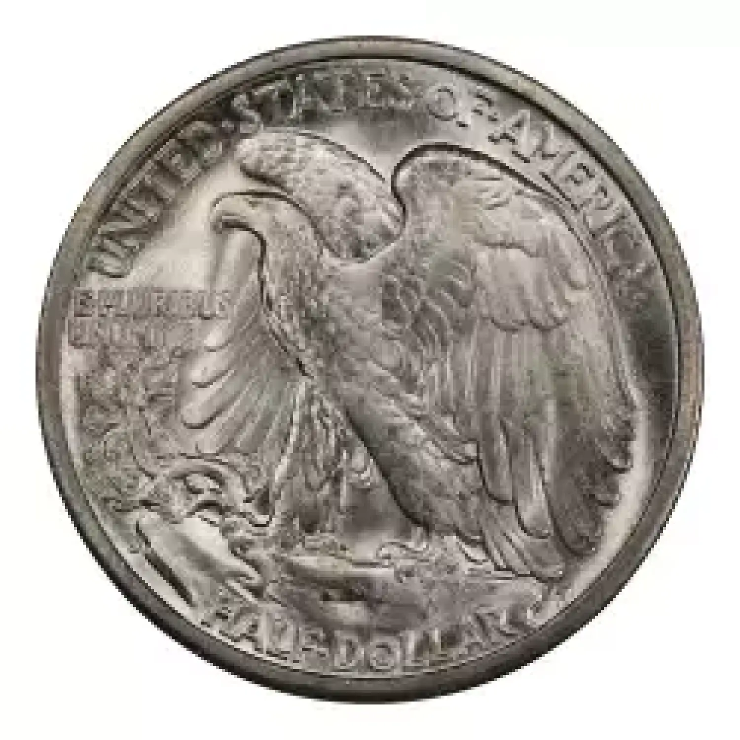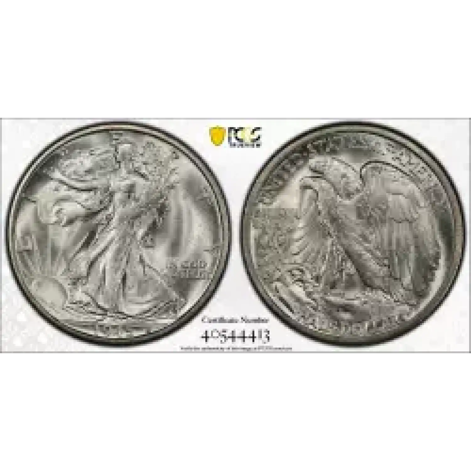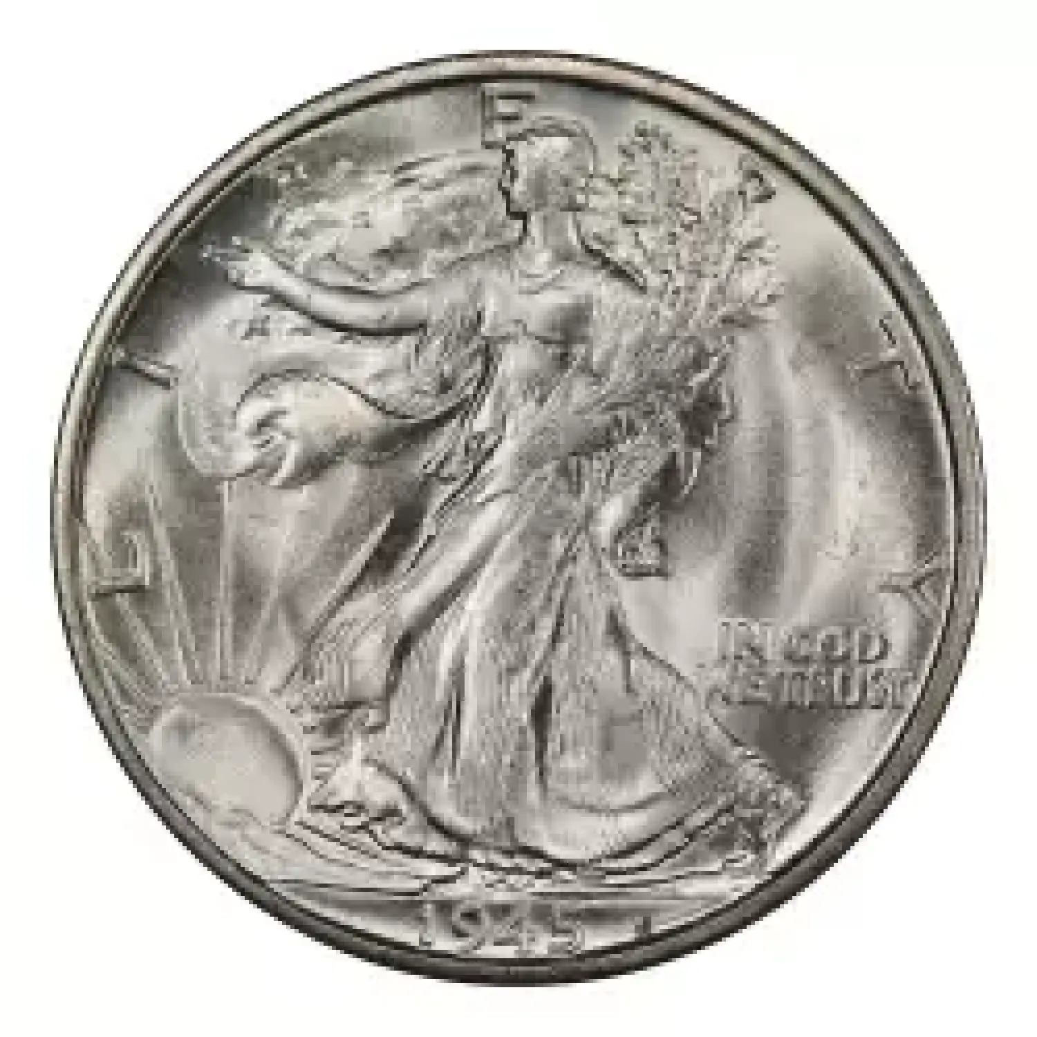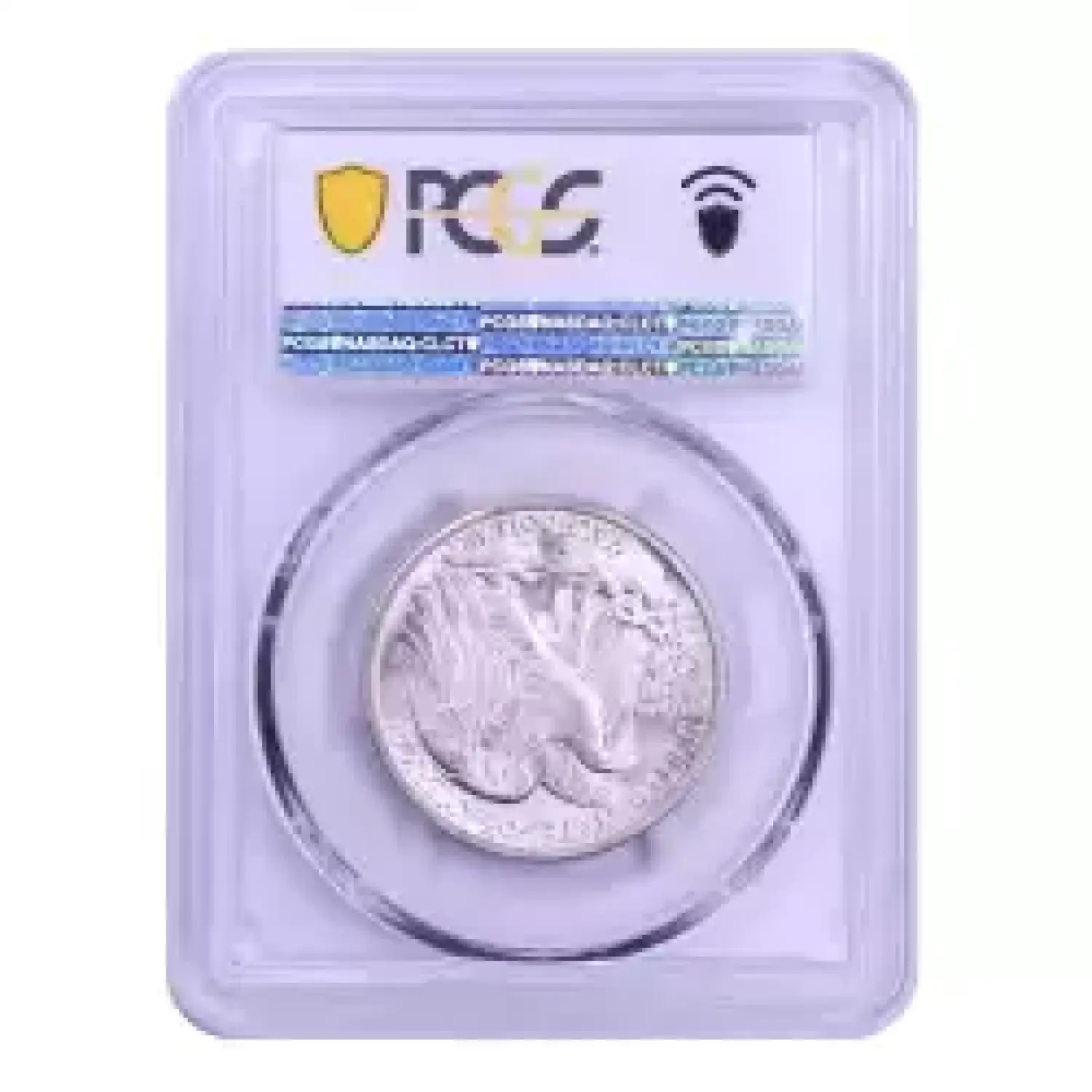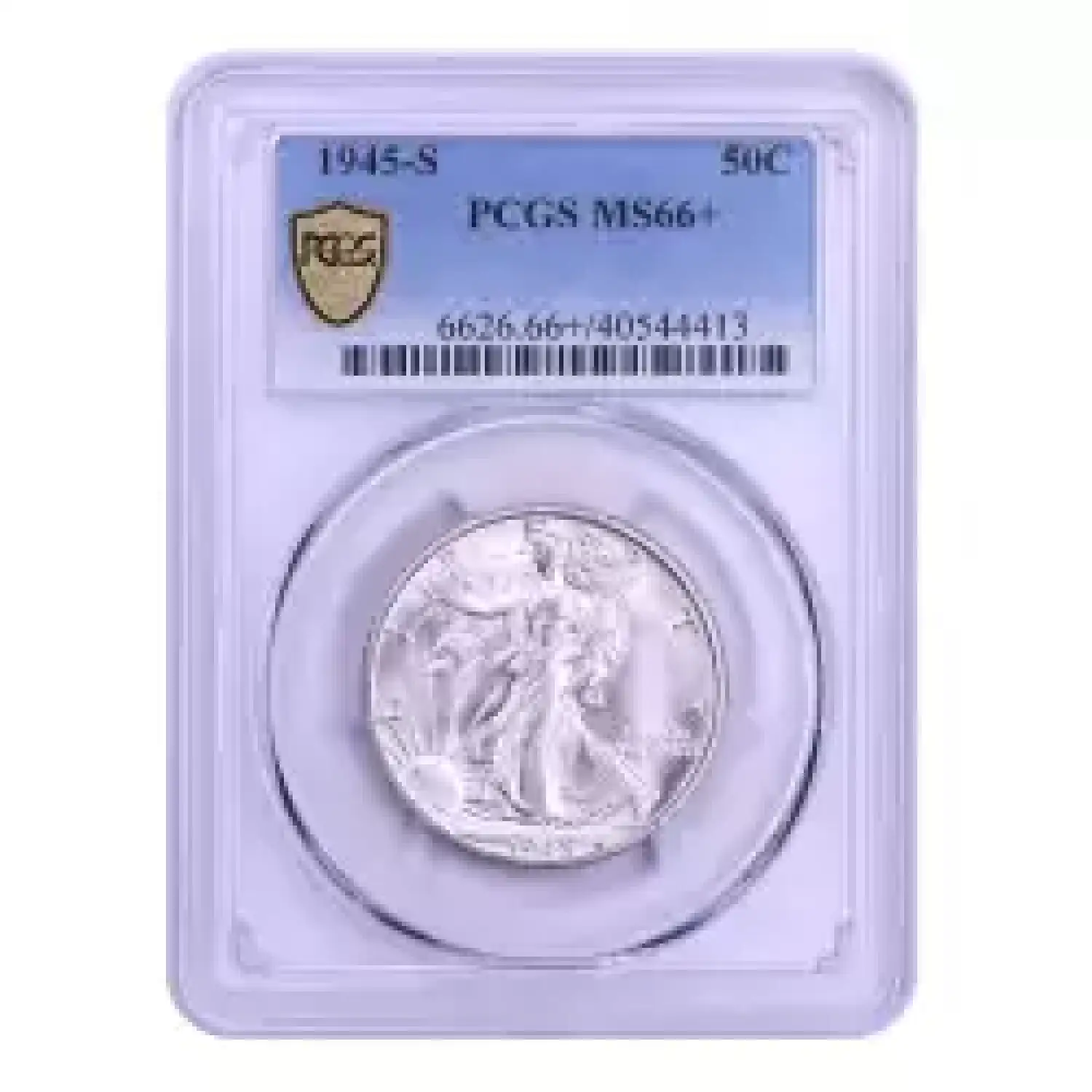 1945-S 50c PCGS MS66+. A blast white and intensely lustrous example of this San Francisco mint walking liberty half dollar. Free of any large spots or marks, with a frosty matte appearance throughout.