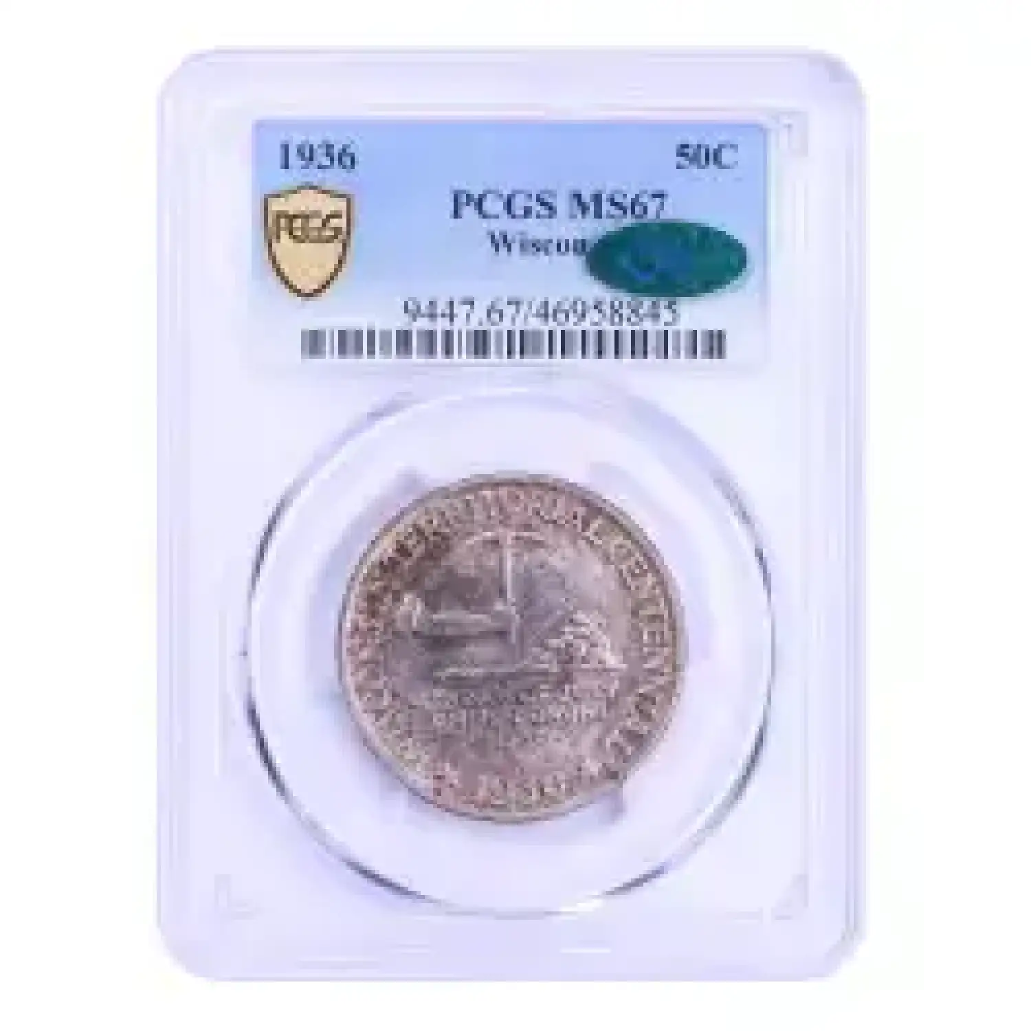 1936 50c Wisconsin PCGS MS67 green CAC sticker. Just over 25,000 Wisconsin commemorative half dollars were struck, and only a small portion remain this well preserved. Wonderfully original surfaces display mottled toning and great luster. Remarkably clean and truly deserving of sought after CAC approval.