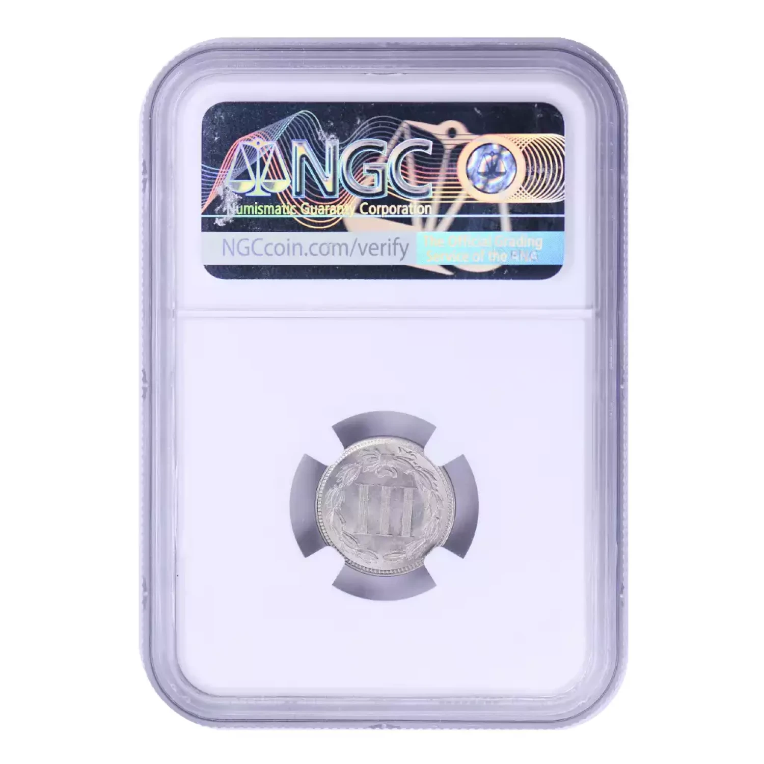 1875 3CN NGC MS65. An excellently preserved three cent nickel. Unusually well struck with frosty luster. Mostly white surfaces, free of any seriously distracting marks or spots.