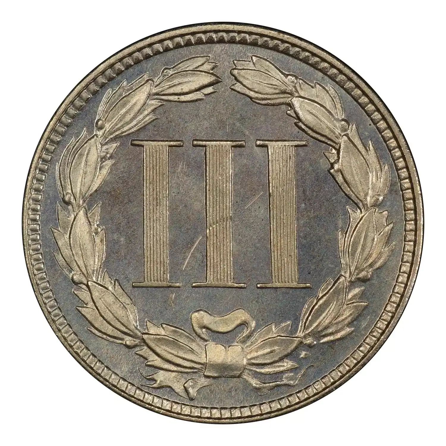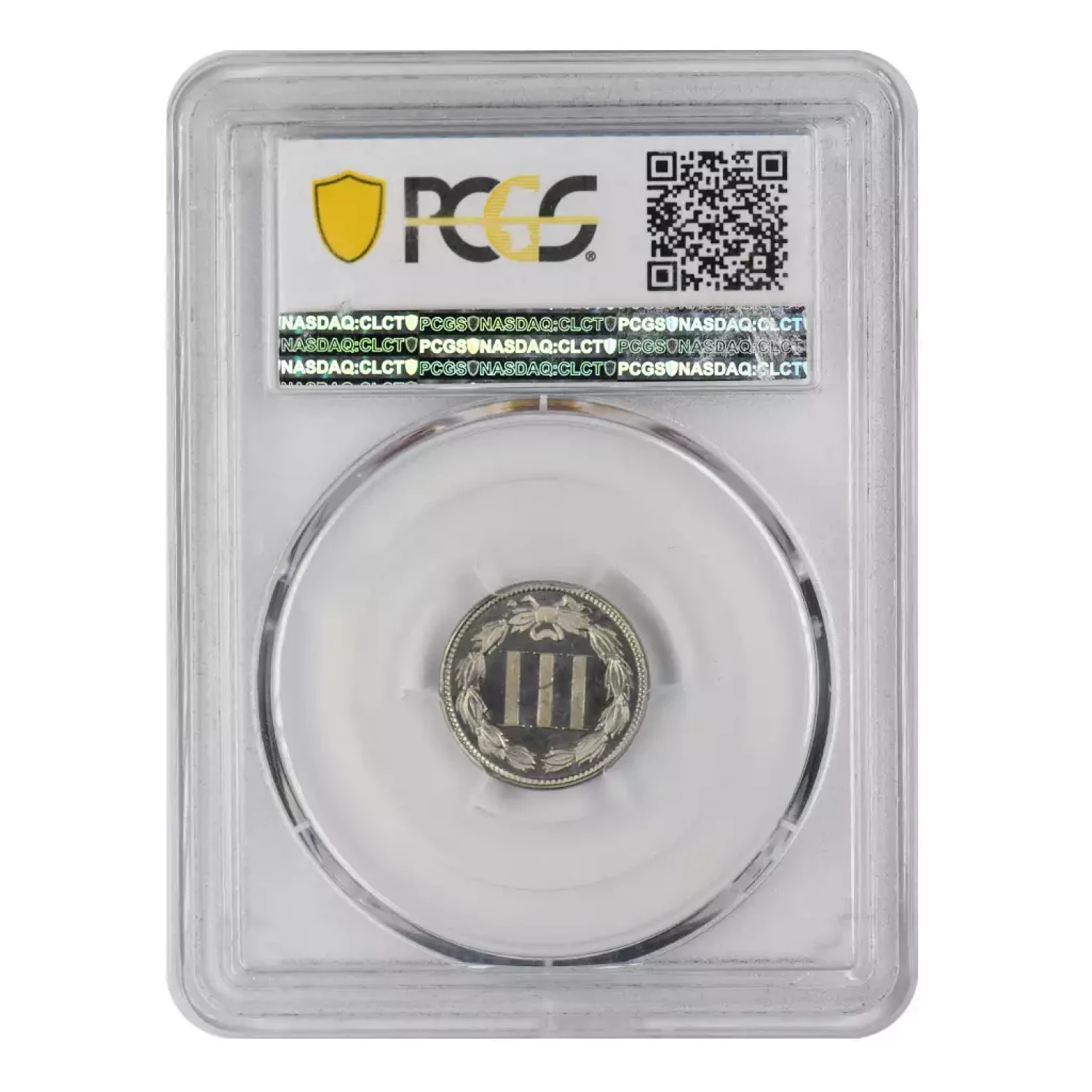 1878 3cN PCGS PR64 green CAC sticker. Frosted design elements contrast nicely against mirrored fields, falling just shy of a cameo designation. We believe the obverse of this three cent nickel is full on gem, with only a reverse mark precluding it from being graded as such. An excellent candidate for an 1878 proof set, or a date set of proof three cent nickels.