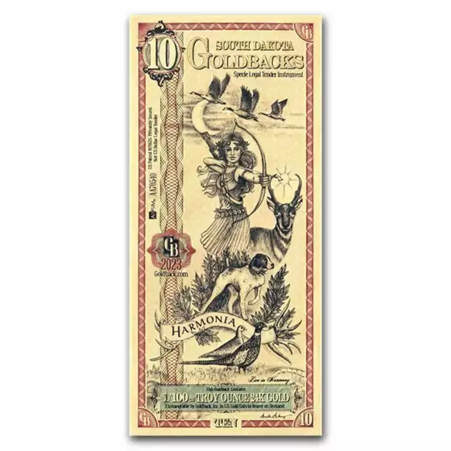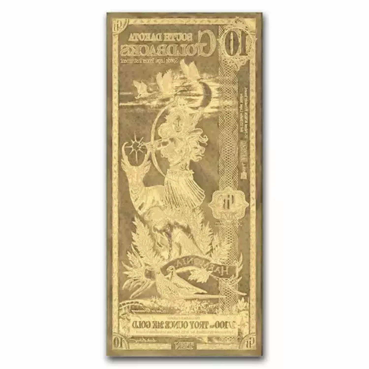 These South Dakota Goldback foil notes contain 1/100 oz .999 of fine Gold which is the first local, voluntary currency to be made of a spendable, beautiful, physical Gold.