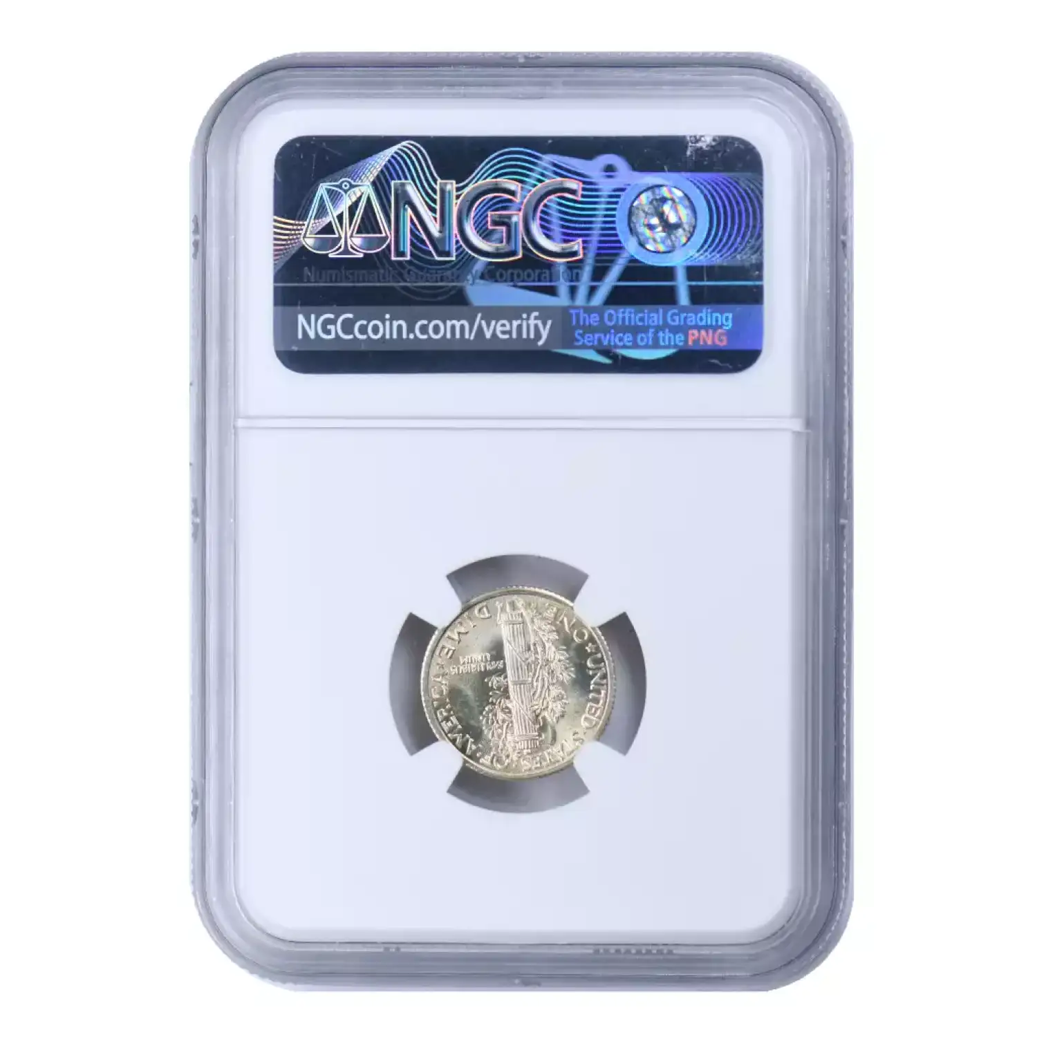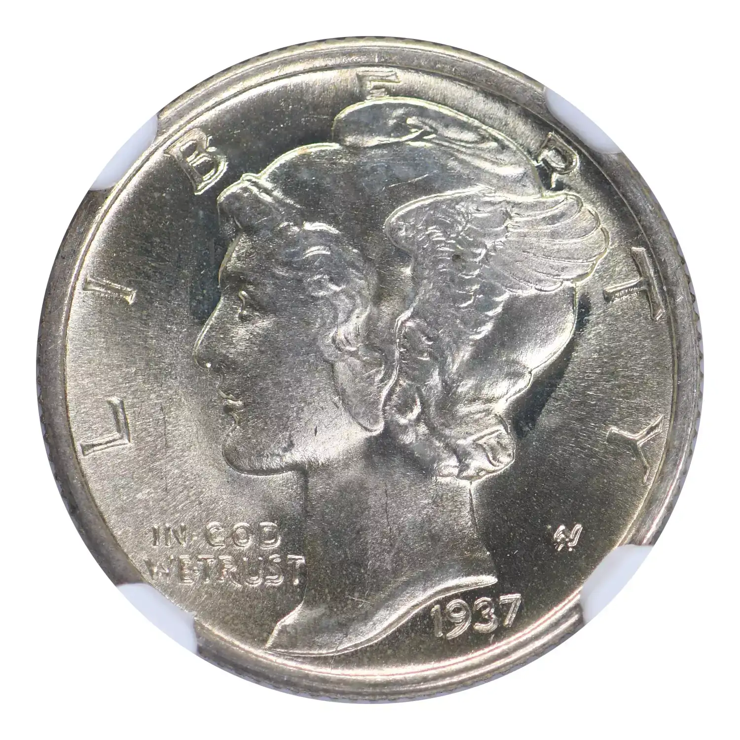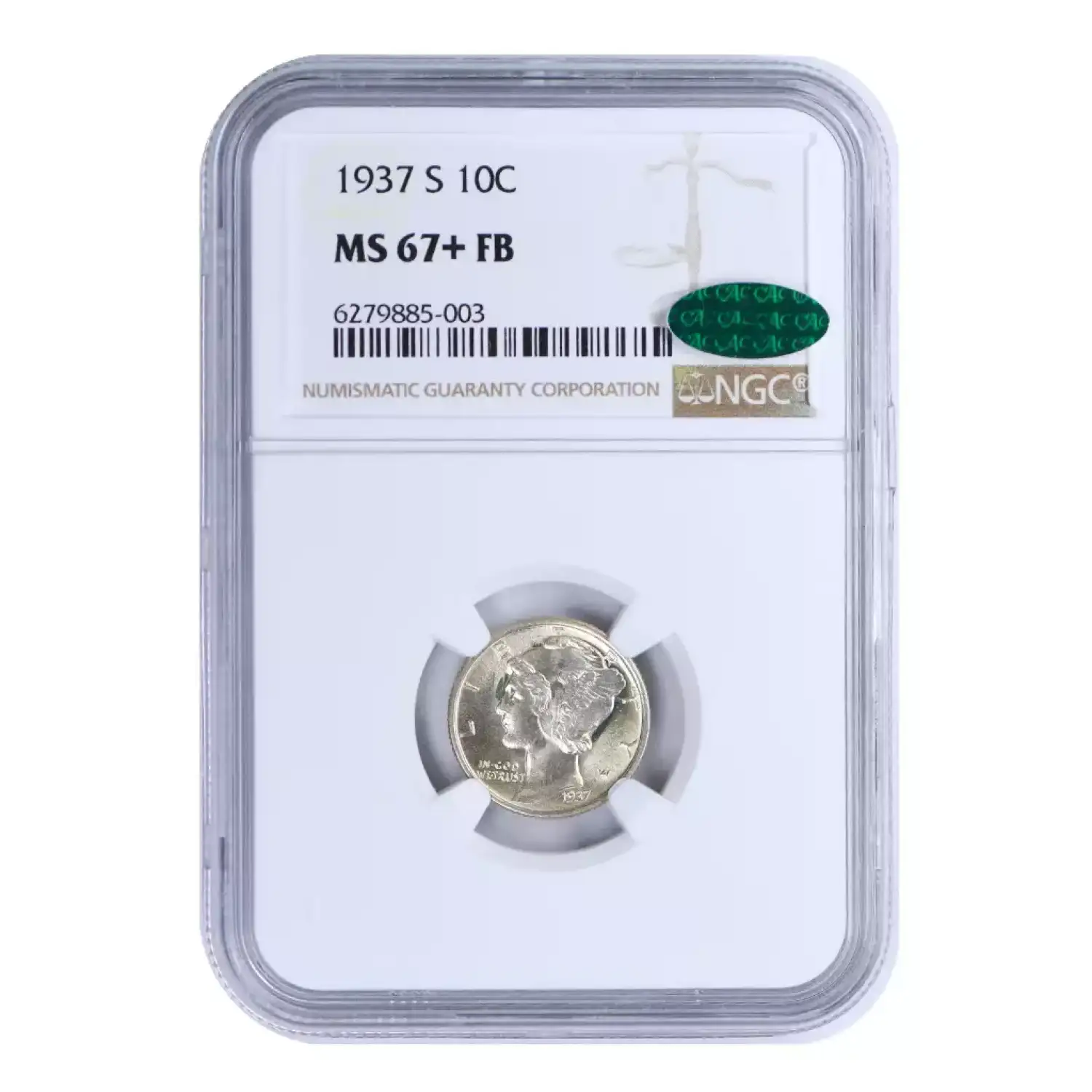 1937-S 10c NGC MS67+FB, green CAC sticker. San Francisco mint mercury dimes are notoriously poorly struck, however the example offered here is a clear outlier. White silvery surfaces are awash with frosty swirling luster. Impeccably clean surfaces, with boldly separated bands. An excellent candidate for a world class set of mercury dimes.