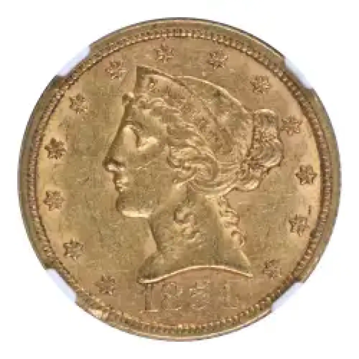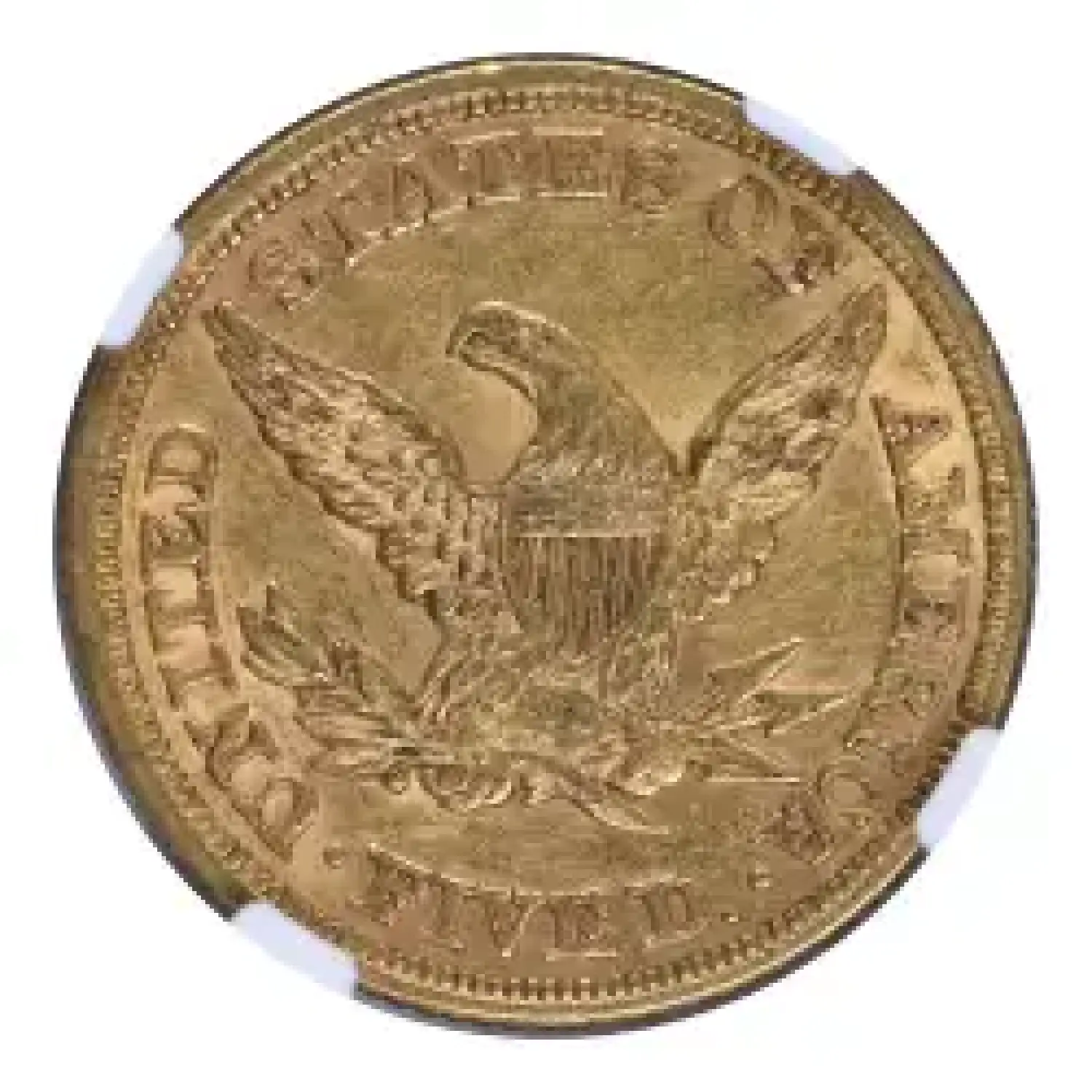 1854 $5 NGC AU58. This date is scarcer than its mintage of 160,675 may lead one to believe. 1854 half eagles saw extensive use in commerce- many were melted, destroyed, or otherwise lost to history. Most surviving examples are well circulated, as indicated by David Akers who writes “the 1854, when available at all, is almost always just VF or EF”. The example offered here shows only the earliest signs of circulation. Minimal wear with only minor loss of detail, and plentiful mint luster. The color is a light yellow gold with touches of copper hues. Surfaces are wonderfully original.