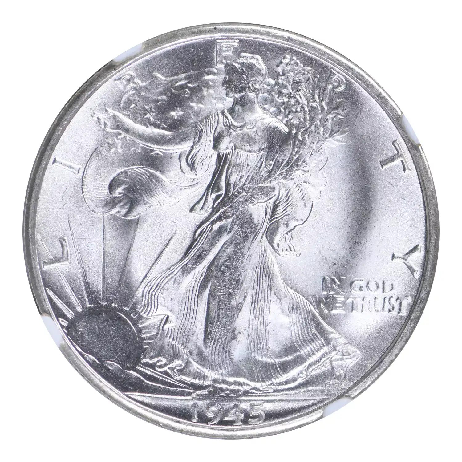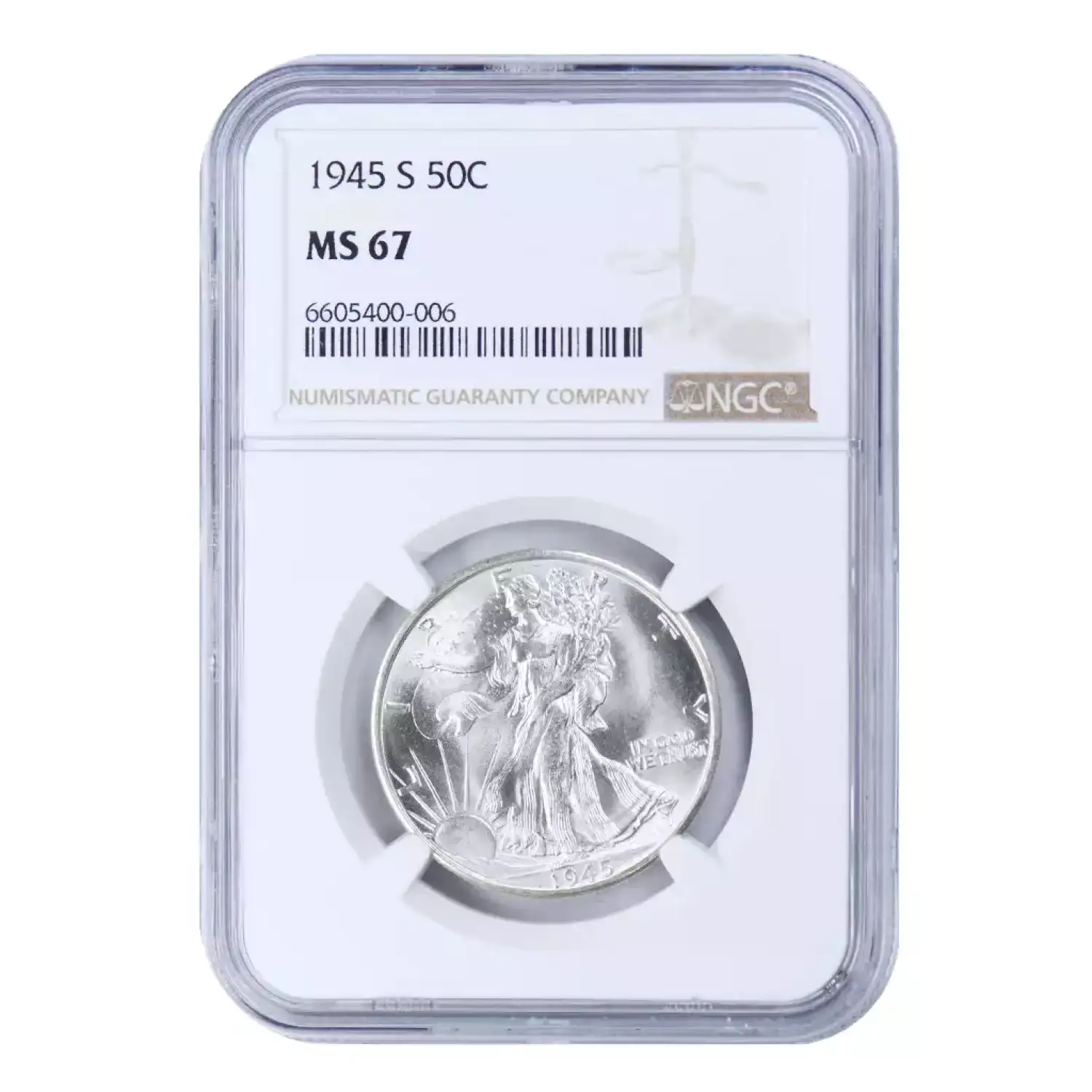 1945-S 50c NGC MS67. Blast white surfaces are complimented by blinding luster. Nicely struck and impressively well preserved. A conditional rarity in superb gem example, much scarcer than its Philadelphia mint counterpart. An excellent candidate for a high grade registry set of walking liberty half dollars.