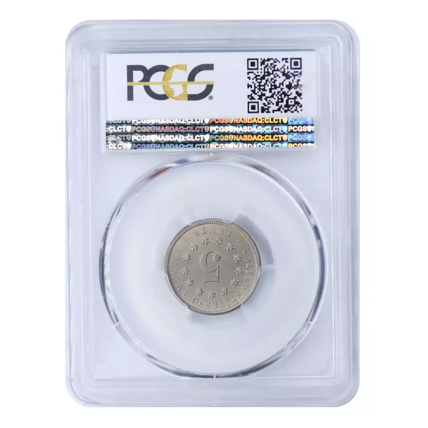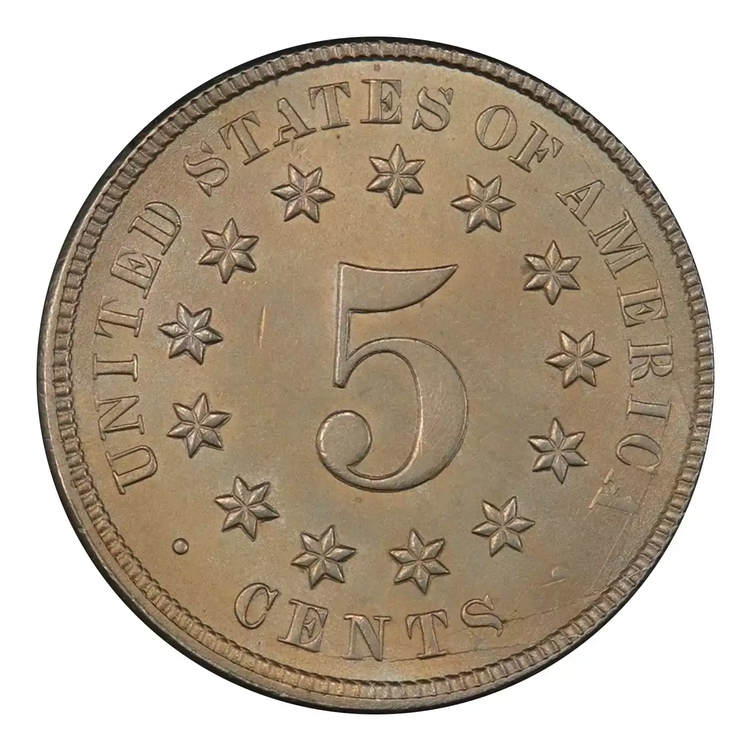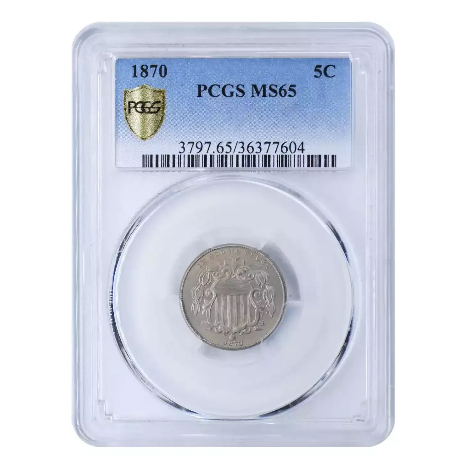 1870 5c PCGS MS65. A beautiful gem example of this type. While shield nickels often suffer from weak strikes, this piece displays exceptionally well rendered shield and star detail. Lightly toned with lustrous satiny surfaces. An excellent candidate for a gem type set, or date set of shield nickels.
