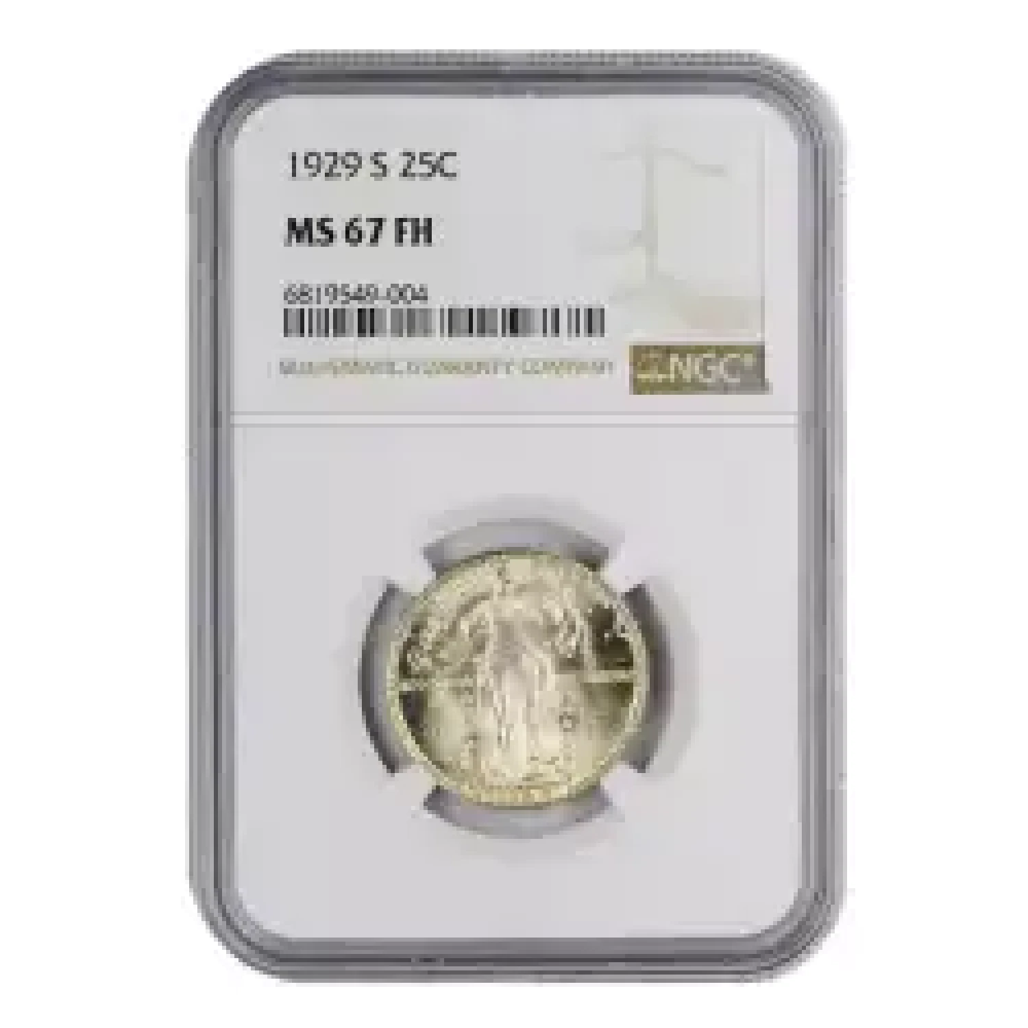 1929-S 25c NGC MS67FH. A delightful superb gem example of this San Francisco mint standing liberty quarter. Excellently struck with abundant luster. Mostly white with touches of gold toning, and remarkably well preserved.