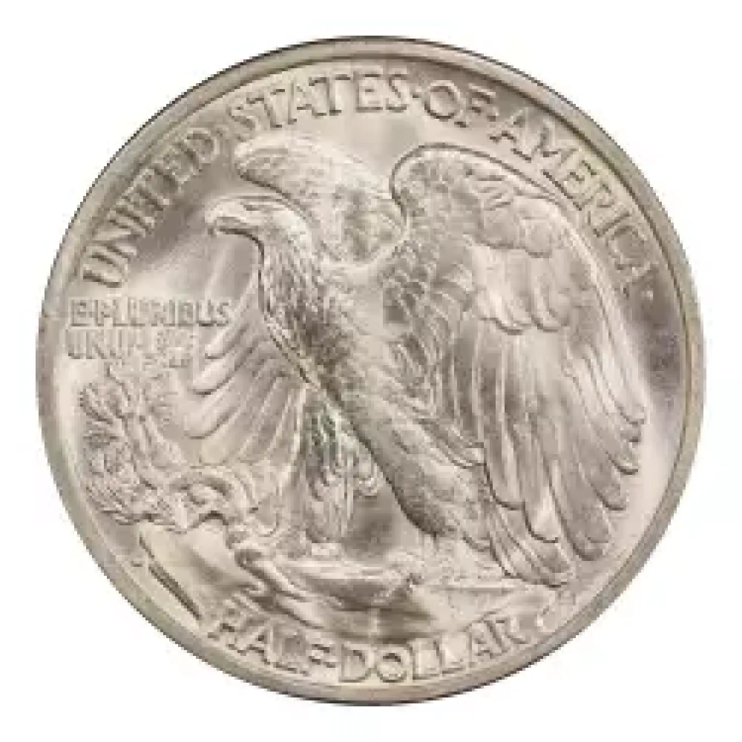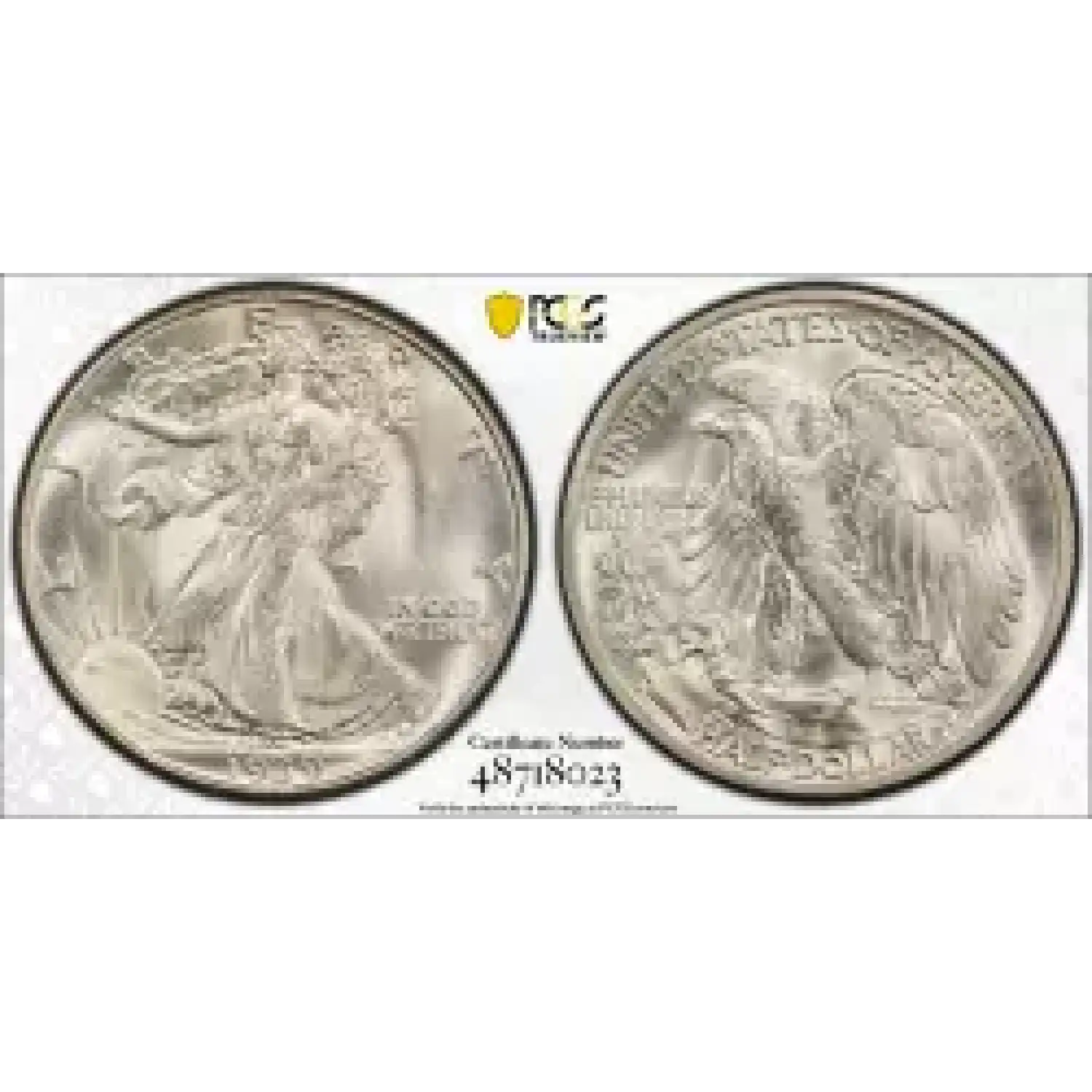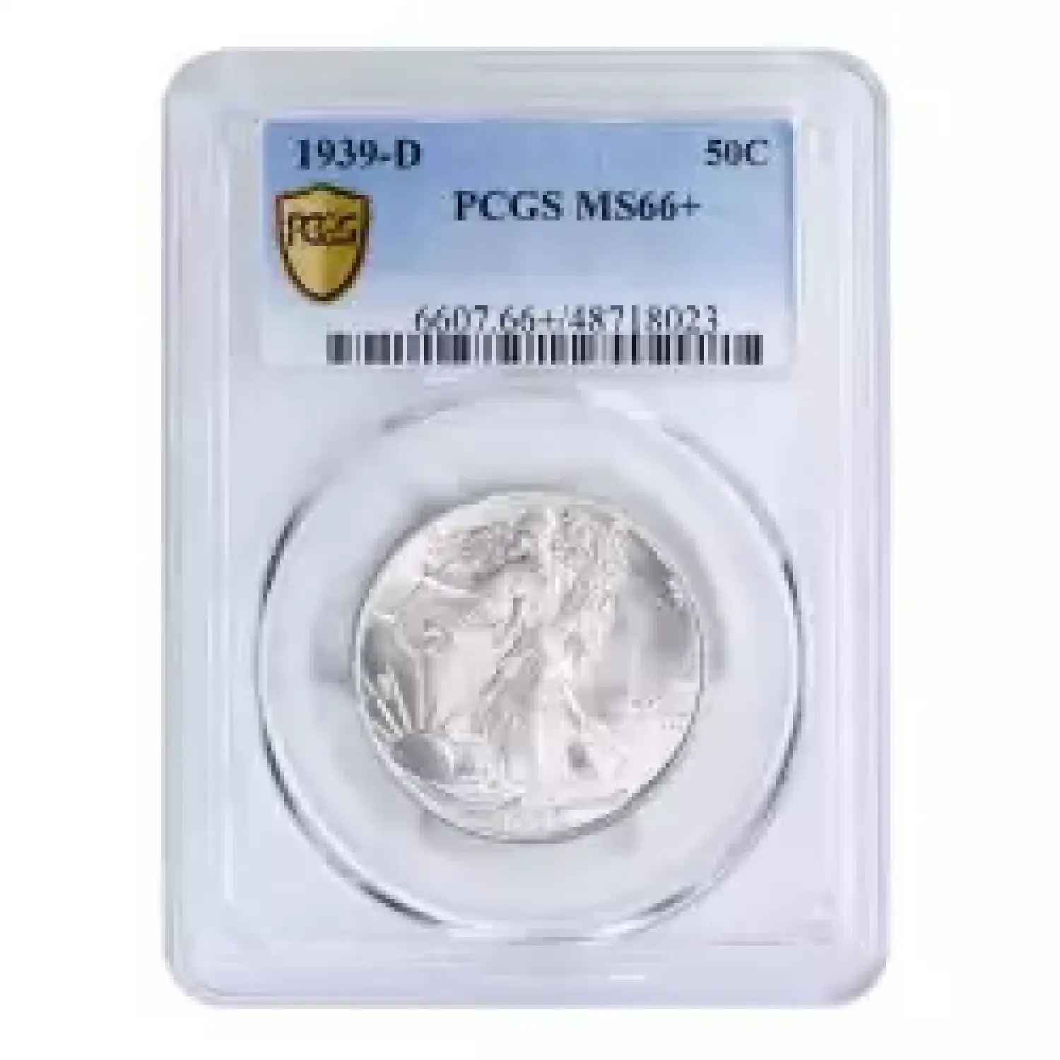 1939-D 50c PCGS MS66+. Abundant frosty swirling luster throughout. Blast white with no spots or environmental issues. Well struck, especially for the date. This gem San Francisco mint half dollar is sure to look at home in a high grade walking liberty set.