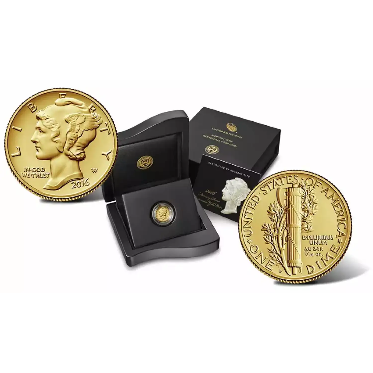 The U.S. Mint issued these 2016-W 1/10 oz Gold Mercury Dimes in celebration of the 100th anniversary of Adolph A. Weinman's famous 1916 Mercury Dime.
