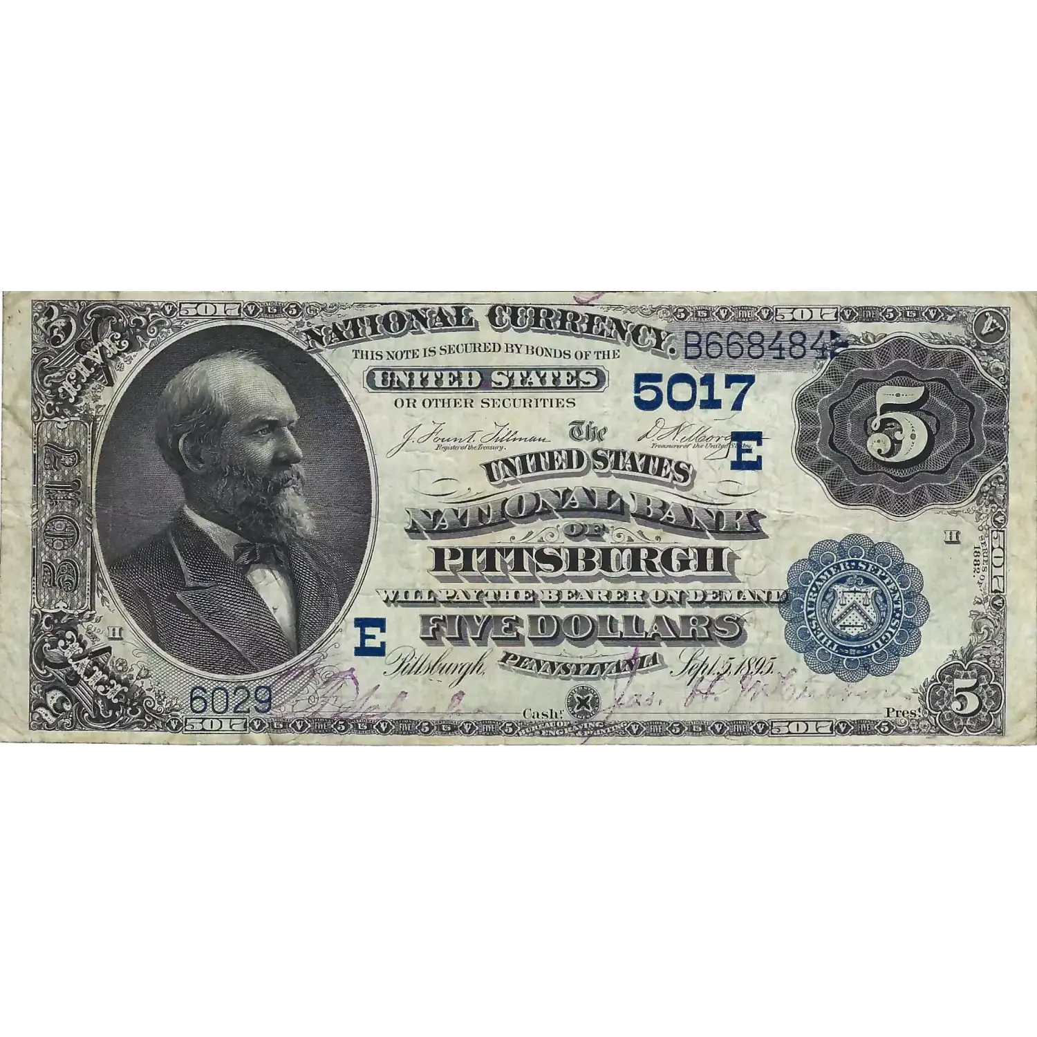 1882 $5 Large Size National Bank Note, U.S. National Bank, Pittsburgh, PA Circulated. This is the exact note you will receive.