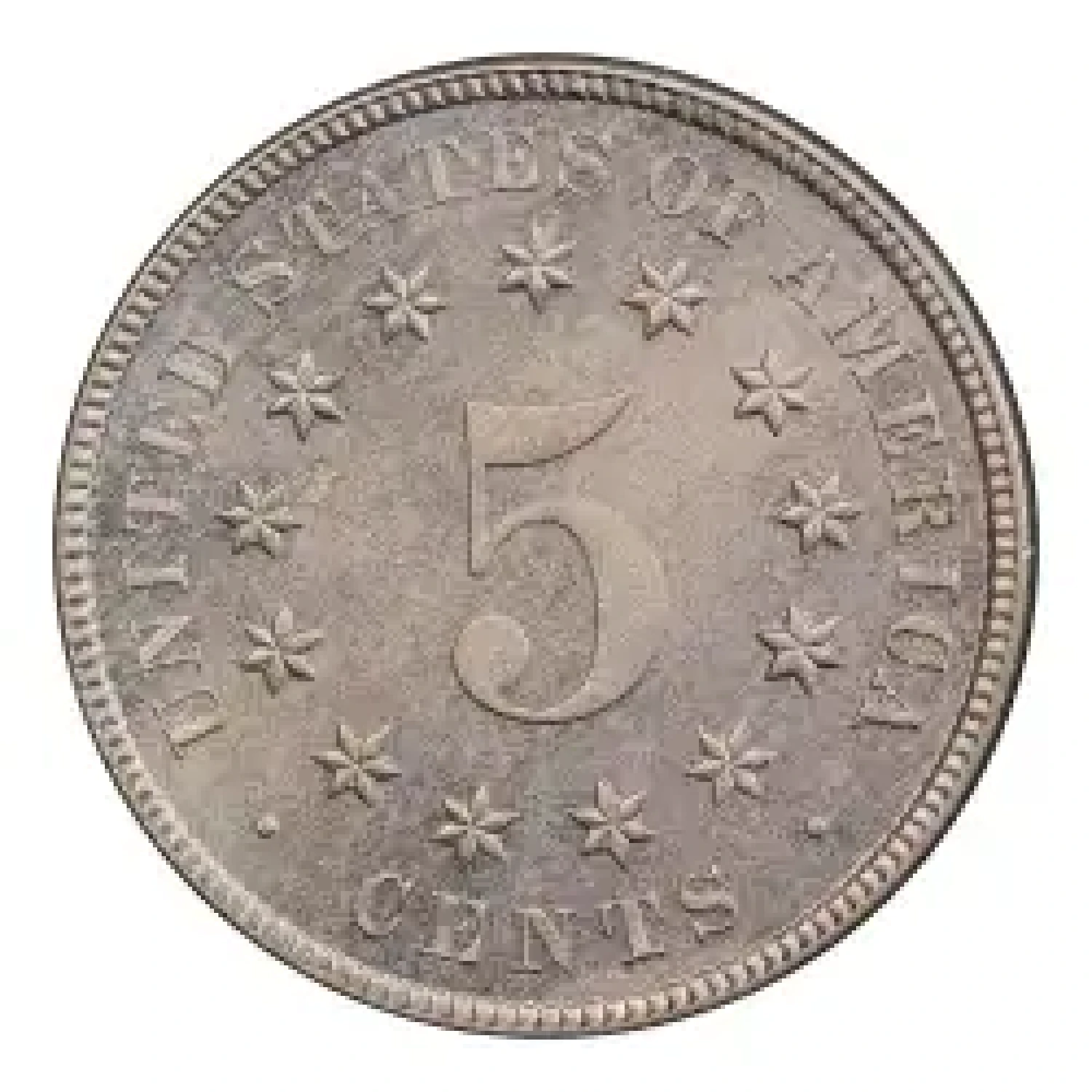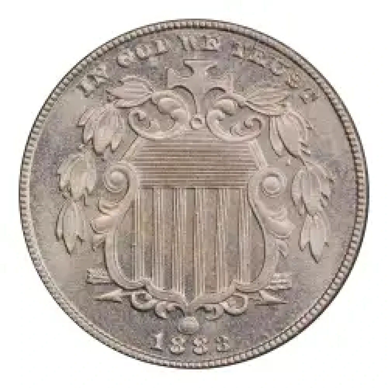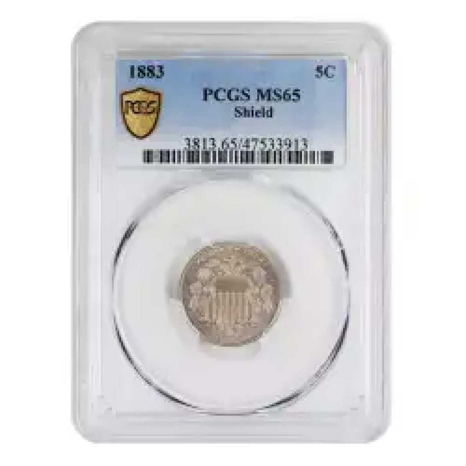 1883 Shield 5c PCGS MS65. Excellently struck with frosty luster. Free of any large marks or distracting spots. An excellent candidate for a gem type set, or set of shield nickels.