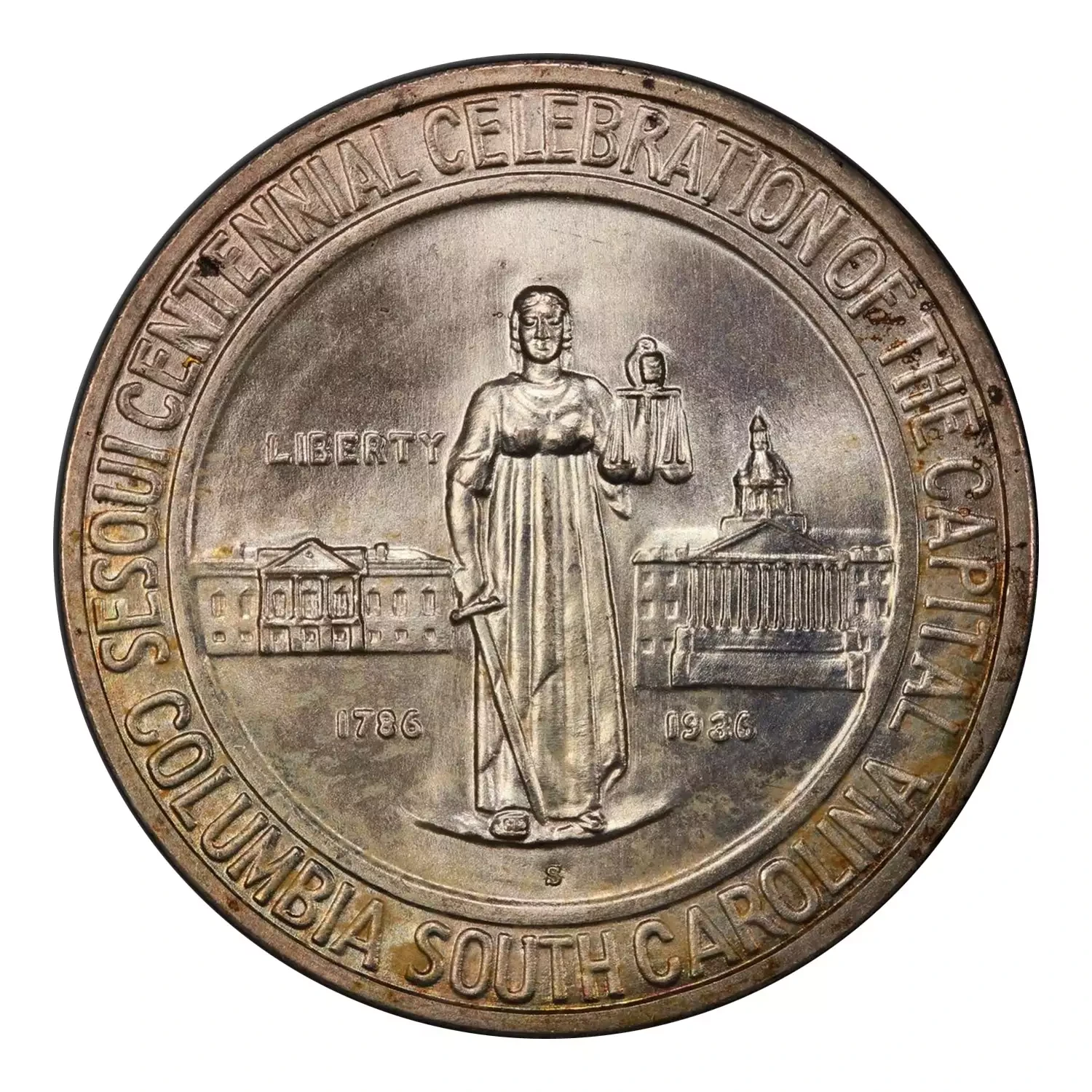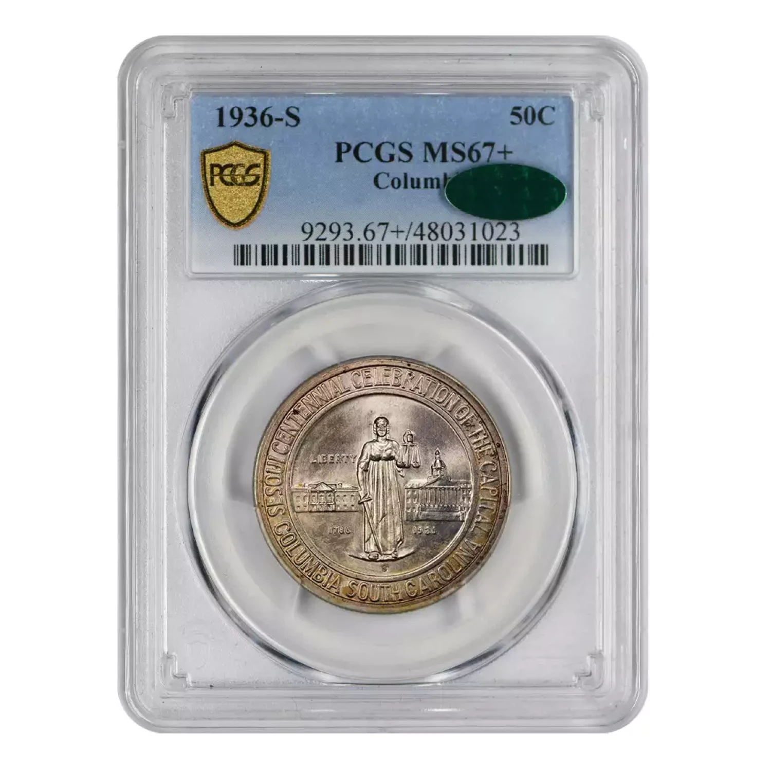 1936-S Columbia 50c PCGS MS67+, green CAC sticker. A stunning superb gem example of this low mintage piece. The San Francisco mint struck just 8,007 half dollars commemorating the semi sesquicentennial anniversary of Columbia, SC. The example offered here displays radiant luster, and impeccably well preserved surfaces. An excellent candidate for a high grade CAC approved set of classic commemorative half dollars.