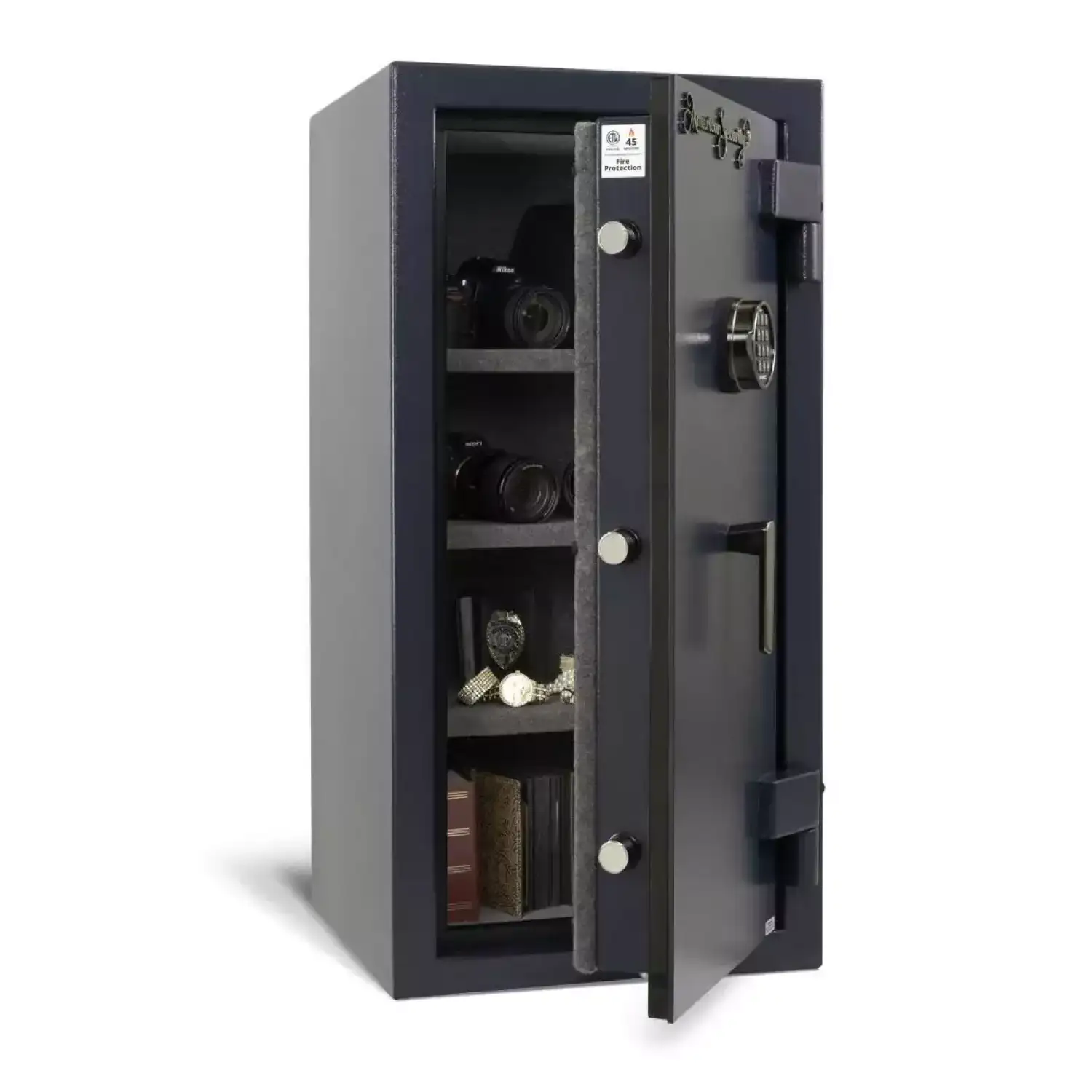 ETL-verified 45-minute fire protection 1/4″ solid steel plate door UL listed E-Lock with illuminated keypad Plush velour interior Deep blue textured paint finish | ||||||||||||||||||||