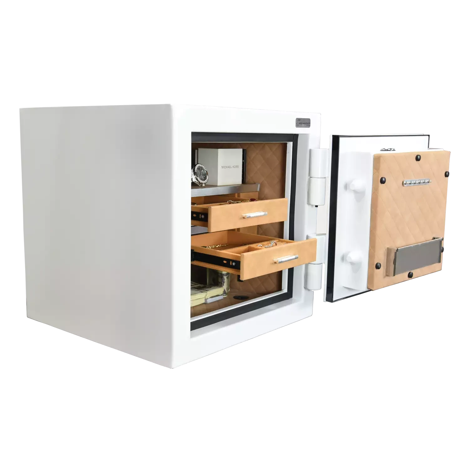 Economical Burglary and Fire Protection: | ETL-verified 45 minute fire protection, 3/16″ solid steel plate door, UL listed E-Lock with illuminated keypad, quilted faux leather interior, and 2 interior drawers |