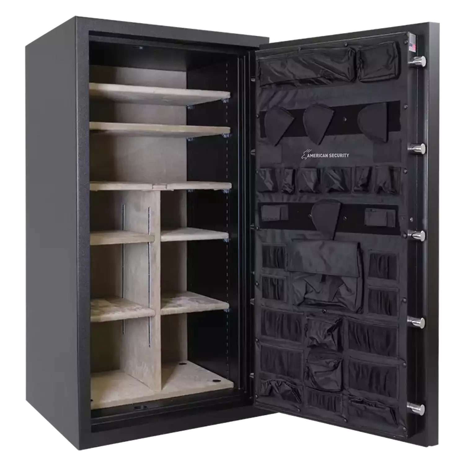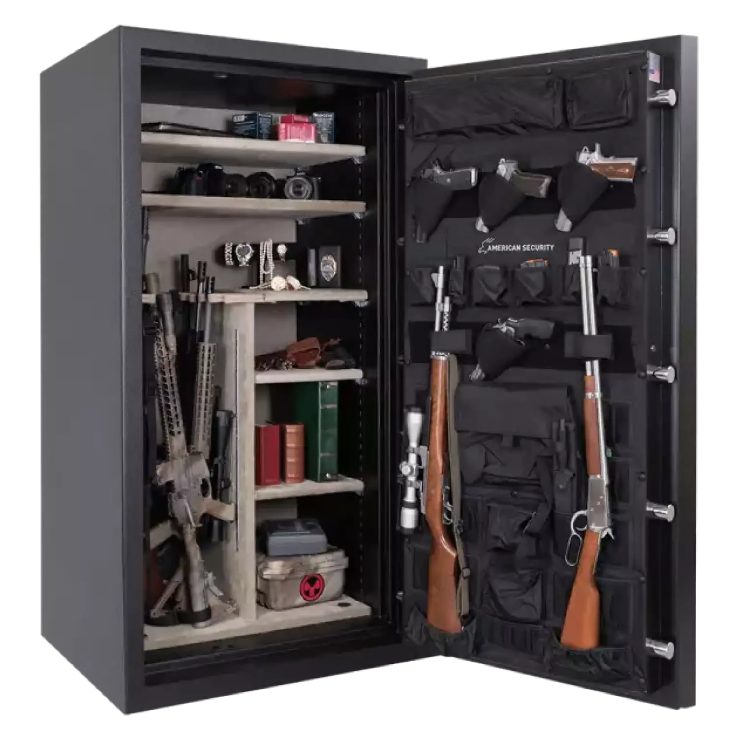 STANDARD FEATURESThe only UL listed TL-30 burglary and fire resistant gun safe on the market. The RFX Series UL listed TL-30X6, six-sided high security gun safes are made in the United States using the latest testing procedures set forth by Underwriters Laboratories. Constructed with a 3″ defense barrier of inner and outer steel plates enclosing a unique interlocking heavy duty steel barrier, 12,000 PSI high-strength concrete and a high-density high-strength ceramic matrix. The high density insulating materials incorporated in the door and body also insure two hours of certified fire protection. The superior design and craftsmanship make the RFX Series impervious to burglary attacks attempted by the most sophisticated equipment utilizied today and the vaults contents against intense fires. Overall thickness of door is 6″ and is constructed with a 3″ defense barrier of outer and inner steel plates creating a single structure enclosing a unique, high density fire and burglary resistant composite material. Expandable Palusol fire seal on door jamb protects against fire and smoke. A reinforced drill resistant door frame protects the door and each individual bolt chamber from severe side attacks. Group 2M Lock is protected by a proprietary patented hard plate, dual external relocker and one internal relocker. Optional auxiliary key lock available. A proprietary inner barrier protects against peeling attacks. 4 pre-cut anchor holes and one (1) pre-cut electrical access hole. | |