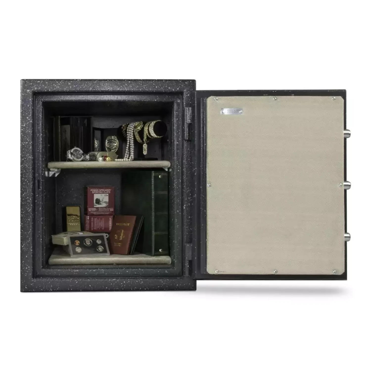 2-5/8″ thick, consisting of 1/8″ outer and inner steel plates creating a burglary resistant structure enclosing a unique proprietary fire resistant material. Three massive 1″ diamter solid steel chrome-plated locking bolts. A full length dead bar locks deep into the body preventing door removal during a forced entry attempt. UL listed Group II lock with spring-loaded auxiliary relock device. 1/4″ Heavy duty carburized hardplate. Heavy duty steel hinges provide easy smooth door operation. One recessed anchor bolt hole and mounting hardware are provided to securely anchor safe. Attractively accented with a large chrome-plated dial, matching handle and plush velour interior. Durable and attractive granite finish or sandstone textured finish.
