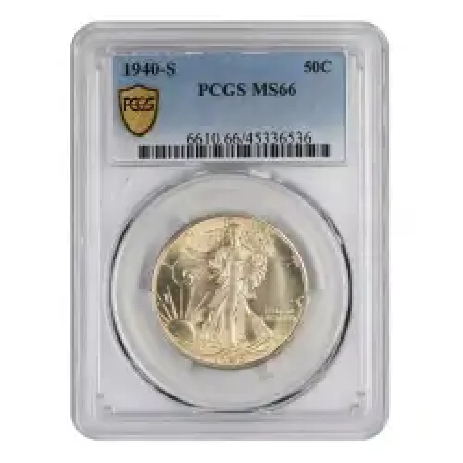 1940-S 50c PCGS MS66. While 1940 San Francisco mint half dollars are common in low uncirculated grades, their scarcity quickly increases in grades higher than MS65. The example offered here features light golden toning with swirling frosty luster. Surfaces are truly excellent, with no seriously distracting flaws. An example deserving of a home in a registry quality walking liberty half dollar set.