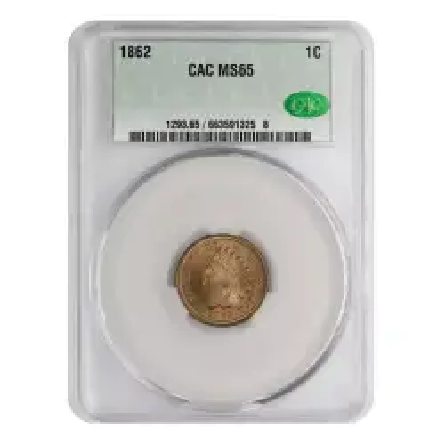 1862 1c CAC graded MS65. At the time of this writing, CAC has graded just four examples of this date in MS65. A beautiful example of this civil war era copper nickel Indian head cent. Excellently struck with radiant luster throughout. Remarkably well preserved with no large contact marks, or spots. An excellent candidate for a set of gem Indian head cents.