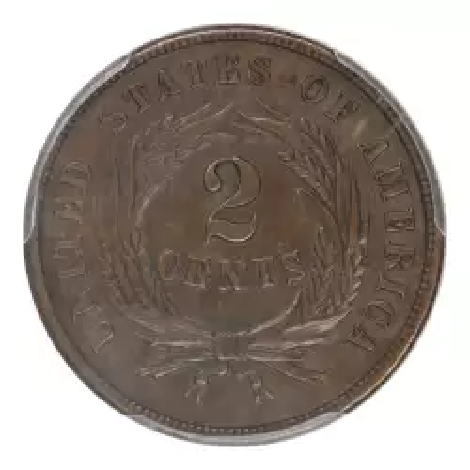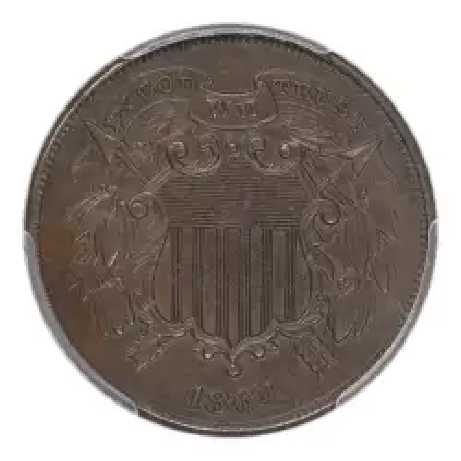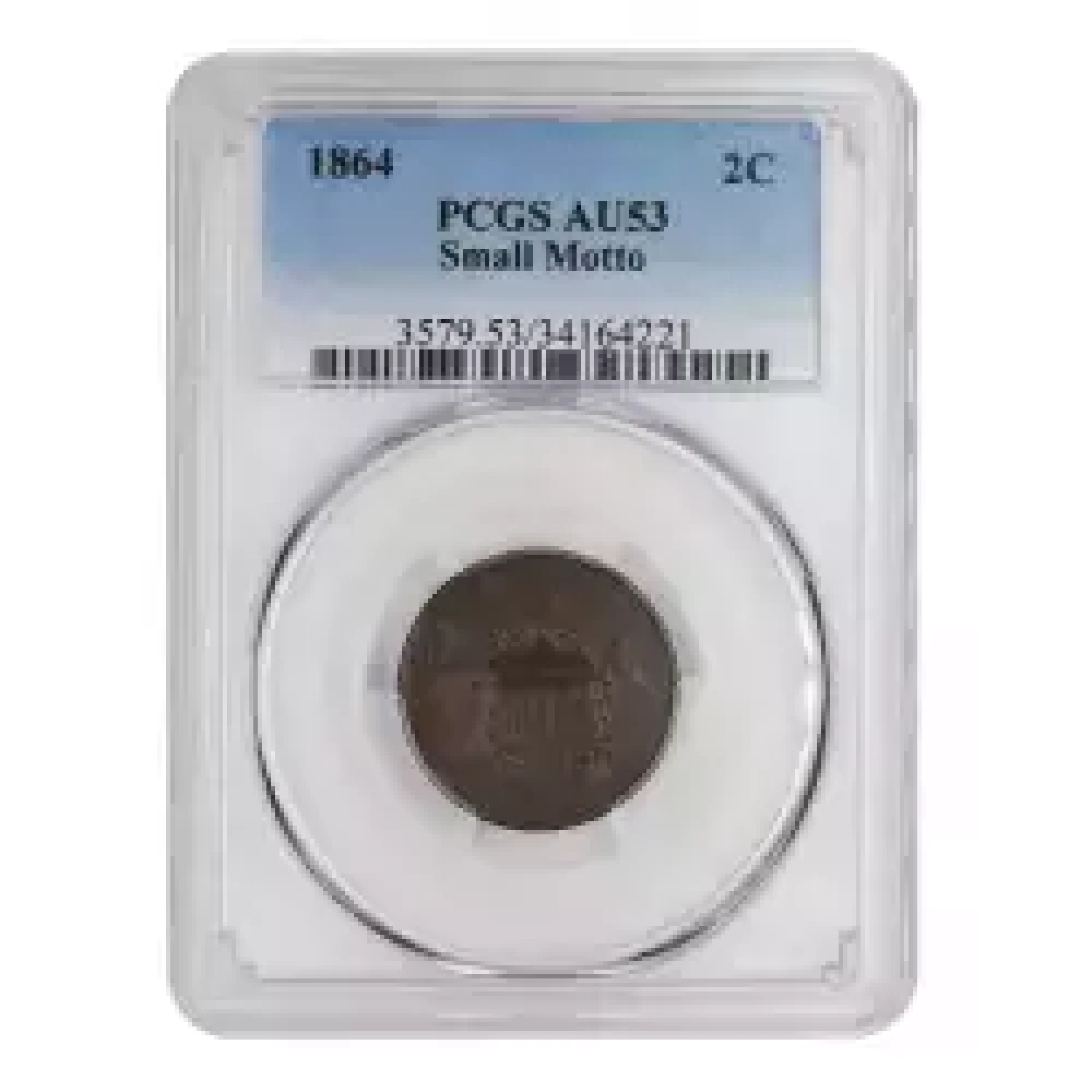 1864 2c small motto PCGS AU53. Significantly scarcer than its large motto counterpart, PCGS has certified just over two dozen 1864 small mottos in this date and grade. Excellently struck with a pleasing deep brown color. Well detailed, showing only the earliest signs of circulation.