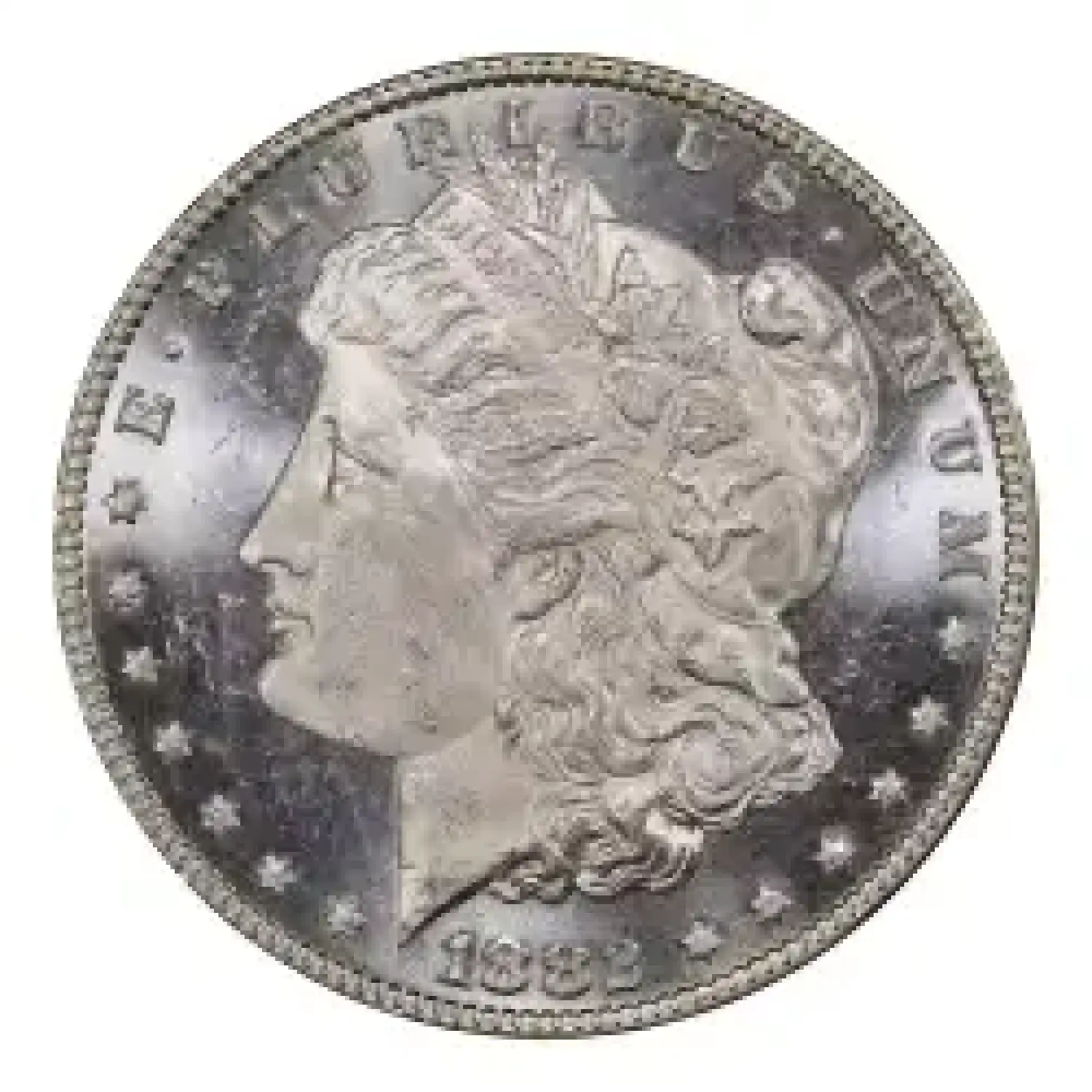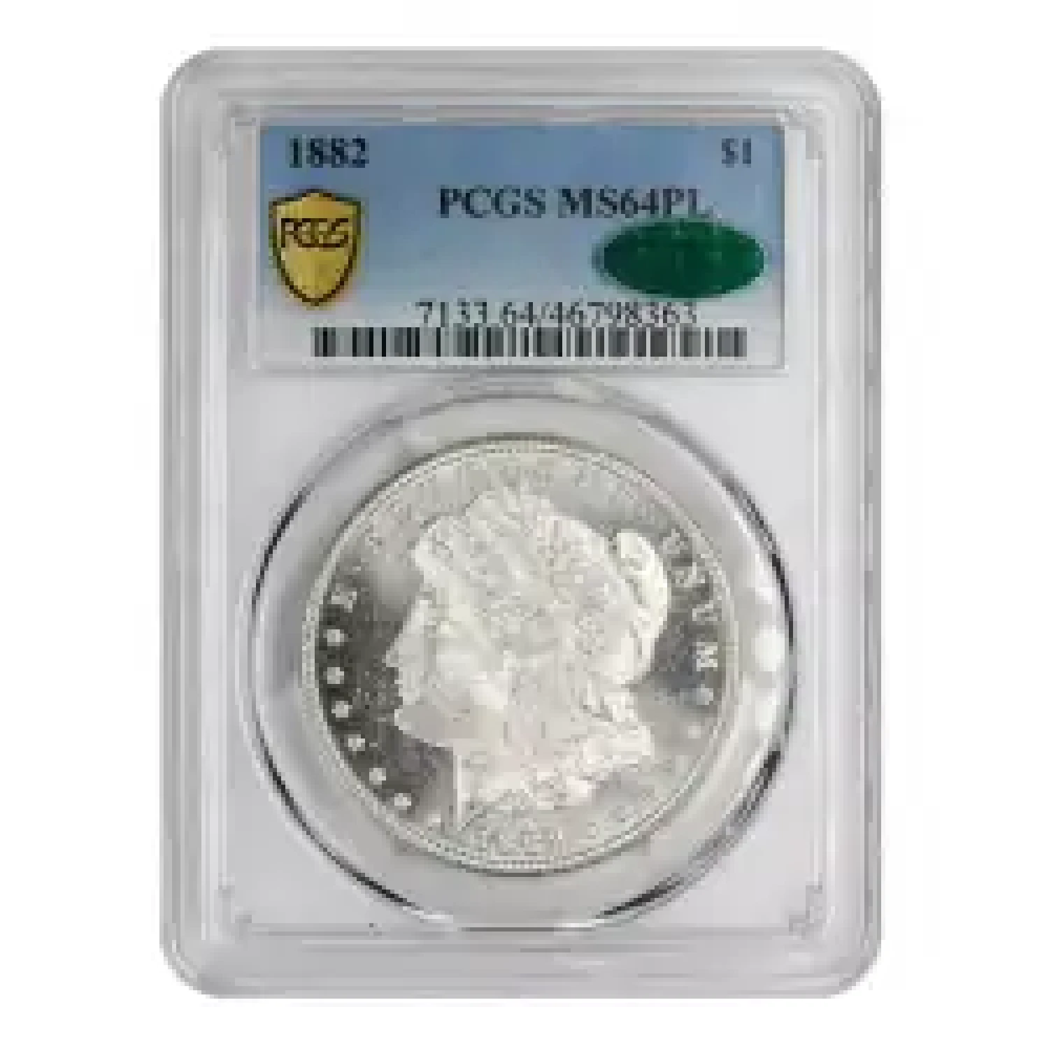 1882 $1 PCGS MS64PL green CAC sticker. CAC population reports indicate just 12 examples approved in this grade. Deep crisp mirrors contrast frosted design elements. The cheek is exceptional for the grade, with no large marks interrupting the frosty finish. Blast white throughout and free of spots or environmental distractions.