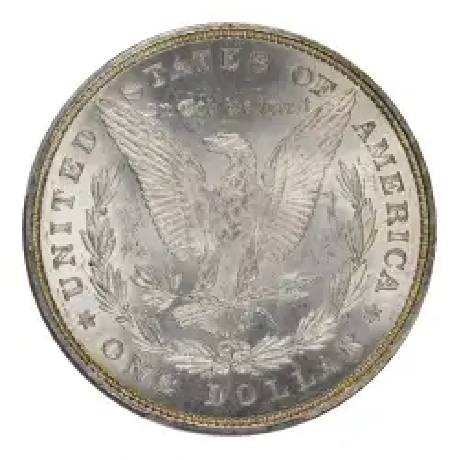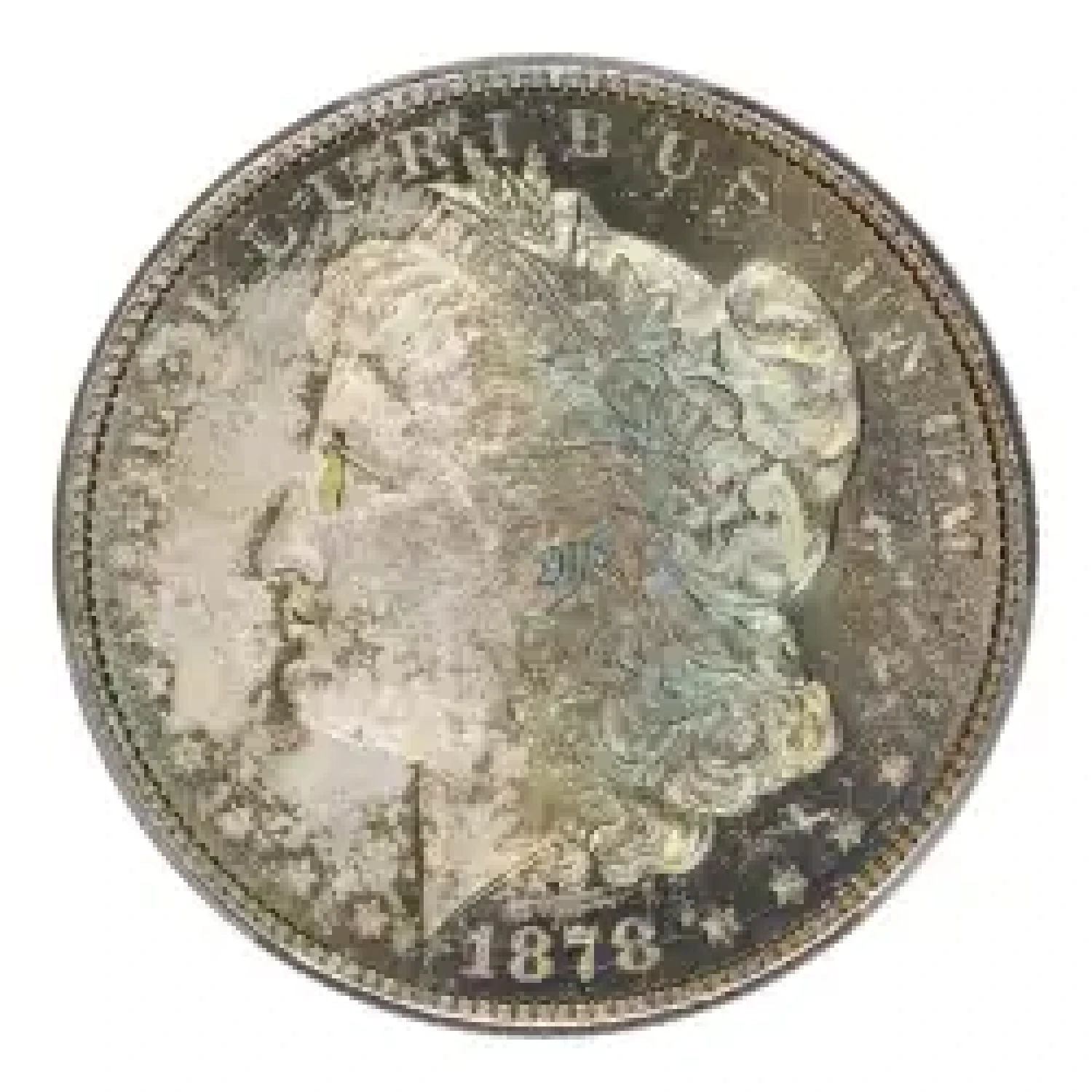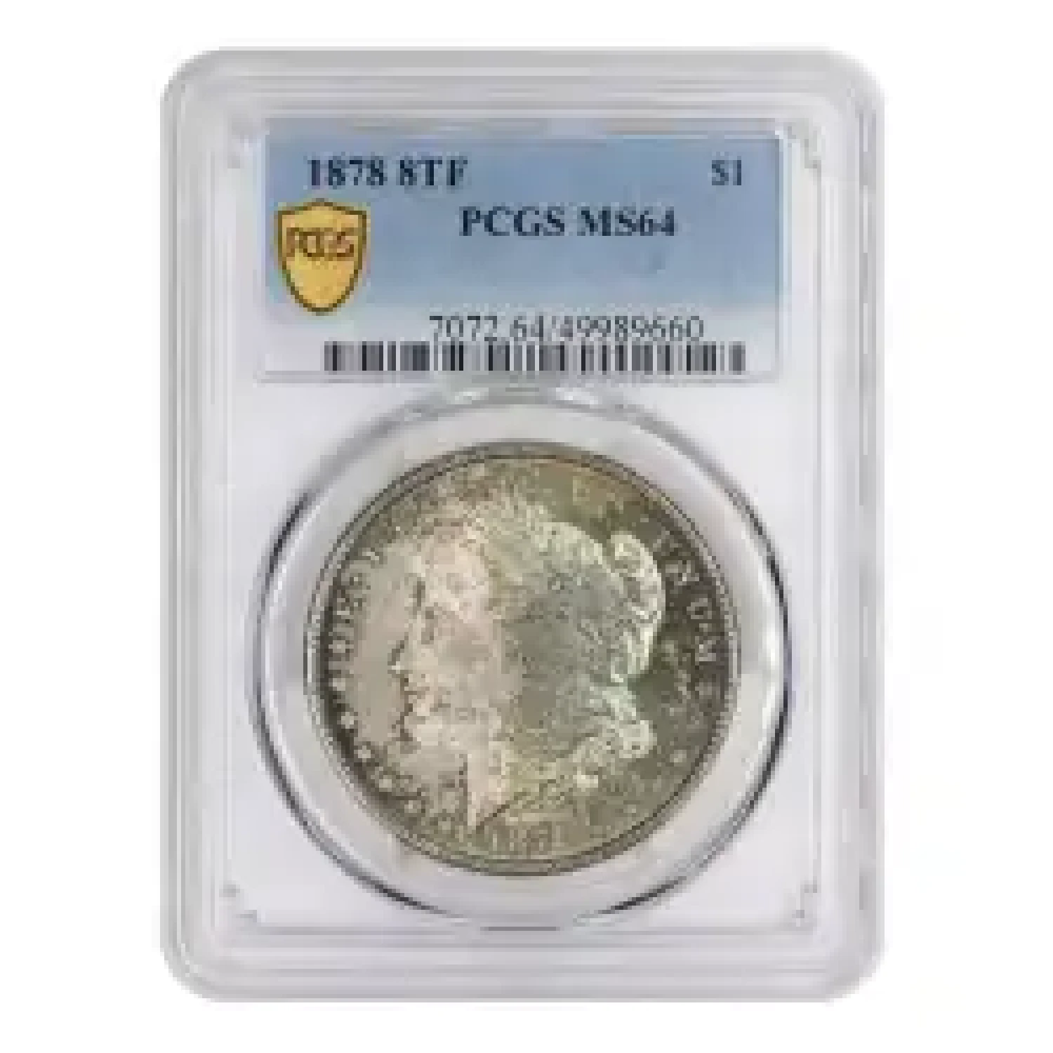 1878 8TF $1 PCGS MS64. This example offers striking originality with blue and green toning throughout. Well struck with abundant luster. Overall a very pleasing example of this first year issue.