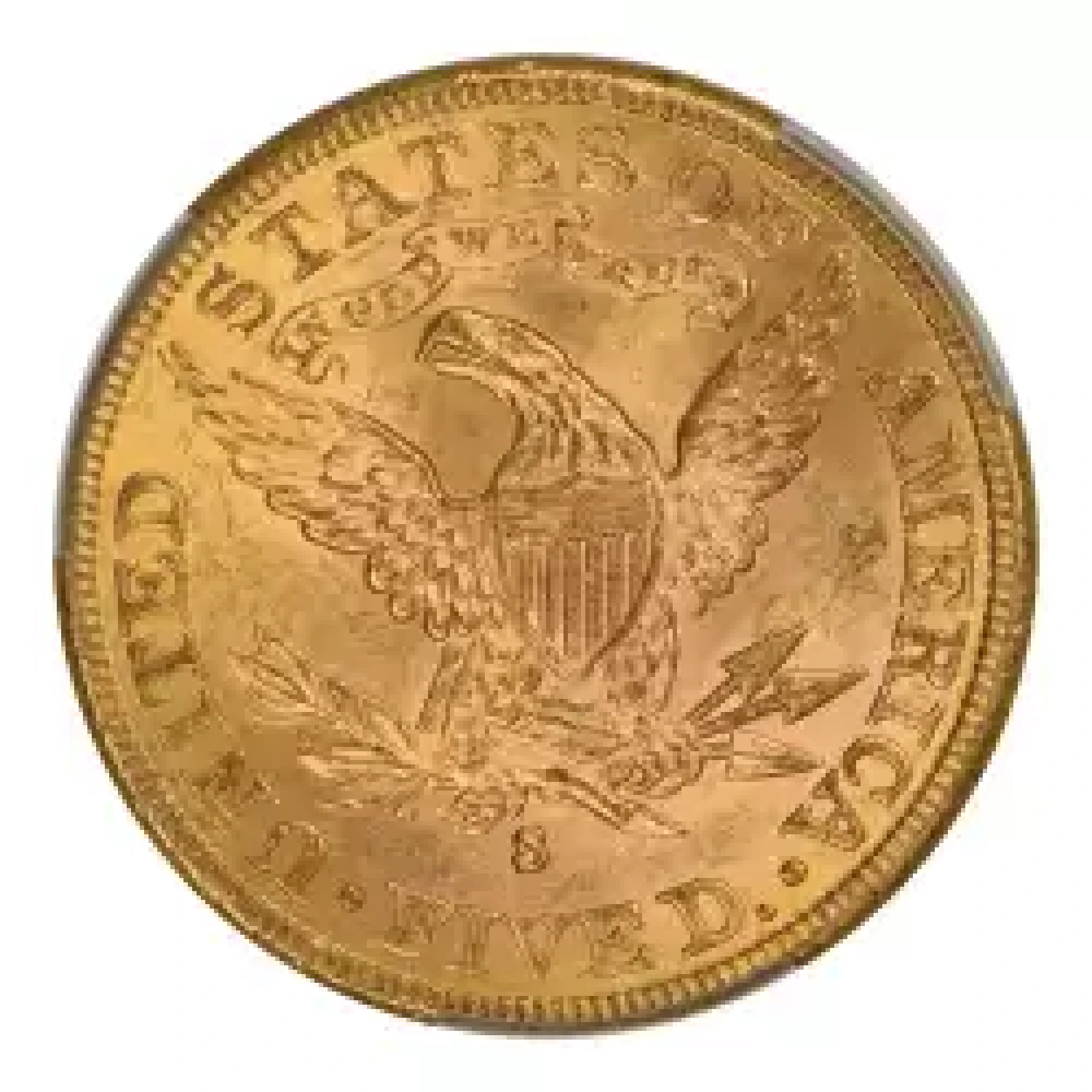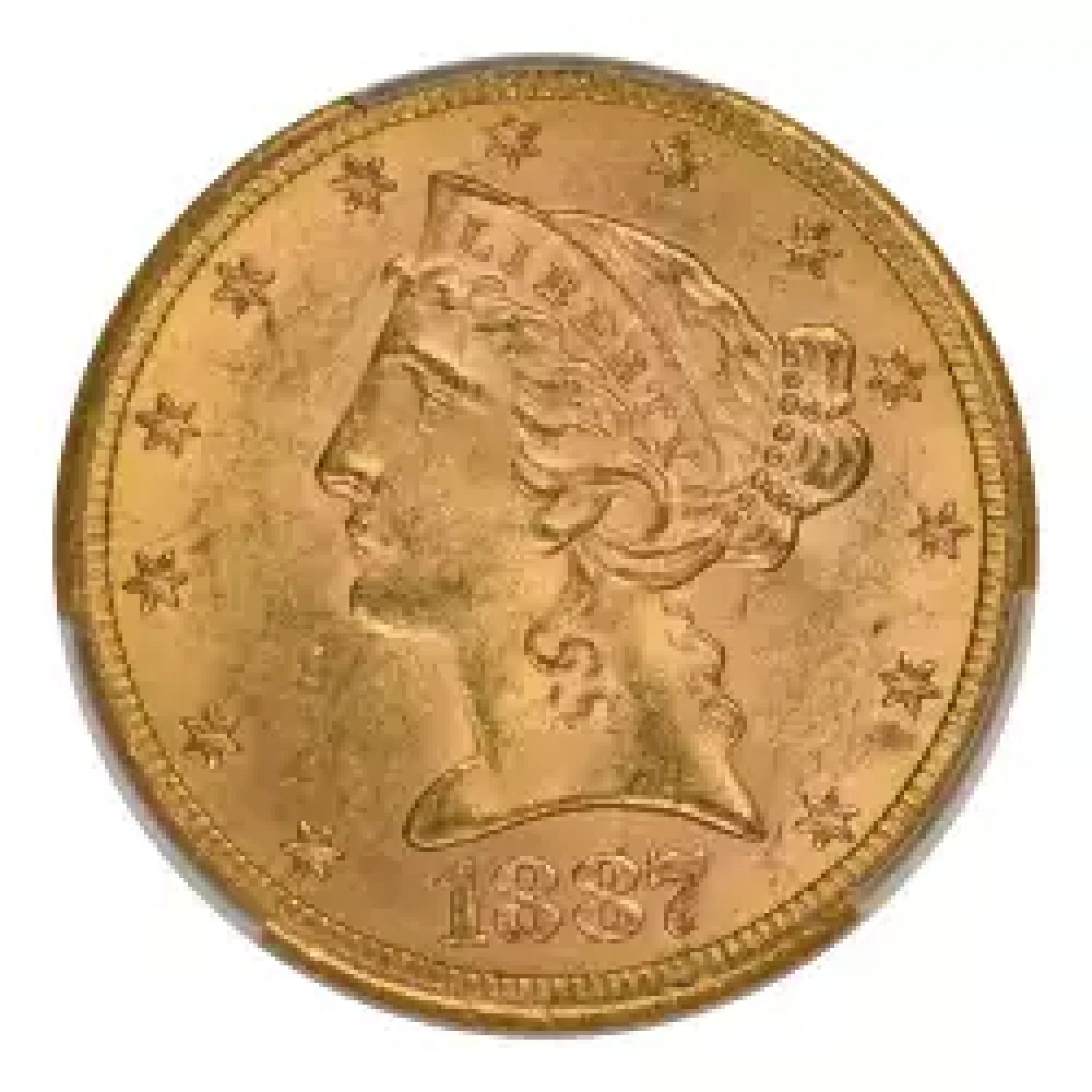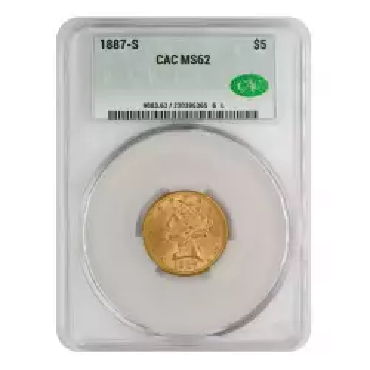 1887-S $5 CAC graded MS62. Swirling luster with rich original gold color. Free of any unsightly large reeding marks that often plague this grade of liberty head half eagles.