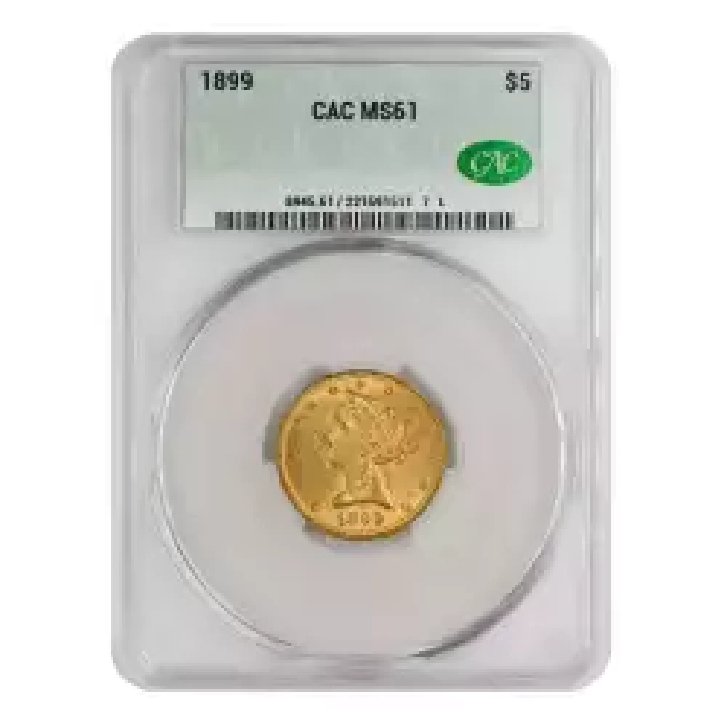 1899 $5 CAC graded MS61. Well struck with entirely original surfaces. Pleasing rich gold color throughout.