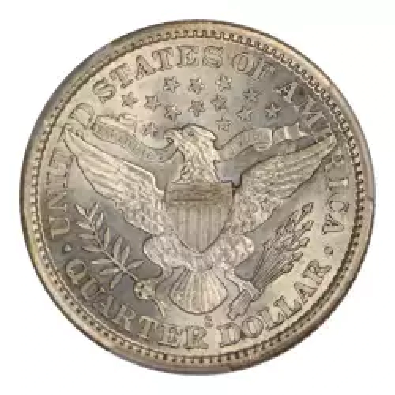 1900-S 25c PCGS AU58. Mostly white with practically full luster. This San Francisco mint Barber quarter shows only the earliest signs of circulation. Well detailed throughout with minimal wear.