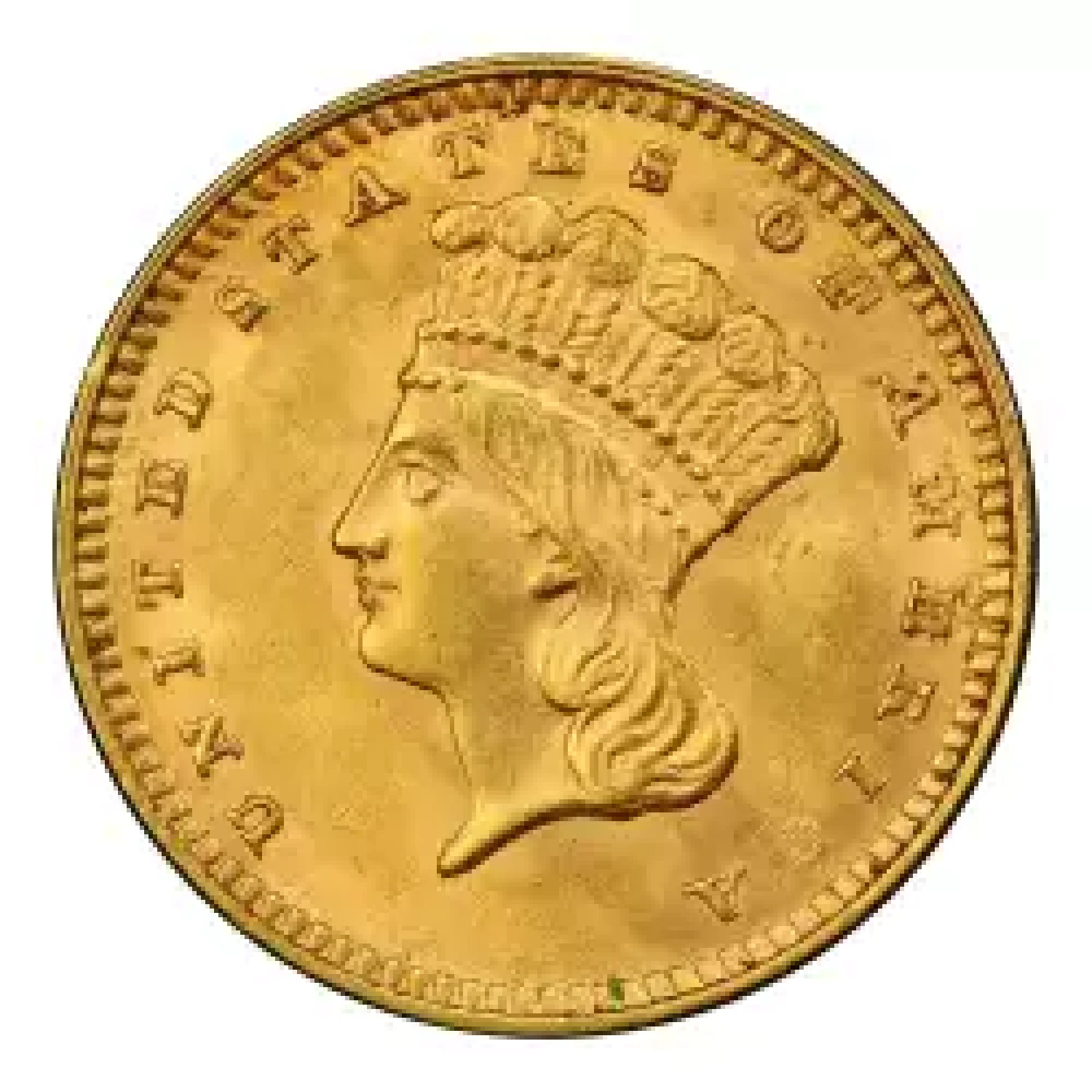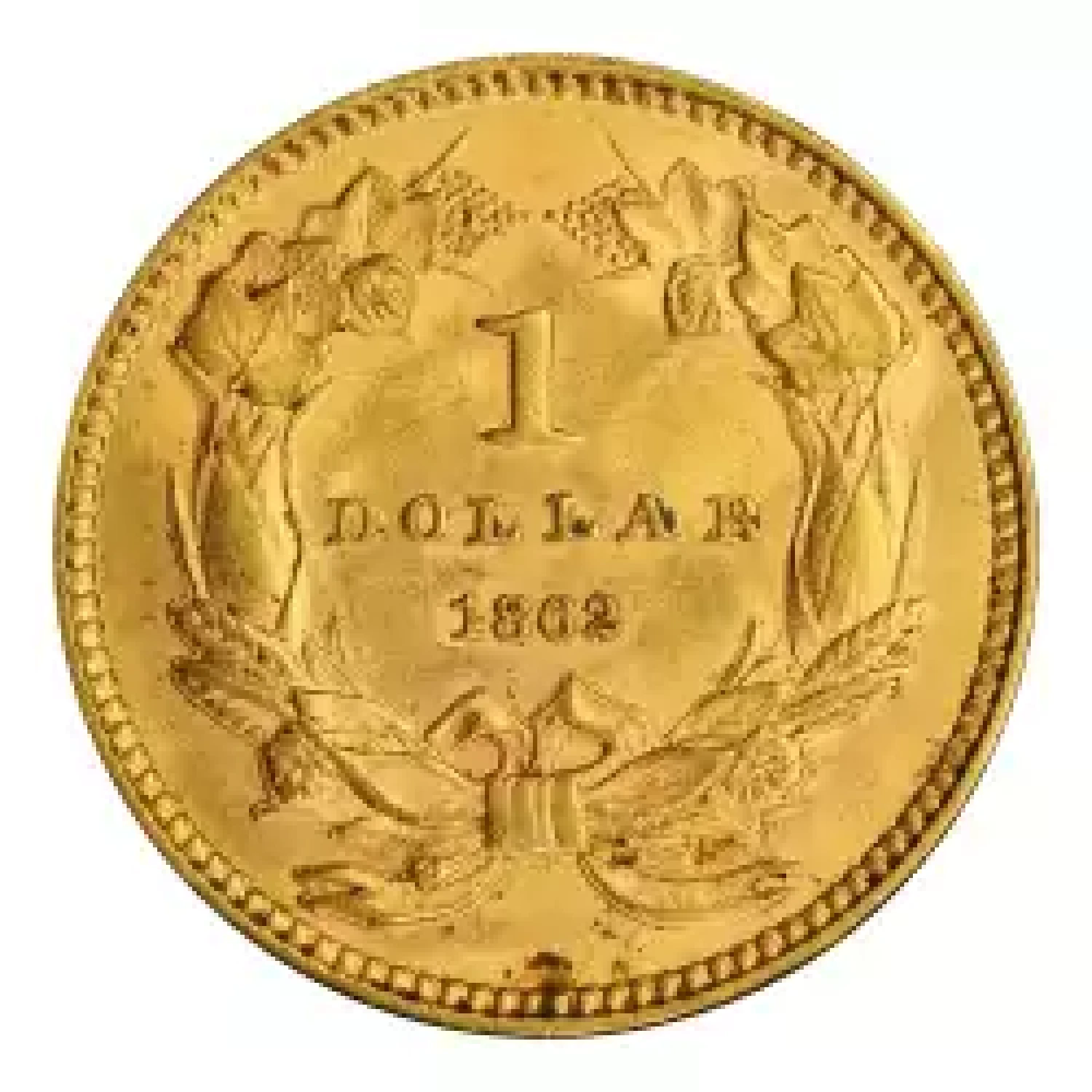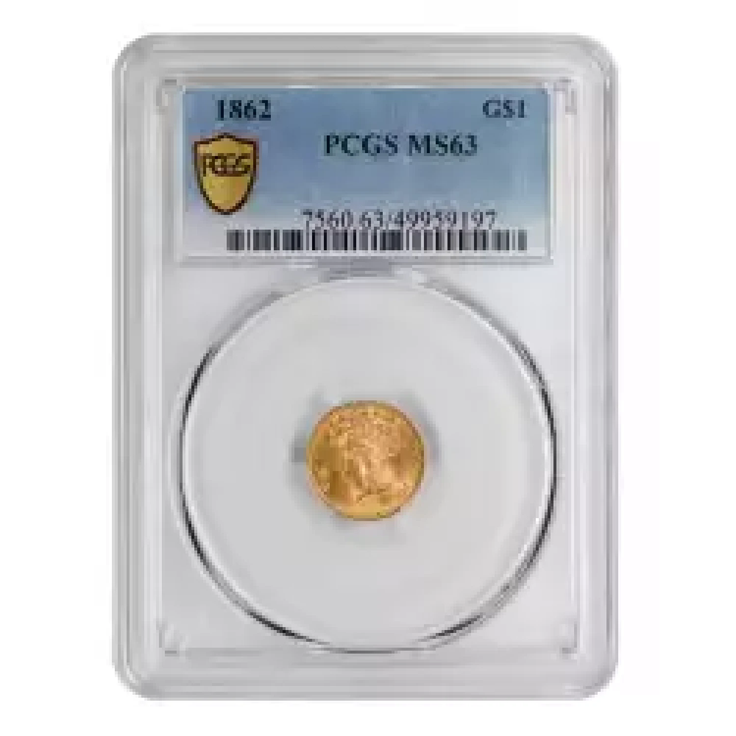 1862 G$1 PCGS MS63. An attractive and original example of this civil war era gold dollar. Well struck with frosty swirling luster. Free of any seriously distracting marks or scratches. An excellent candidate for a gold type set, or date set of gold dollars.