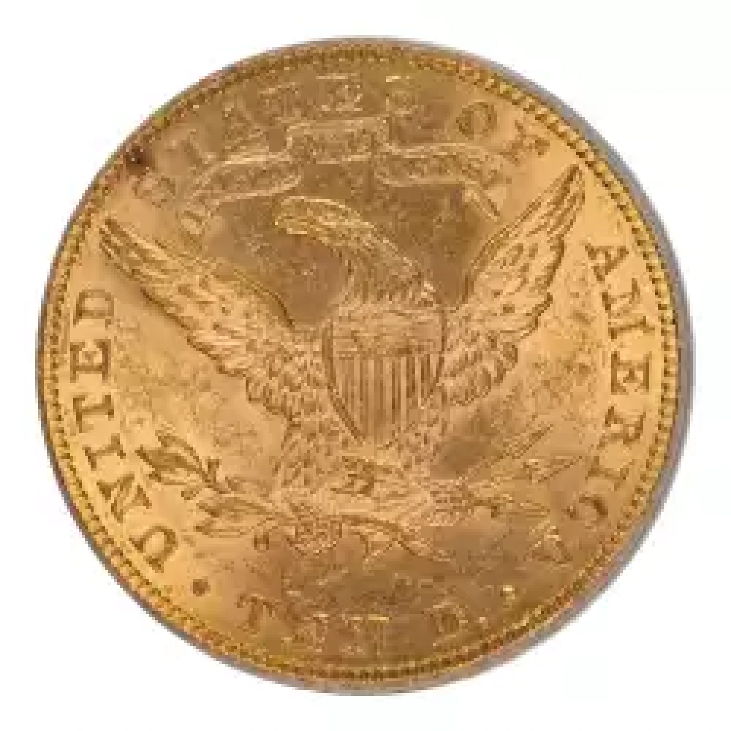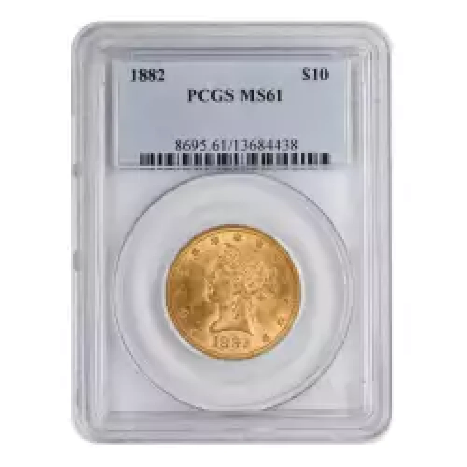 1882 $10 PCGS MS61. An attractive uncirculated example of this series. Even gold color throughout, and wonderfully lustrous. An excellent investment piece offering both numismatic and precious metal value.