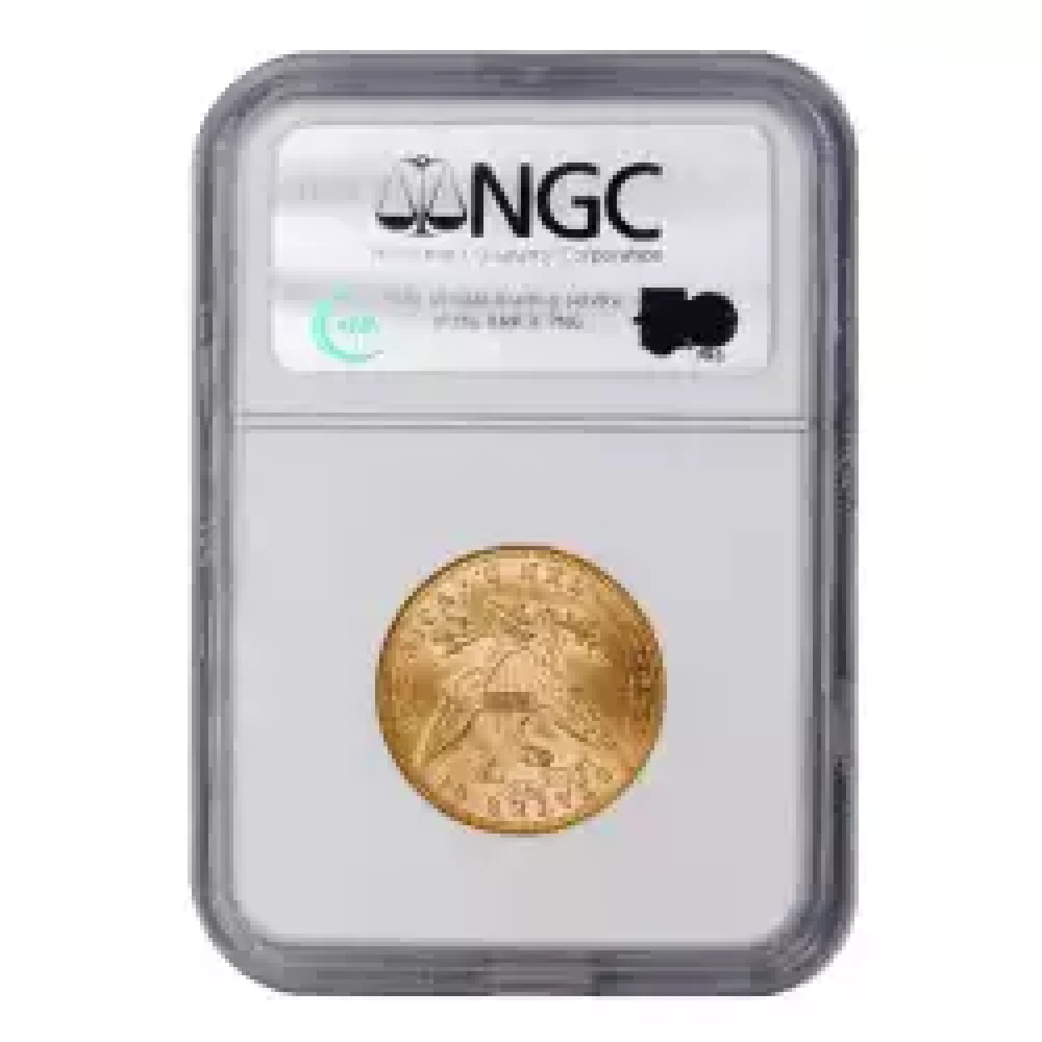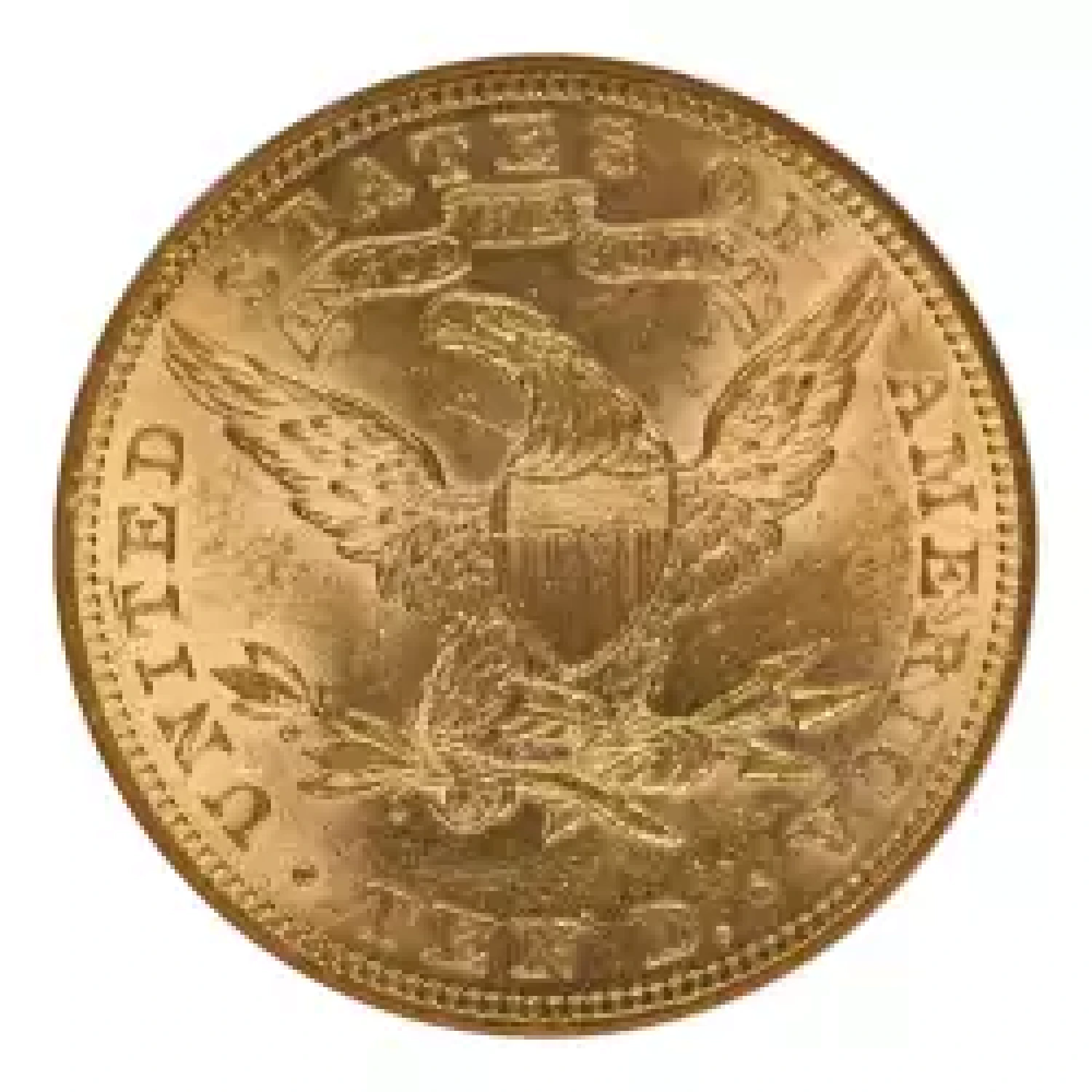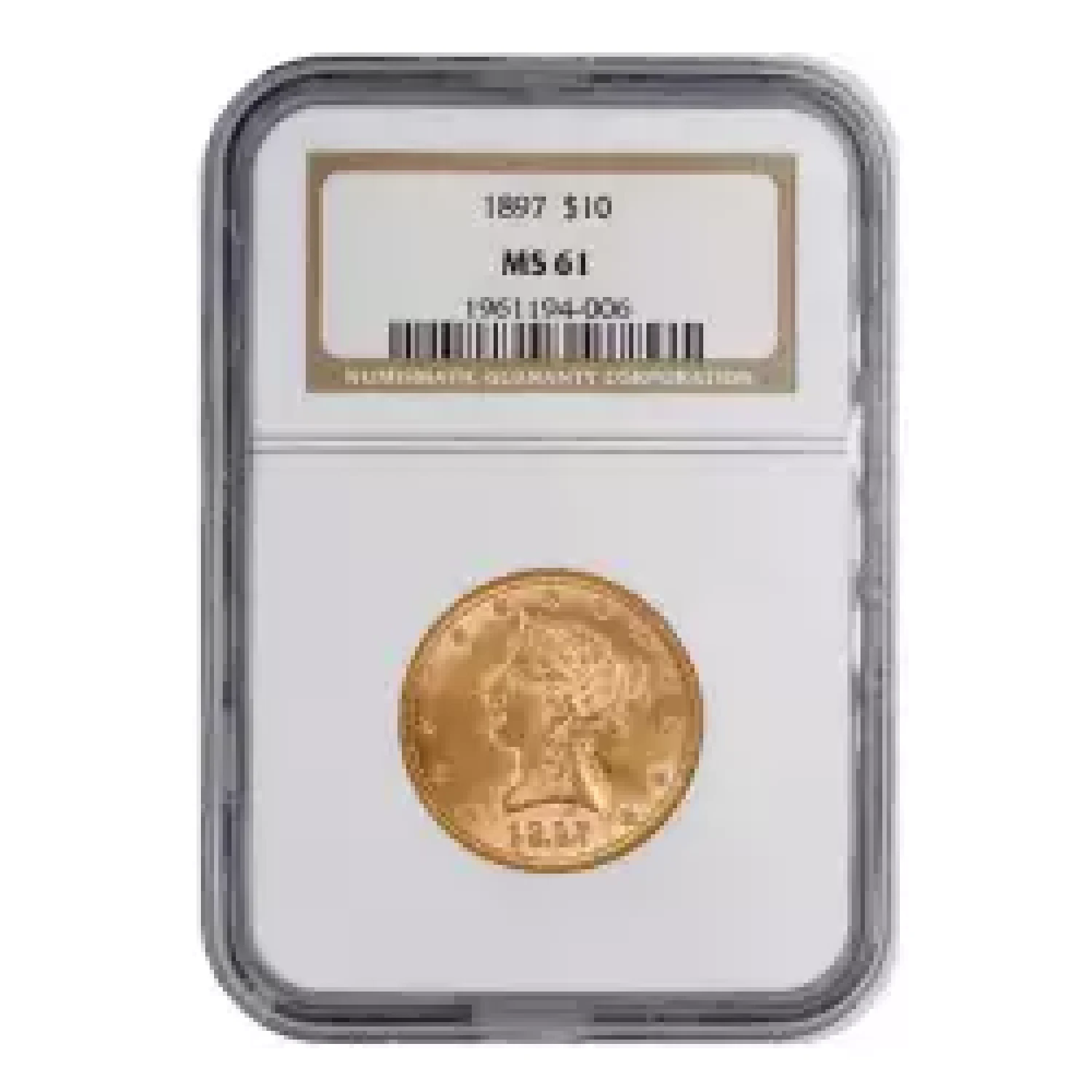 1897 $10 NGC MS61. An attractive uncirculated example of this series. Sharply struck, and wonderfully lustrous. An excellent investment piece offering both numismatic and precious metal value.