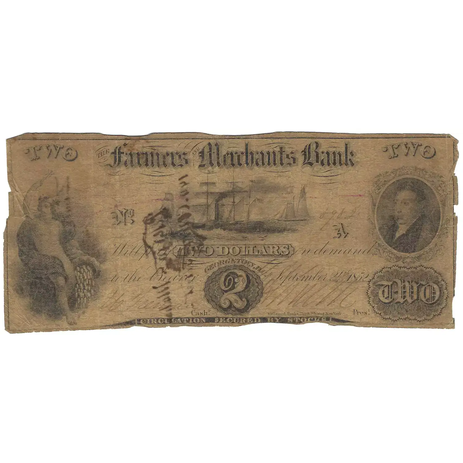 1852 $2 The Farmers and Merchants Bank, Georgetown, DC, Obsolete Bank Note. This is the exact note you will receive.