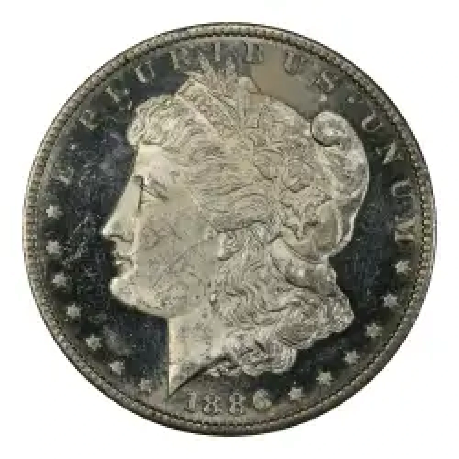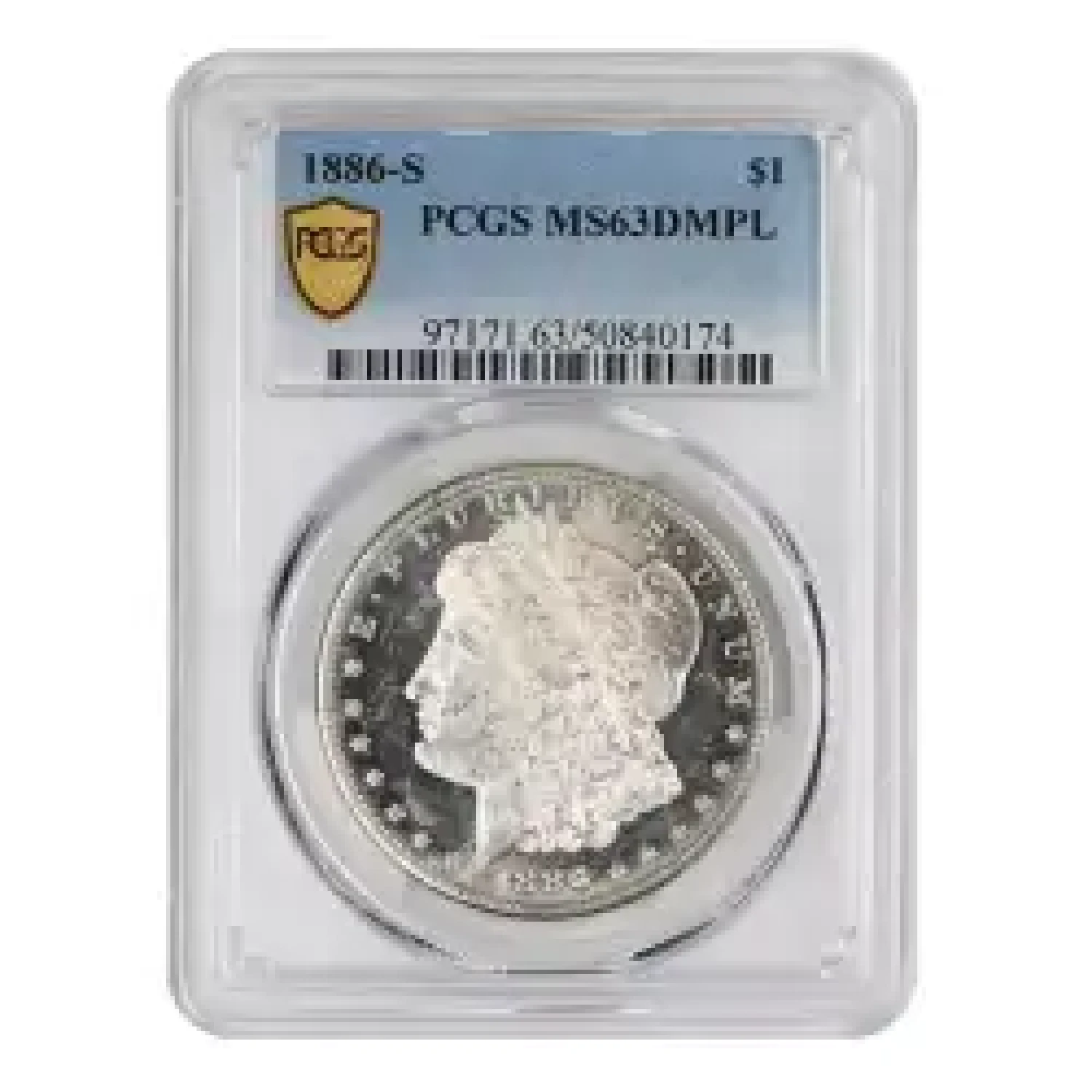 1886-S $1 PCGS MS63DMPL. A truly scarce date with deep mirror prooflike designation! PCGS has graded just 24 examples of this date and mint mark, with just 25 finer DMPL examples in all grades. The example offered here features crisply mirrored fields with impressive depth, contrasted by thickly frosted design elements. Excellently struck and minimally abraded for the grade. This coin would be an outstanding addition to a world class set of DMPL Morgan dollars.