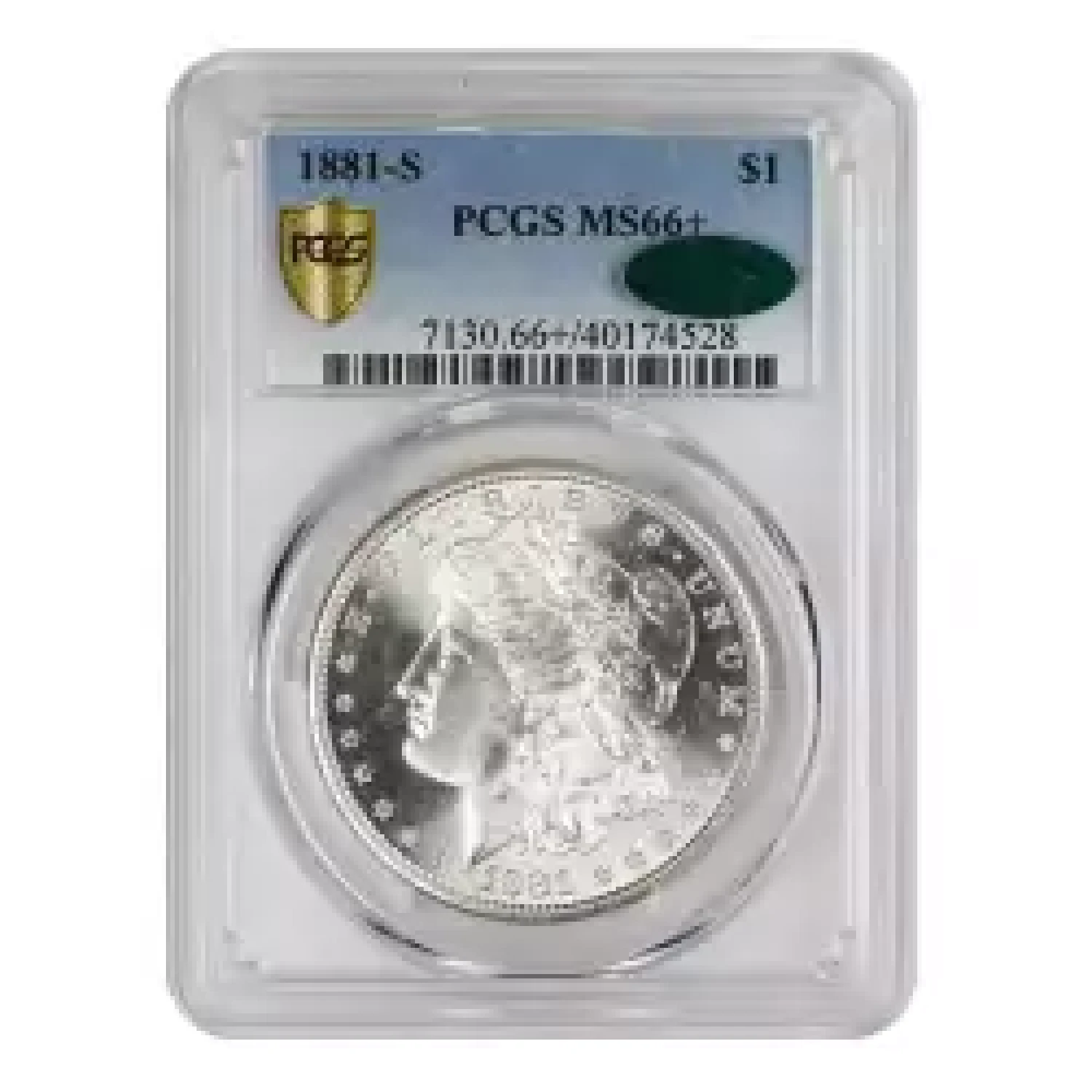 1881-S PCGS MS66+ green CAC sticker. Blast white surfaces with radiant cartwheel luster. Excellently struck and entirely free of any distracting abrasions or spots. Some minor reverse chatter is likely the only thing holding this coin back from grading MS67! This coin is sure to look at home in a CAC approved gem morgan dollar set.
