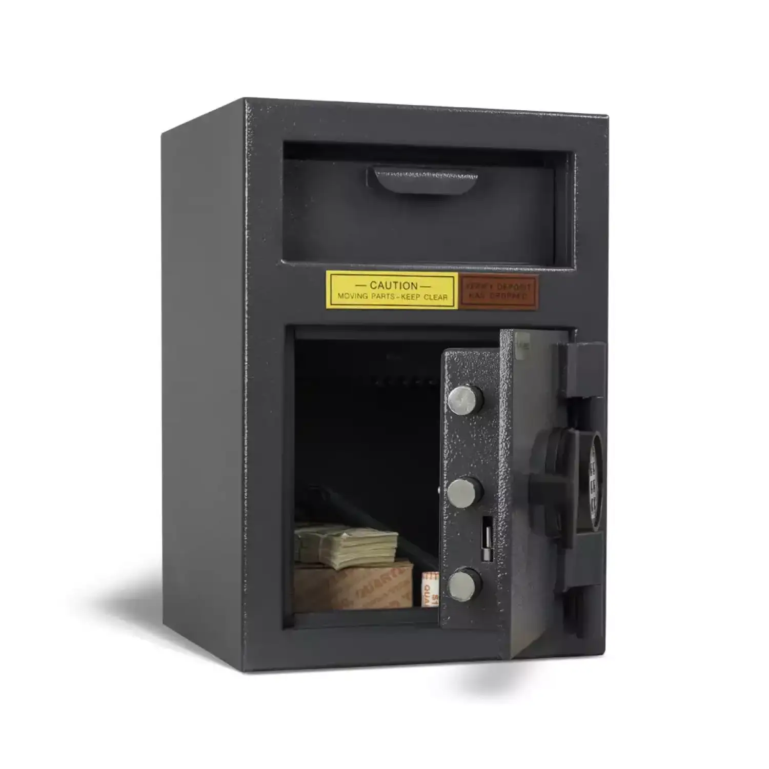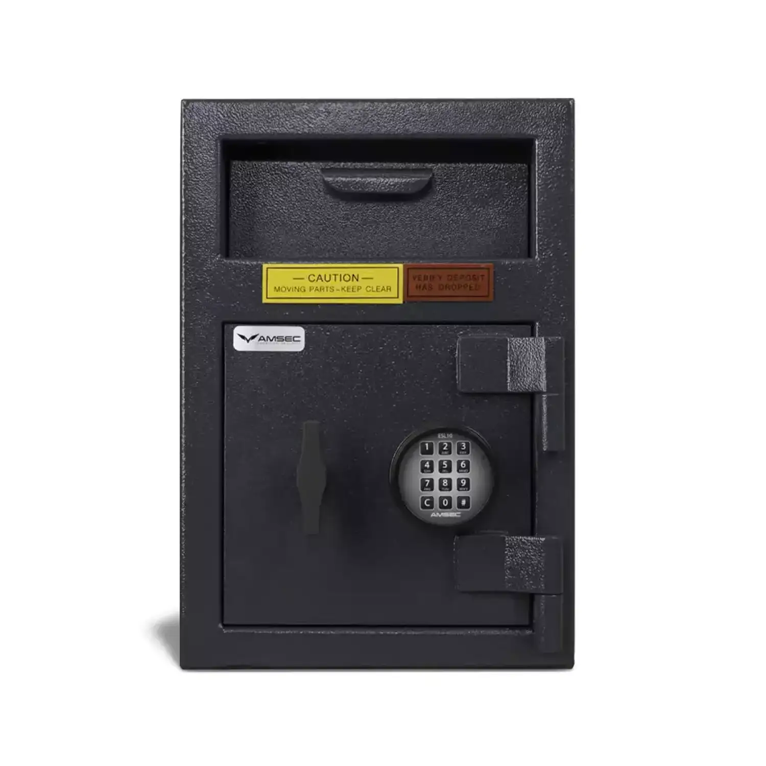 The front-load hopper on the AMSEC Deposit Safe easily handles drops of up to 4 x 2 x 9 inches and provides a saw tooth baffles inside to protect against "fishing". The hinged door allows access to the compartment where the drops are made. This AMSEC Deposit Safe features a solid 1/4" steel body 1/2" steel door with three 1" steel chrome bolts (a feature not found in other less expensive models). Your DSF2014 Depository also has a bolt detent system that activates the bolts when the door is closed; a digital lock (ESL10XL) keeps the door secure. We have also gone the extra step to add a hardened steel plate around the lock and re-locker to protect from drilling.