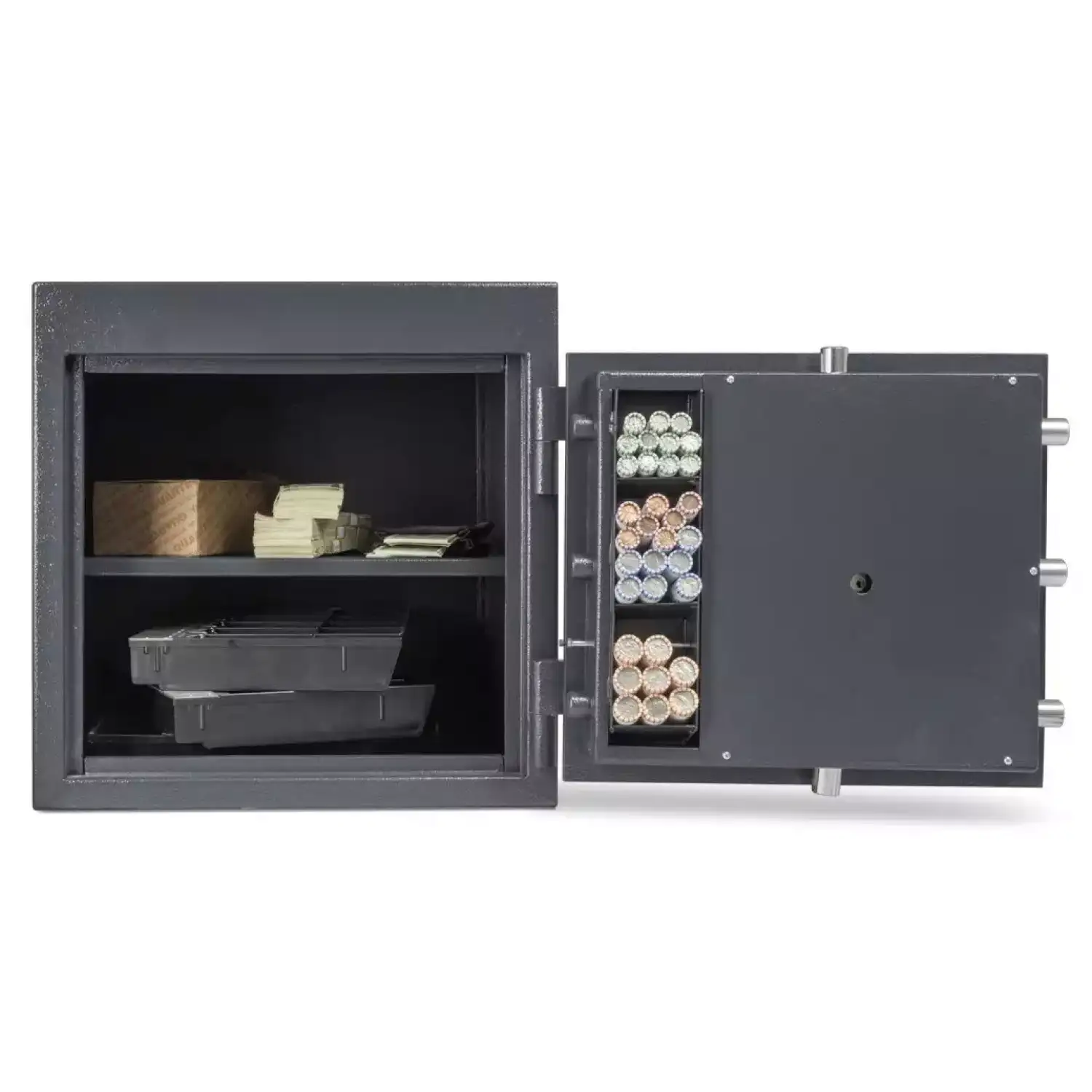 This AMSEC "B" Rate Security Safe also boasts of a 3-way locking mechanism consisting of five massive 1" diameter chromed steel locking bolts (this feature goes a long way to deter physical break-ins). Another great feature of the AMSEC Model BWB2020 Steel Security Container is the bolt detent system that keeps bolts retracted when the door is open and then automatically engages when the door is shut. There is a convenient door-mounted recessed coin rack for commercial applications and a large capacity to store cash trays. The safe is painted in a black textured finish and has one (1) adjustable shelf.