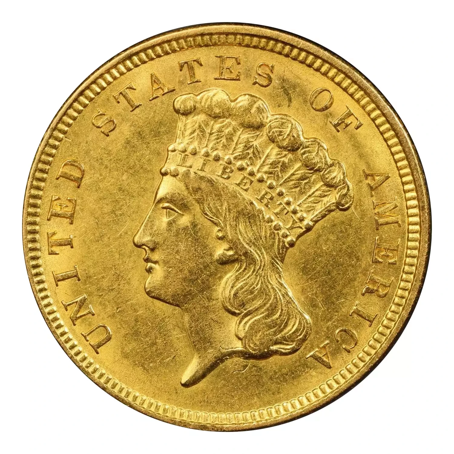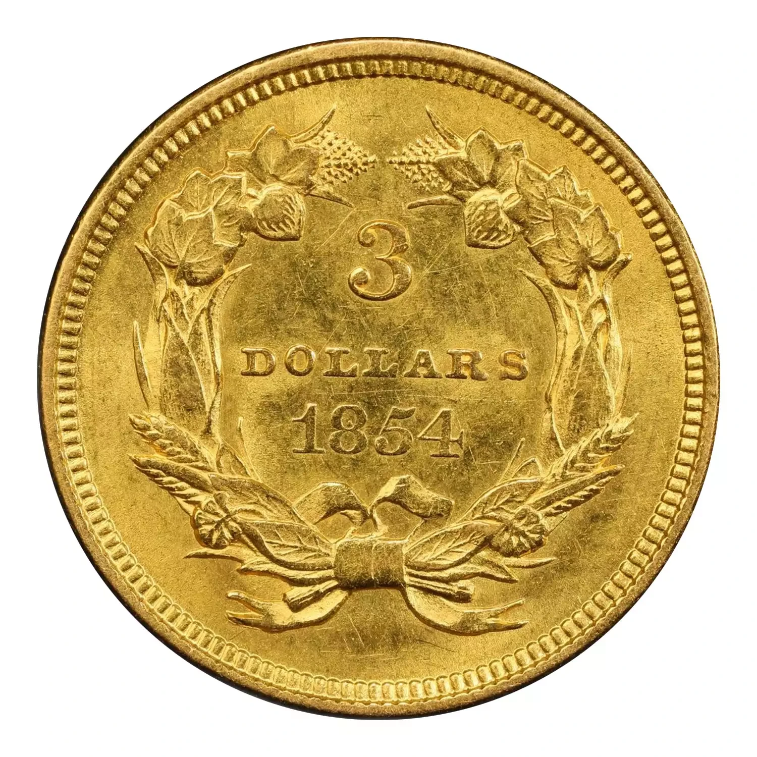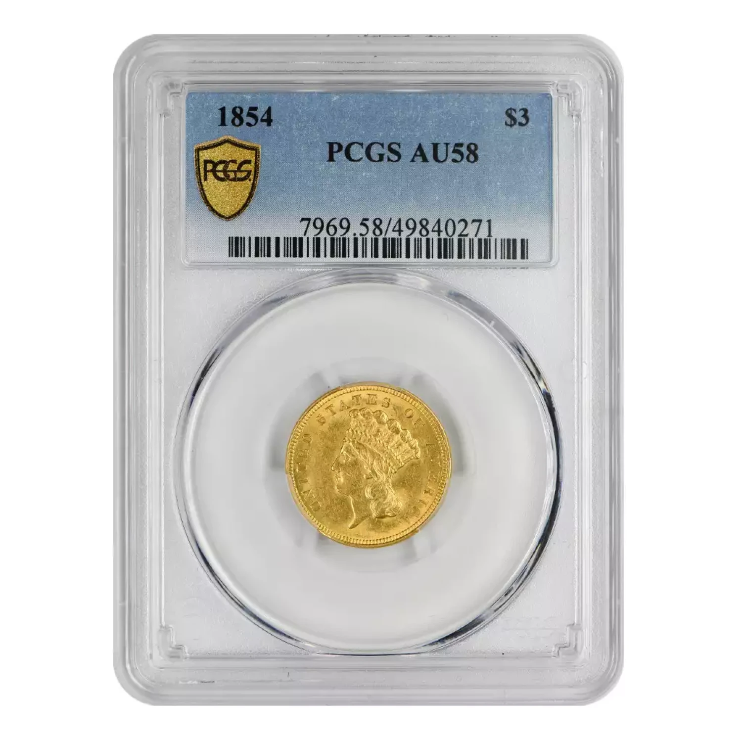 1854 $3 PCGS AU58. A beautiful lightly circulated example of this desirable type. It is apparent this coin only circulated briefly, evidenced by nearly full luster and only minor high point wear. An excellent option for a type set, or date set of three dollar gold pieces.